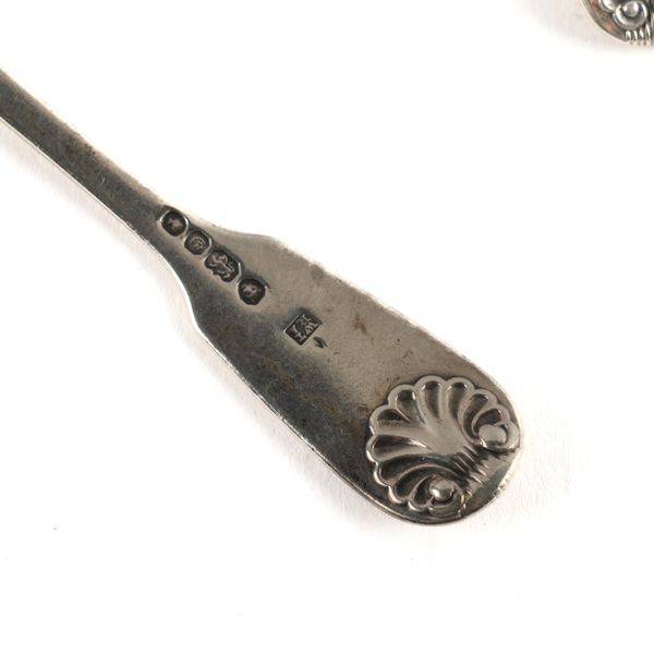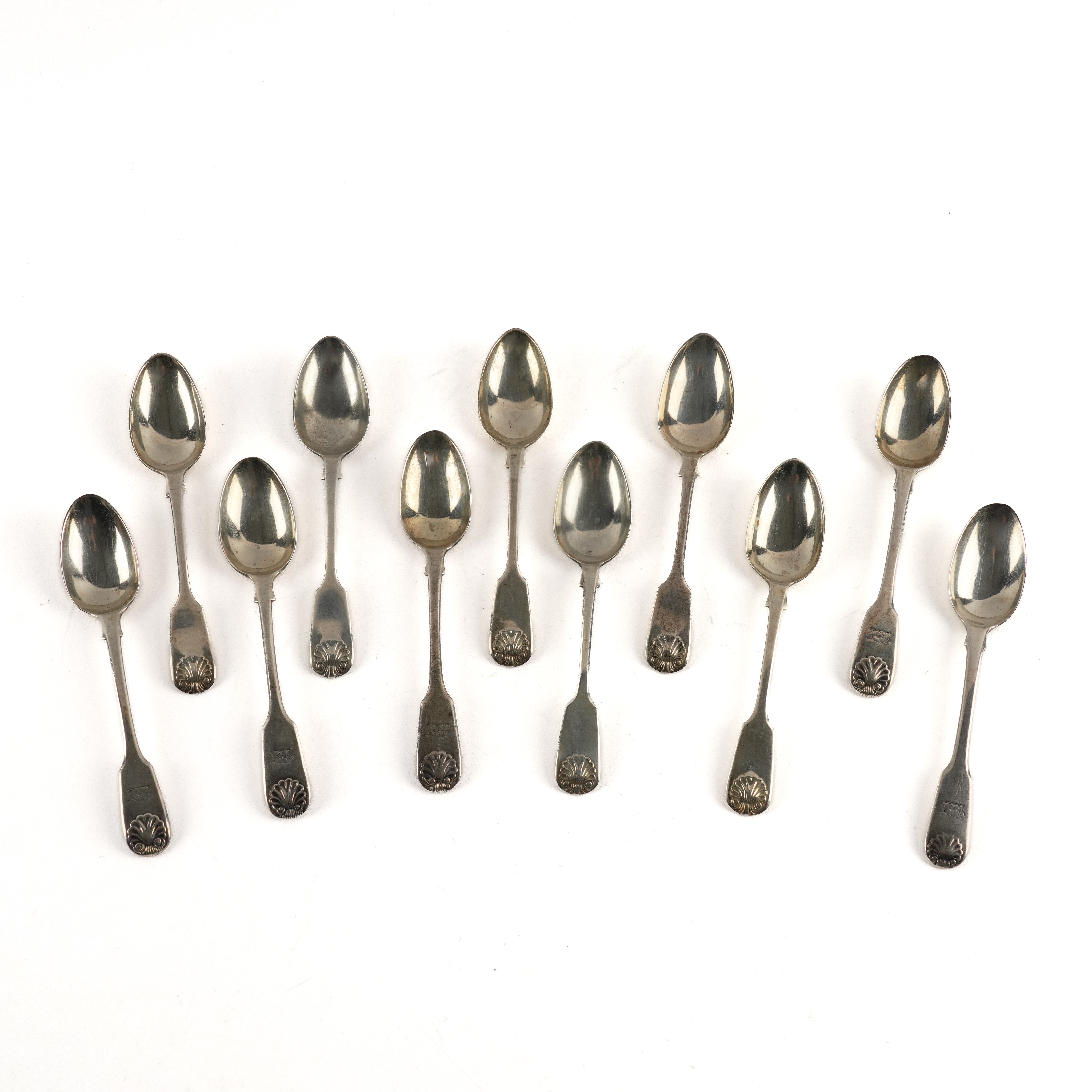 Comprising; six Victorian single struck fiddle and shell pattern teaspoons, Newcastle 1854 and five double struck fiddle and shell pattern teaspoons, crest engraved, mixed 19th century dates, weight 275 grams