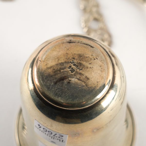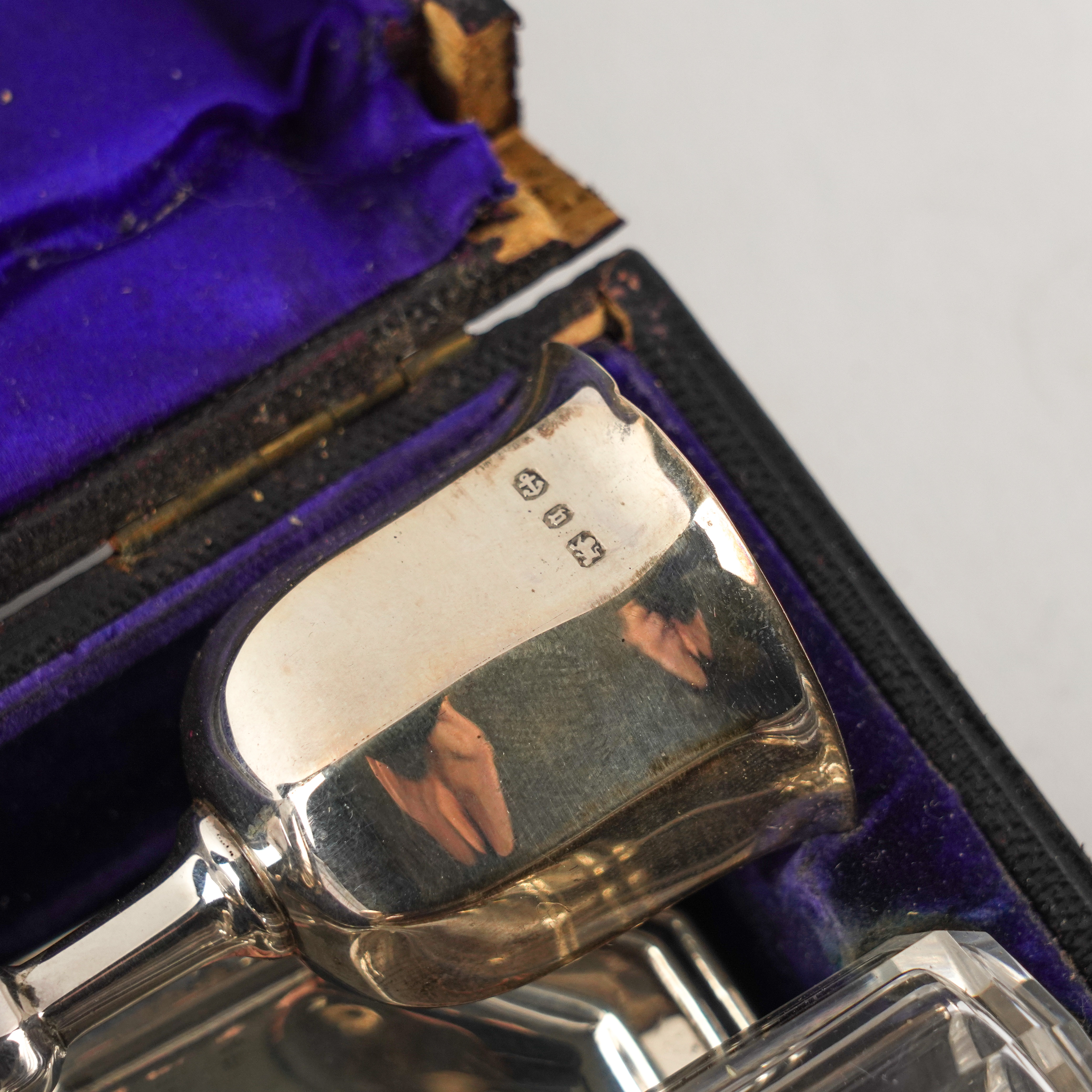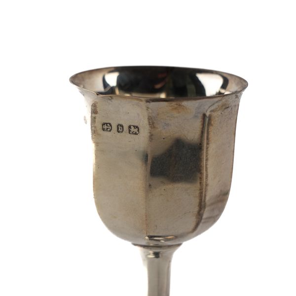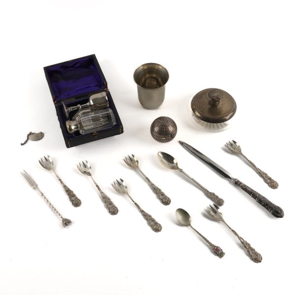 Comprising; a composite silver three piece holy communion set, mixed dates, the octagonal pattern presentation inscribed, a lidded glass powder bowl, a silver handled paper knife, a spherical pomander, unmarked, a beaker detailed Demet 900, a noggin label detailed whiskey, London 1907 and nine items of flatware, combined weight of weighable silver, 87 grams