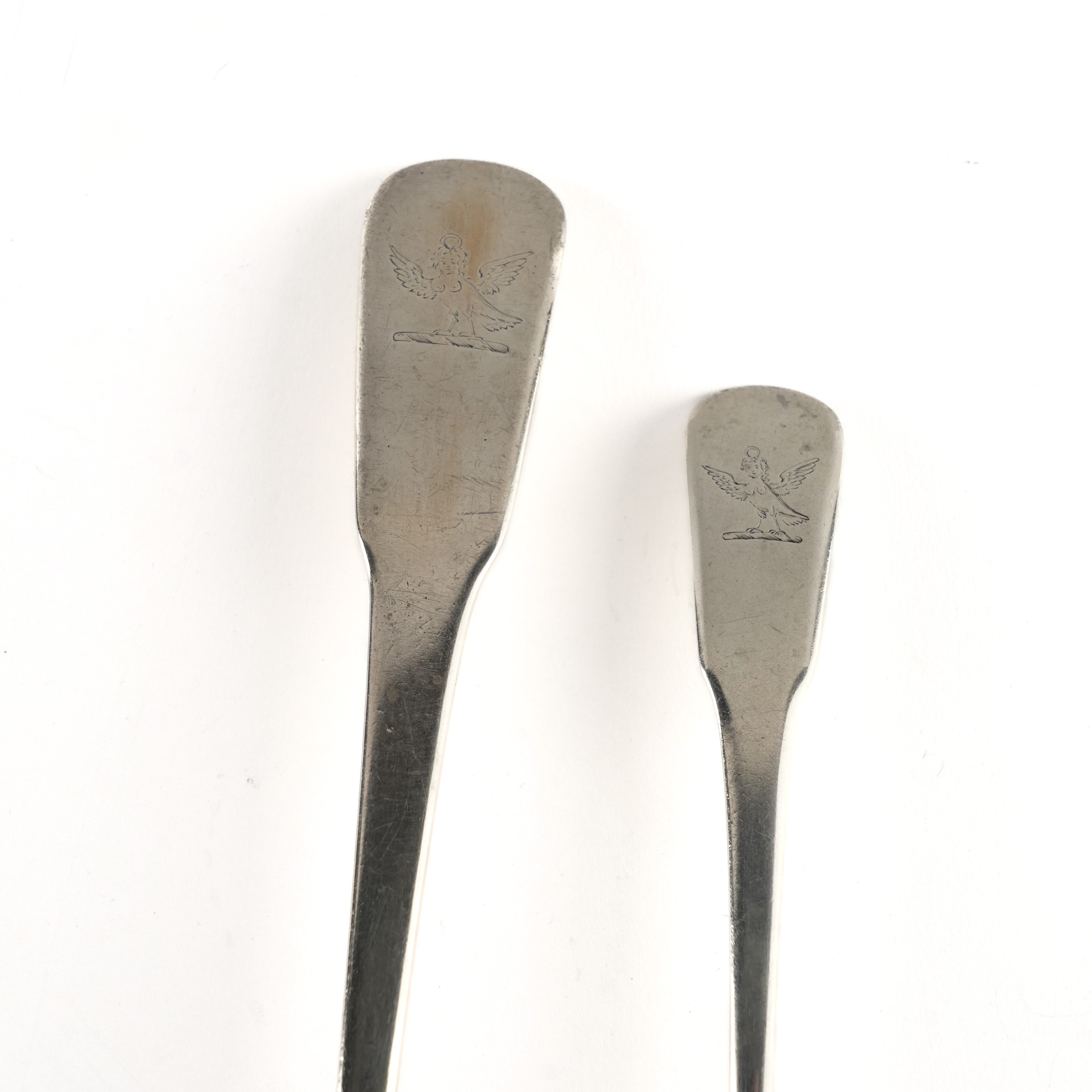 Both fiddle pattern, the basting spoon London 1803, the sauce ladle London 1804, both crest engraved, combined weight 154 grams