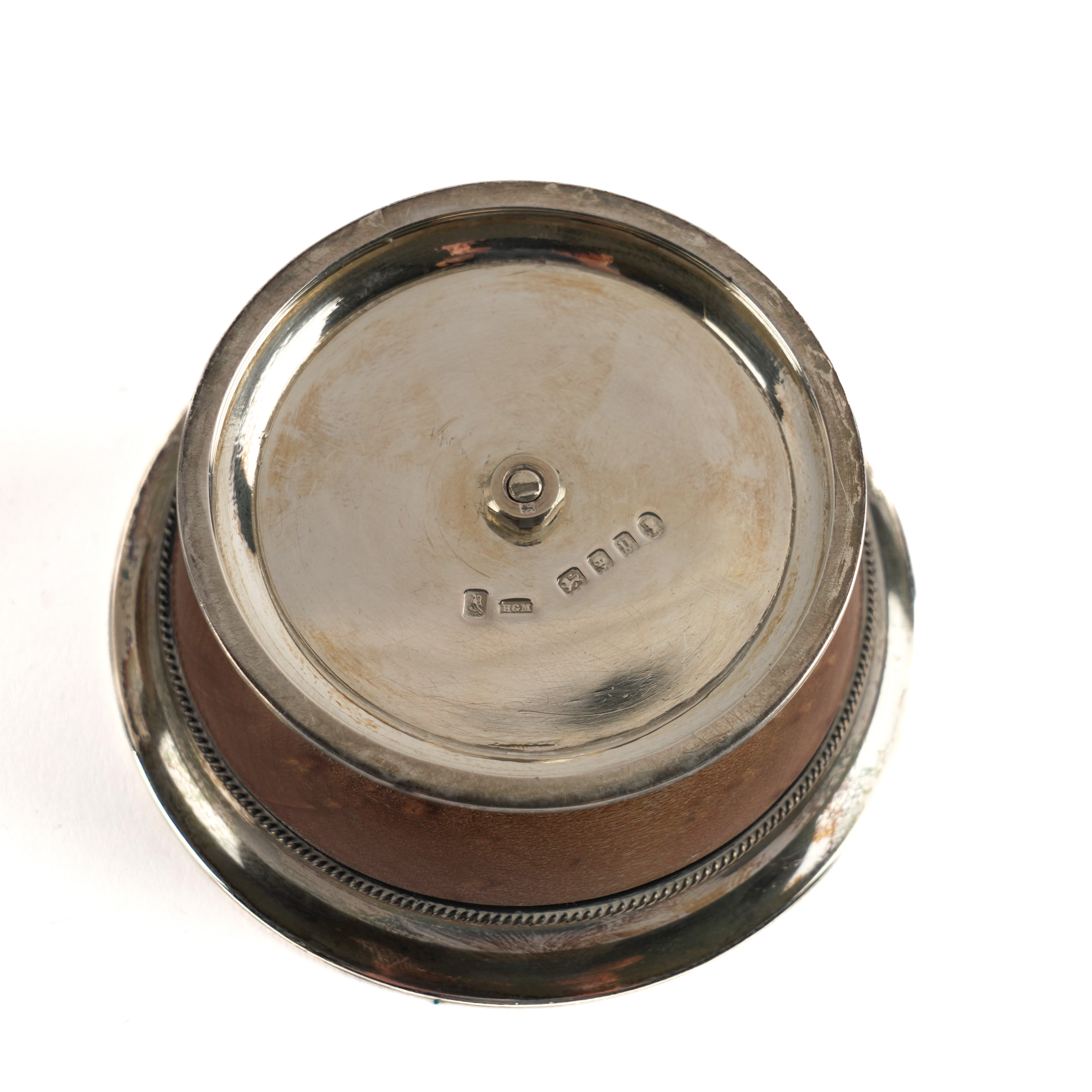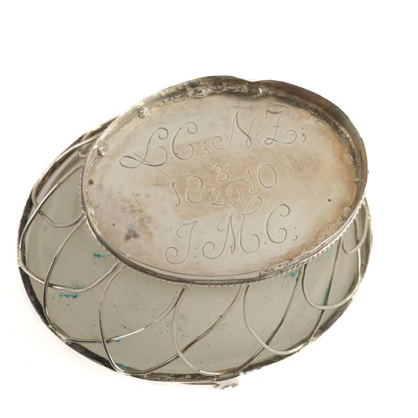 Comprising; a silver mounted treen trinket dish, London 1935, diameter 7.9cm, a cylindrical pepper can, with a scrolling handle, probably London 1800, an oval basket of wirework form, with a swingover handle, detailed underneath with initials and 26/3/1810, with a frosted glass liner, the bowl part of a cast spoon and a French niello decorated snuff box