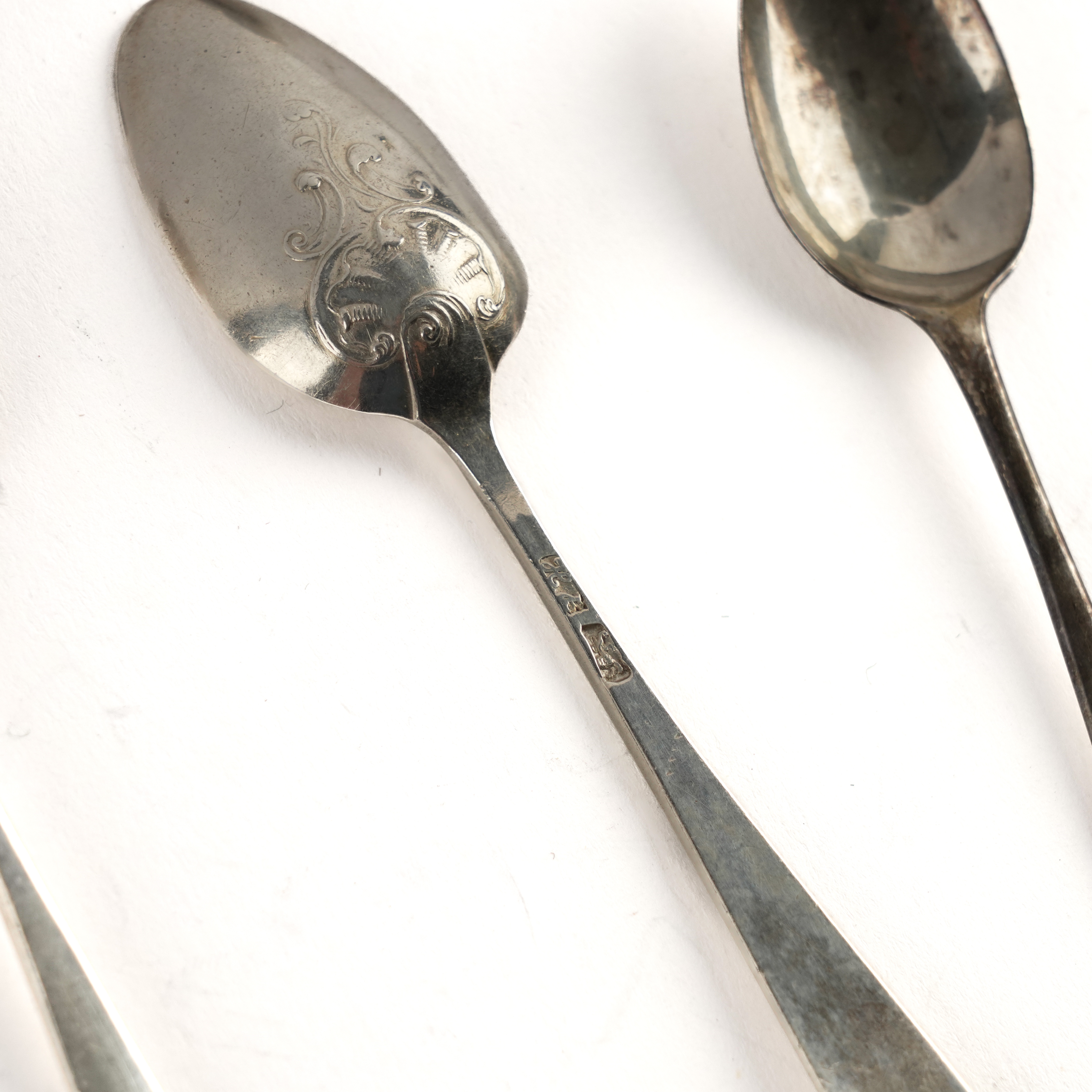 Comprising; a set of six bottom marked examples, having matching crests, hallmarks indistinct, three lace back teaspoons, initial engraved, three bottom marked teaspoons, two teaspoons probably London 1787 and two further teaspoons, combined weight 187 grams