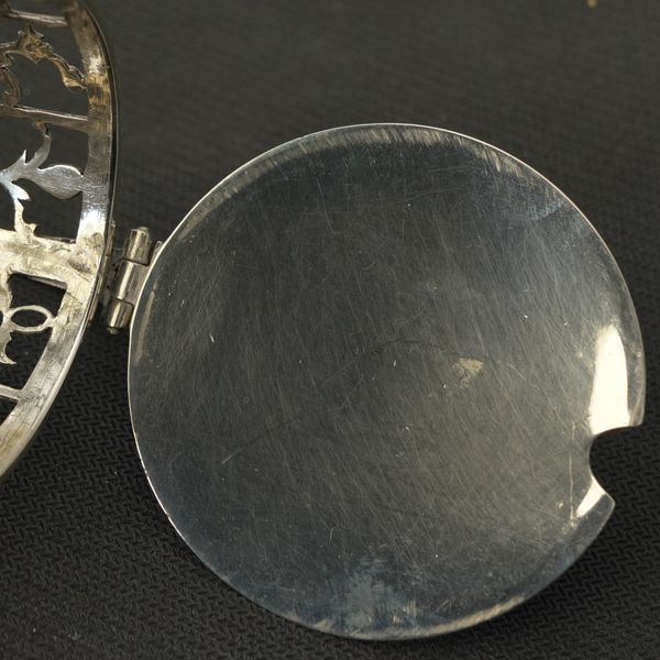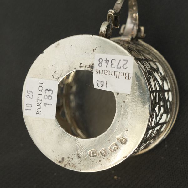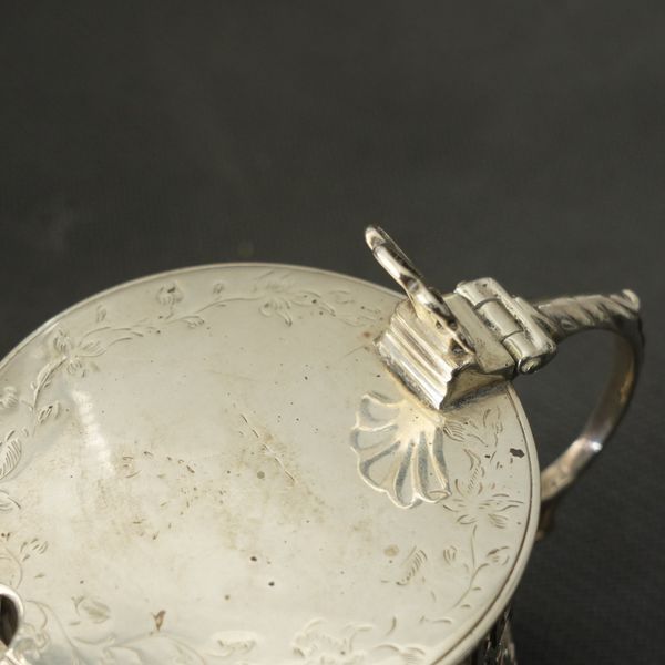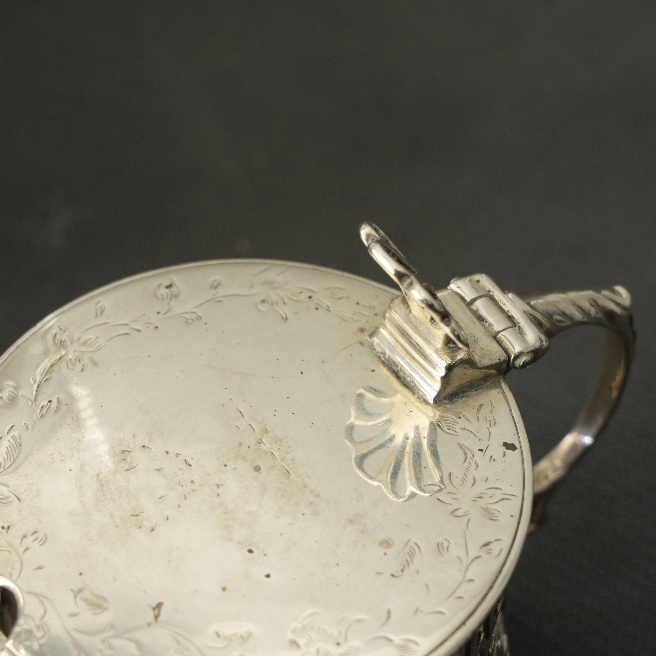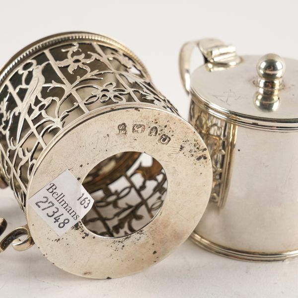 The larger pierced mustard pot; the glass liner lacking, engraved border to the hinged lid may be later, this and the crest are rather rubbed, hallmarks clear. Piercing to thumbpiece is a little irregular and this may be replaced, there is no mark to the lid, which could also be replaced. Slight distortion to the fretwork