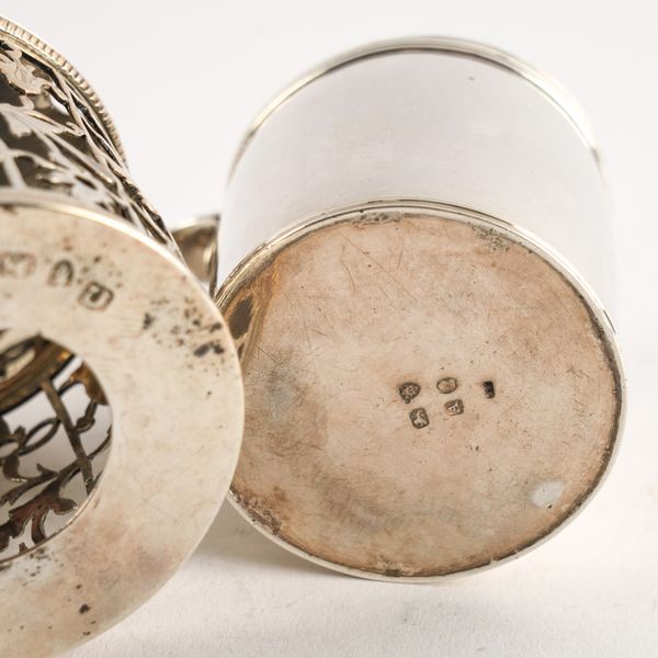 Comprising; the smaller of cylindrical form, crest engraved and with a bead form finial to the hinged lid, London 1796, with a blue glass liner, the larger of cylindrical form, pierced and engraved with birds and floral sprays, with a scrolled handle, London 1768 (the liner lacking), combined weight 214 grams