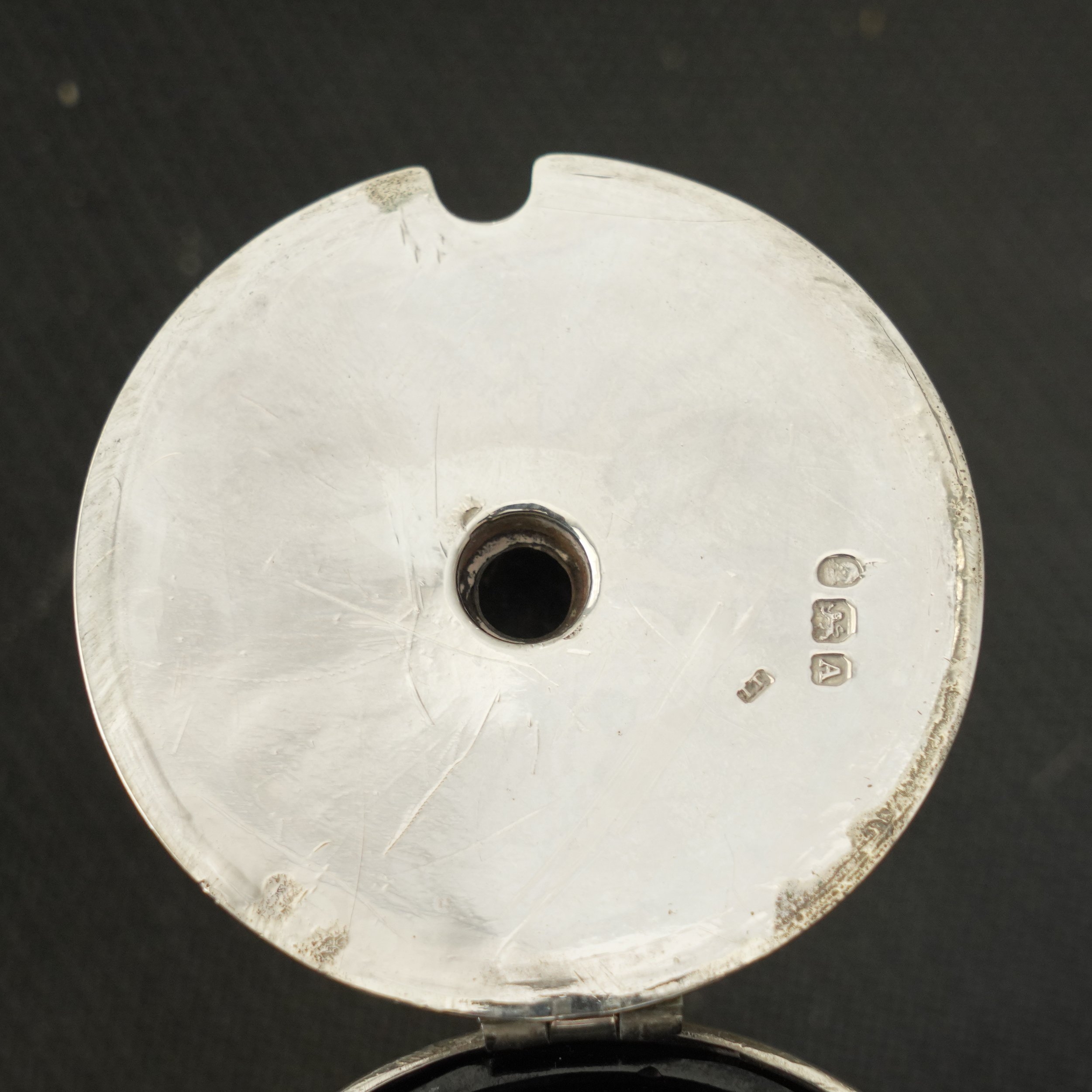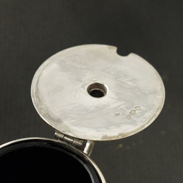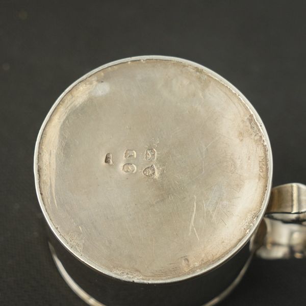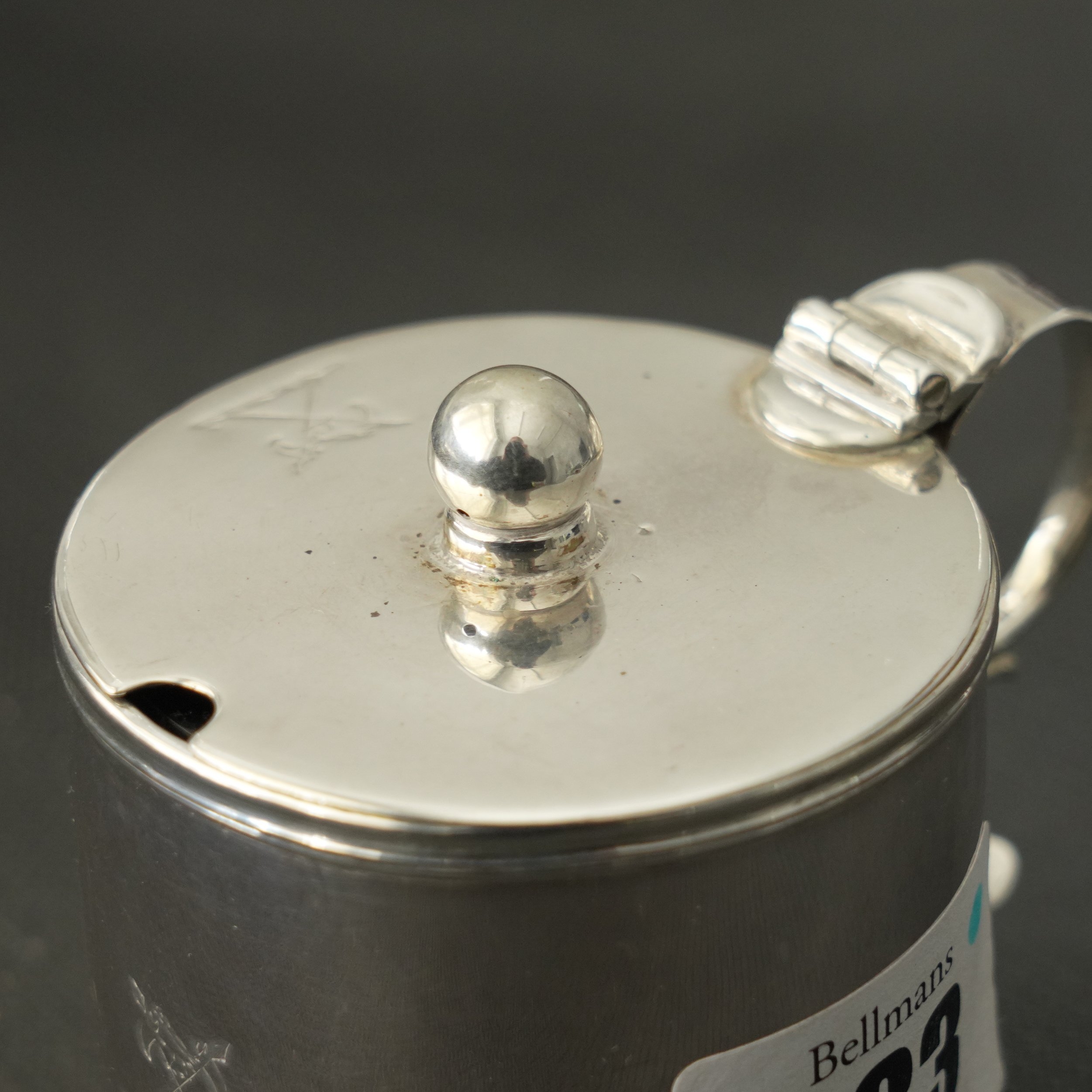 The smaller mustard pot; the finial to the hinged lid looks to be replaced as it is pierced through from the underside, the lid marks lack the crowned leopard's head, otherwise are the same as underneath, crest engraved to the lid and the side of the body, blue glass liner possibly replaced.