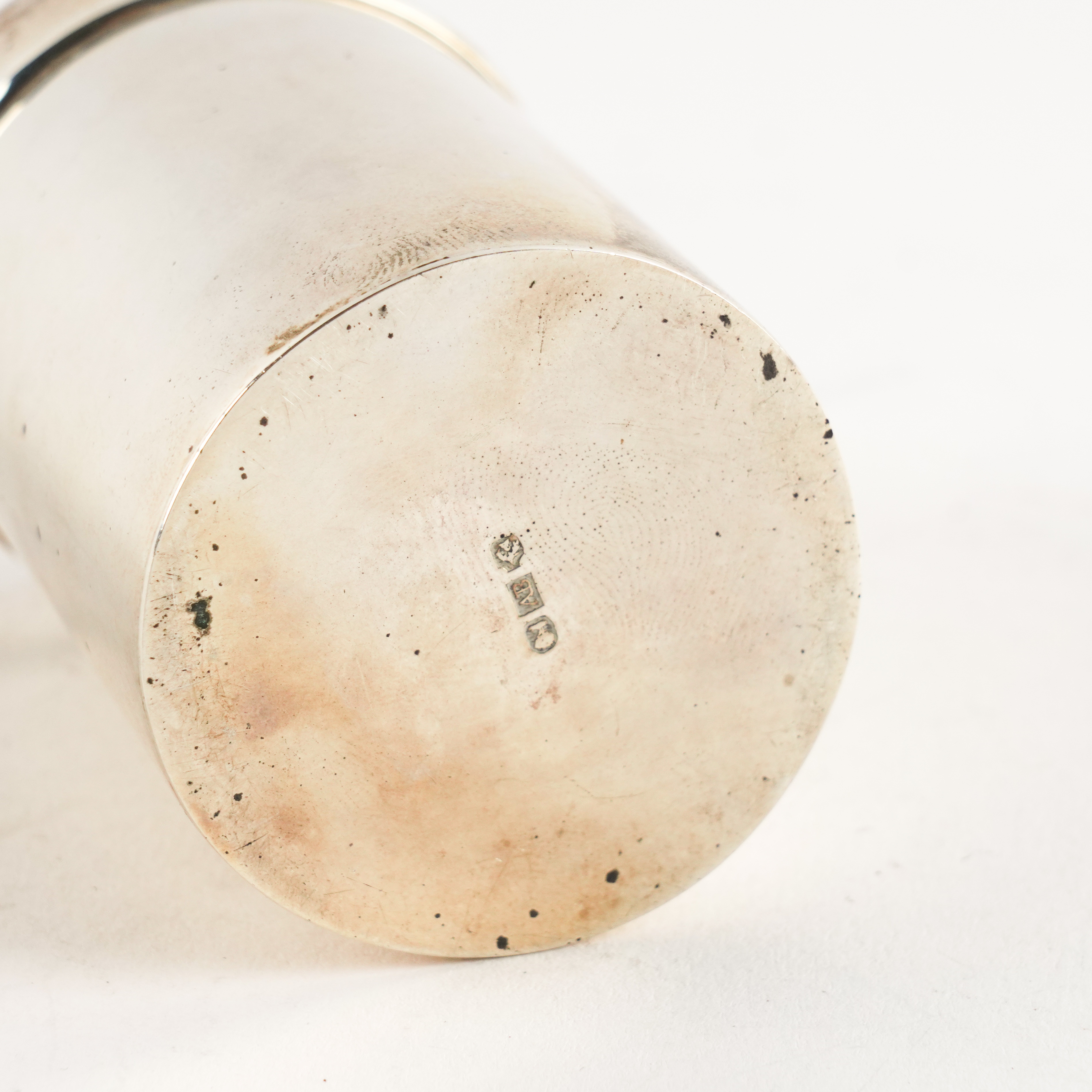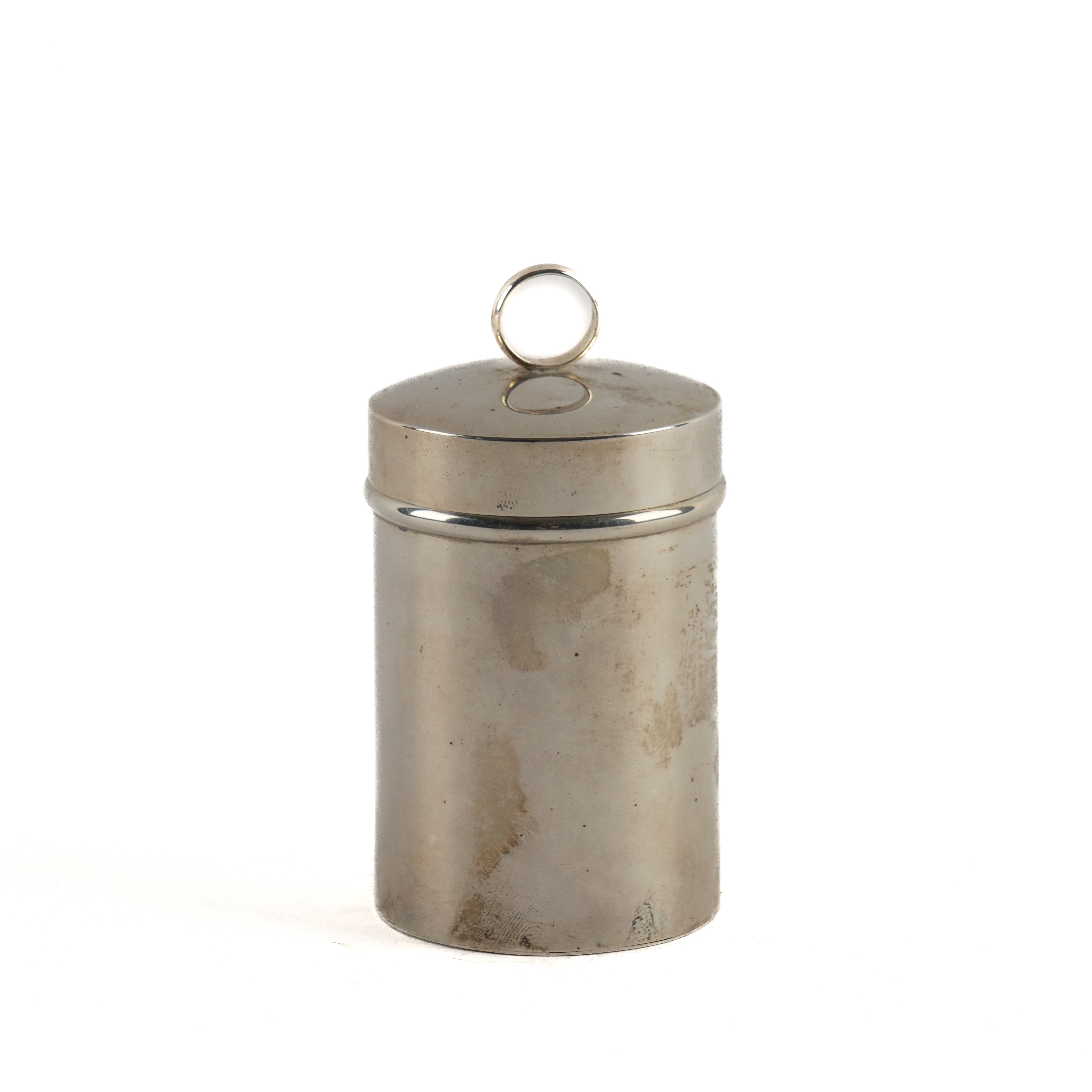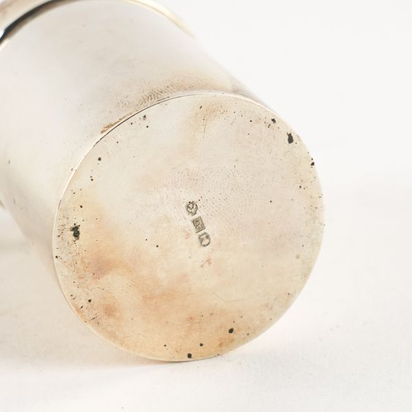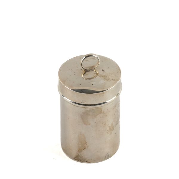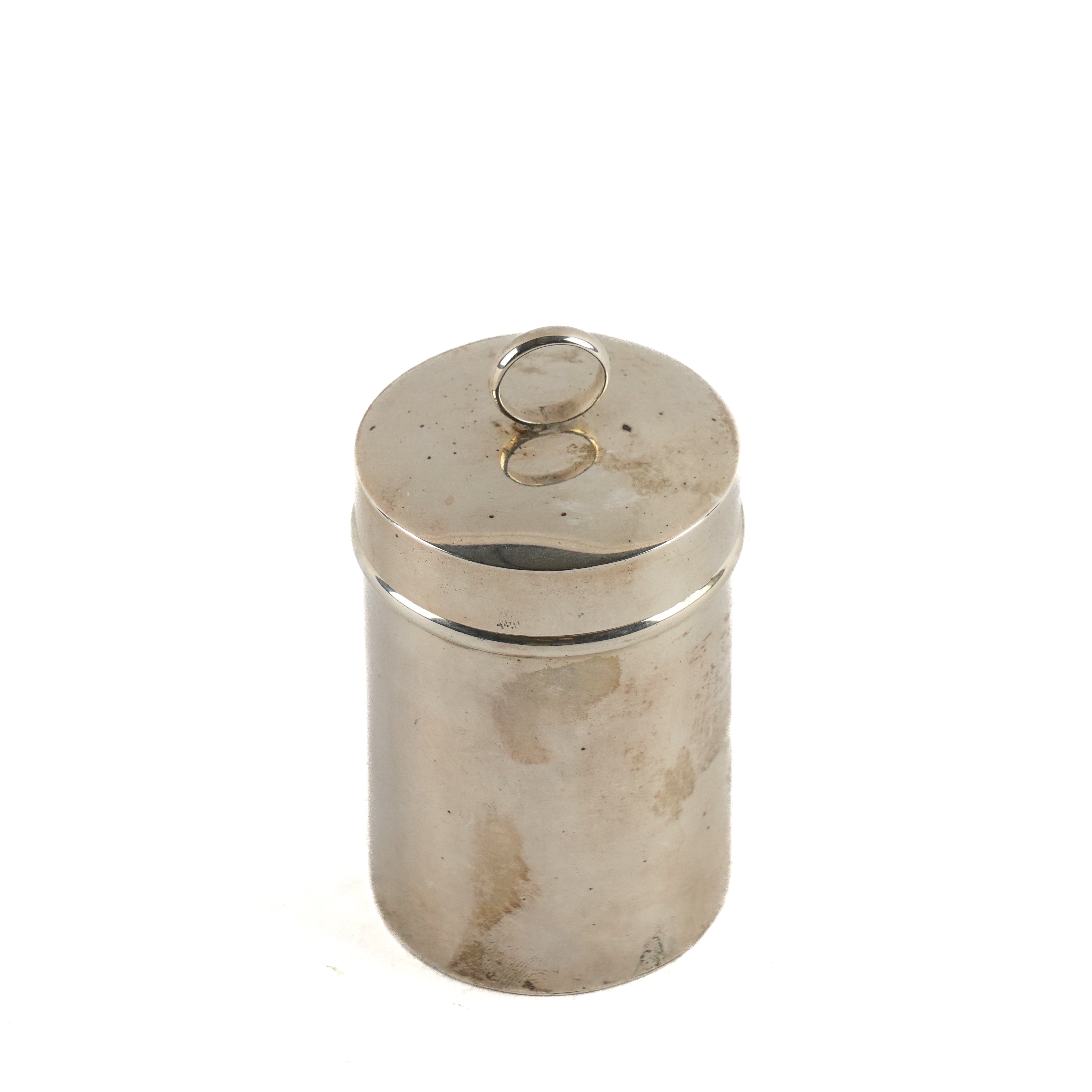 Having a detachable lid, with a loop shaped handle and a cut away section to accommodate a spoon, possibly Provincial Scottish, Greenock, maker's mark A B, height 8.8cm, weight 63 grams