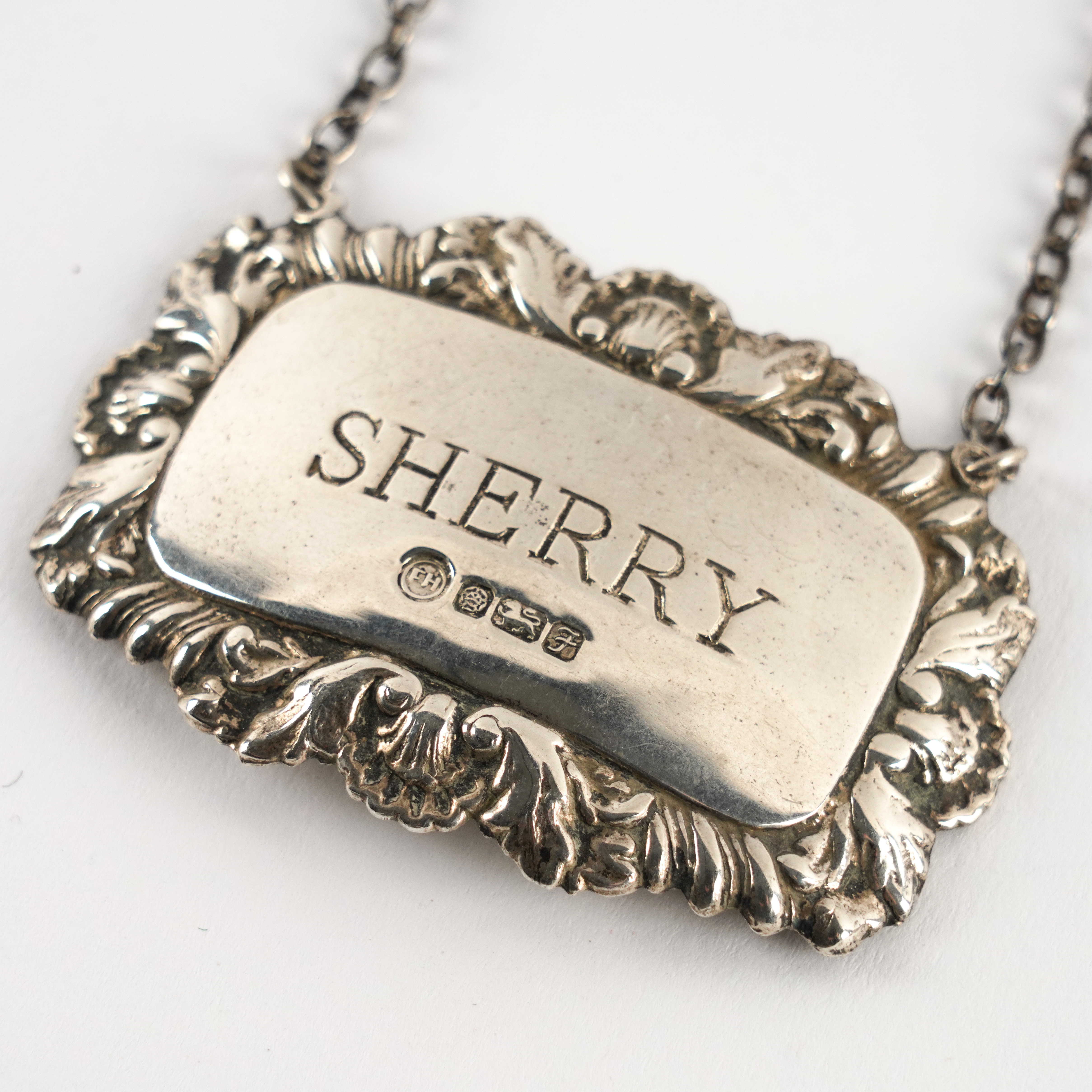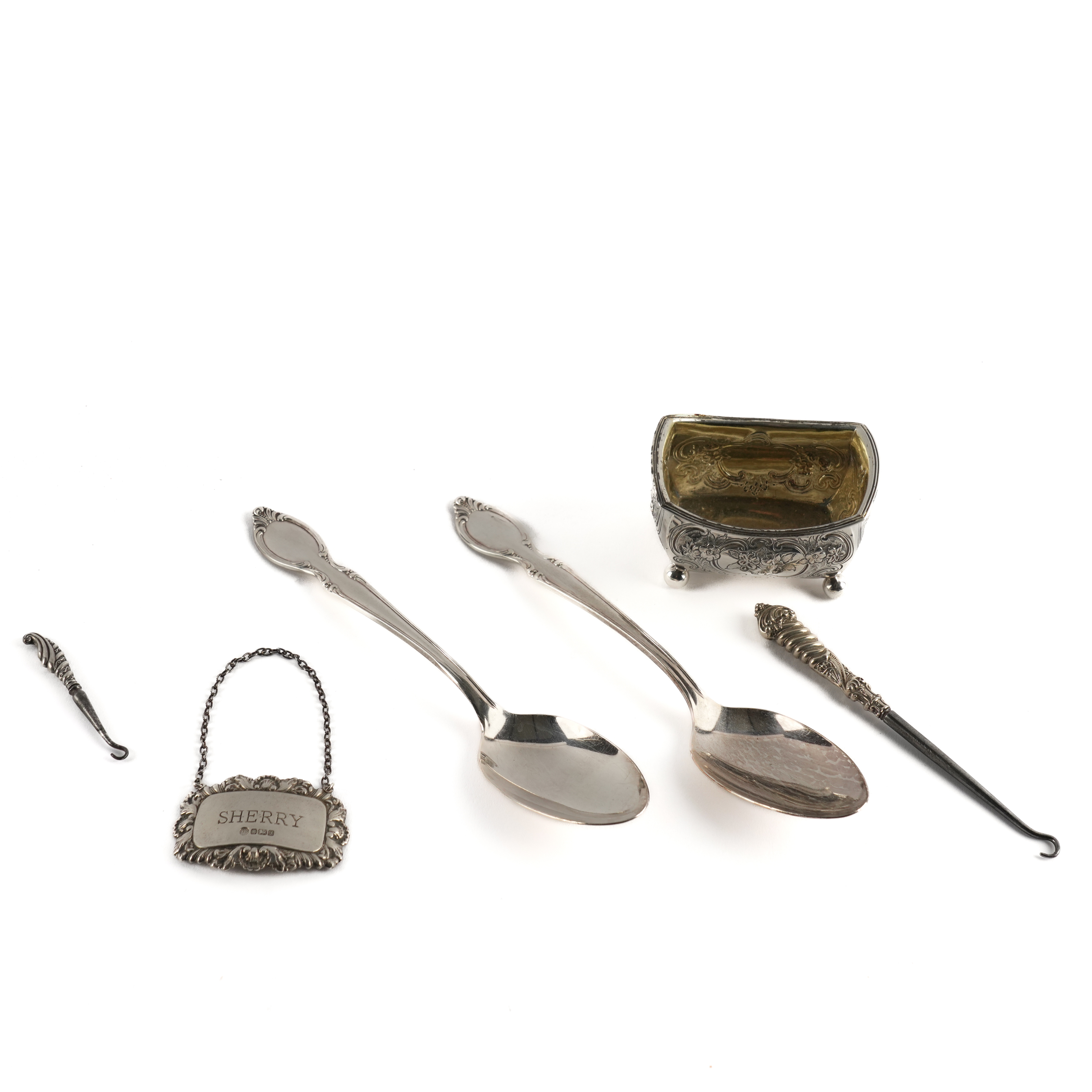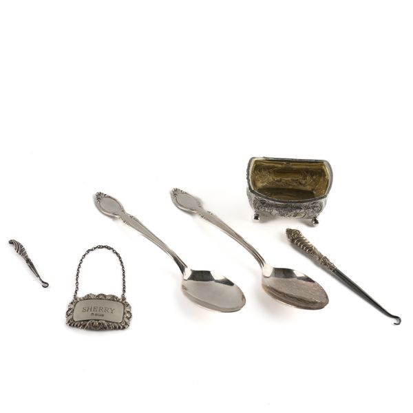Comprising; a George III salt, raised on four spherical feet, probably London 1806, a decanter label detailed Sherry and a salt spoon, combined weight 100 grams, also two silver handled button hooks and a pair of plated tablespoons