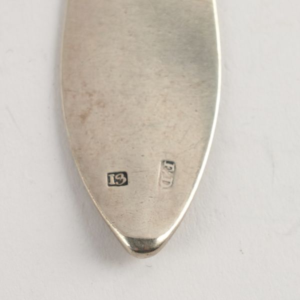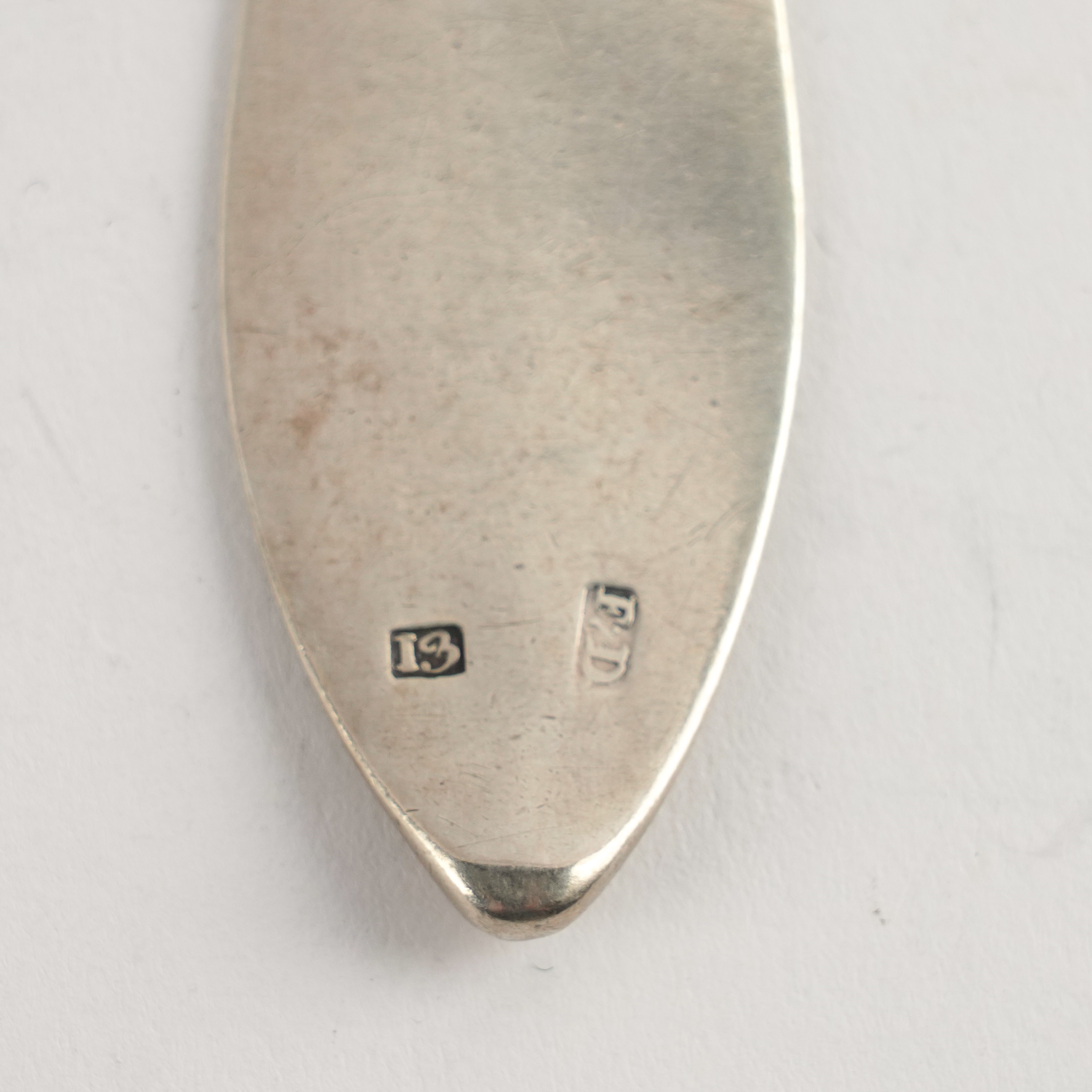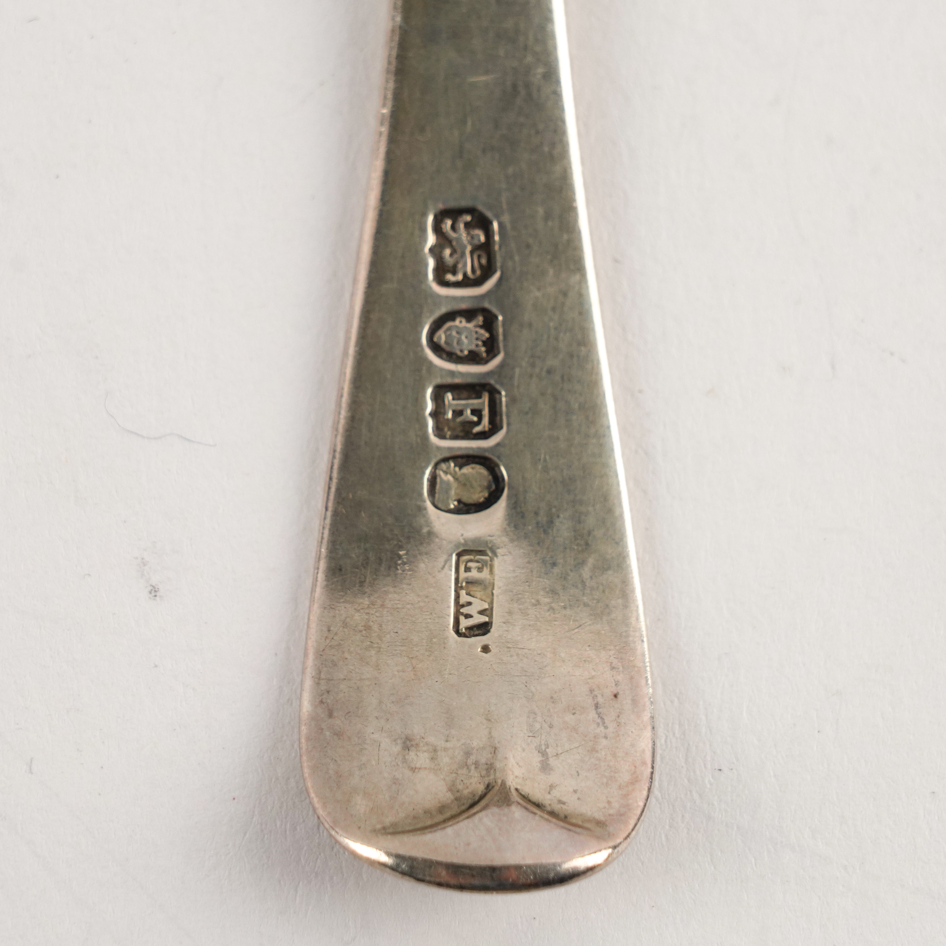 The sauce ladle London 1801, weight 49 grams, the tablespoons with differing marks, one detailed Thomas, weight 163 grams