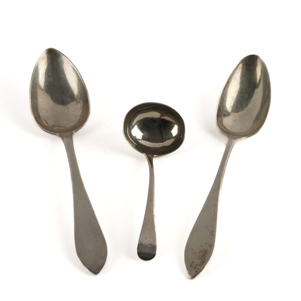 A SILVER OLD ENGLISH PATTERN SAUCE LADLE AND TWO SIMILAR FOREIGN TABLESPOONS (3)