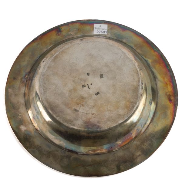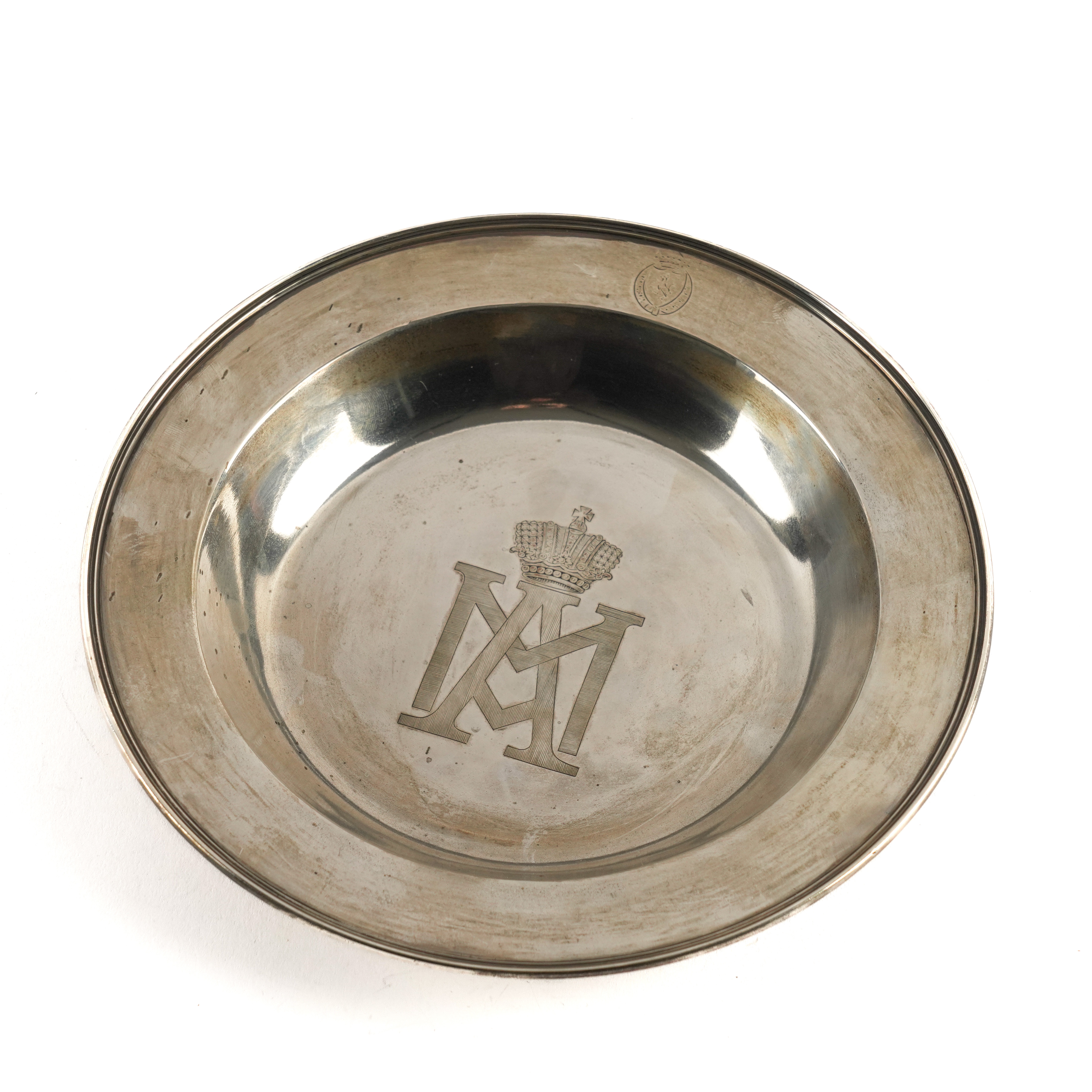 Engraved with a monogram with crown above, possibly that of Grand Duke Alexander Mihailovitch and engraved with crest and motto to the rim, bearing marks for Mikhail Karpinsky, St Petersburg 1836, 84 and also Soviet period markings, 875, diameter 22cm, weight 368 grams