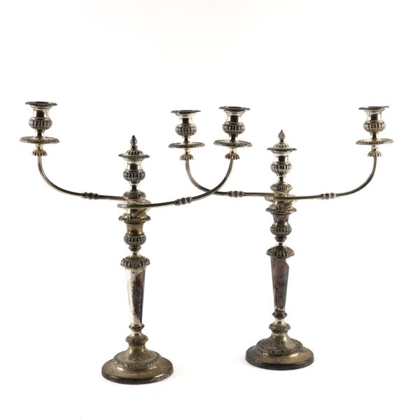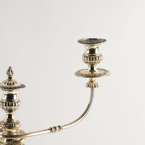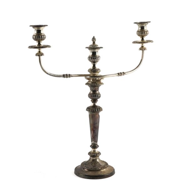 With tapered stems, twistover arms, detachable sconces and central flame finials, height 48.5cm