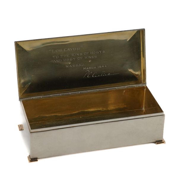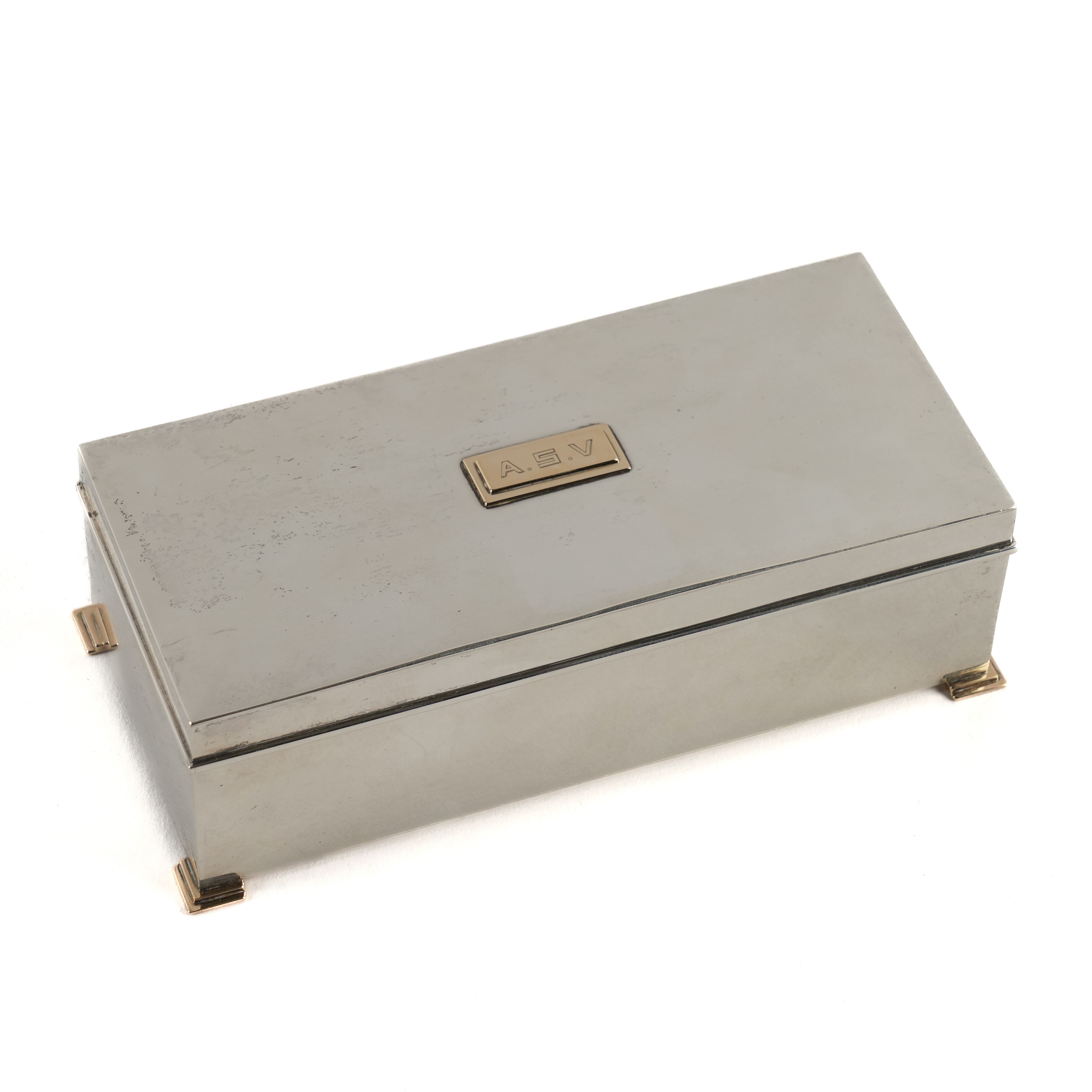 Gilt within, with a presentation inscription and date March 1944, the hinged lid fitted with a gold plaque, initial engraved, raised on four gold corner feet, detailed 14 K AND STERLING CARTIER, size excluding feet 17cm x 7.7cm x 5cm, weight 436 grams