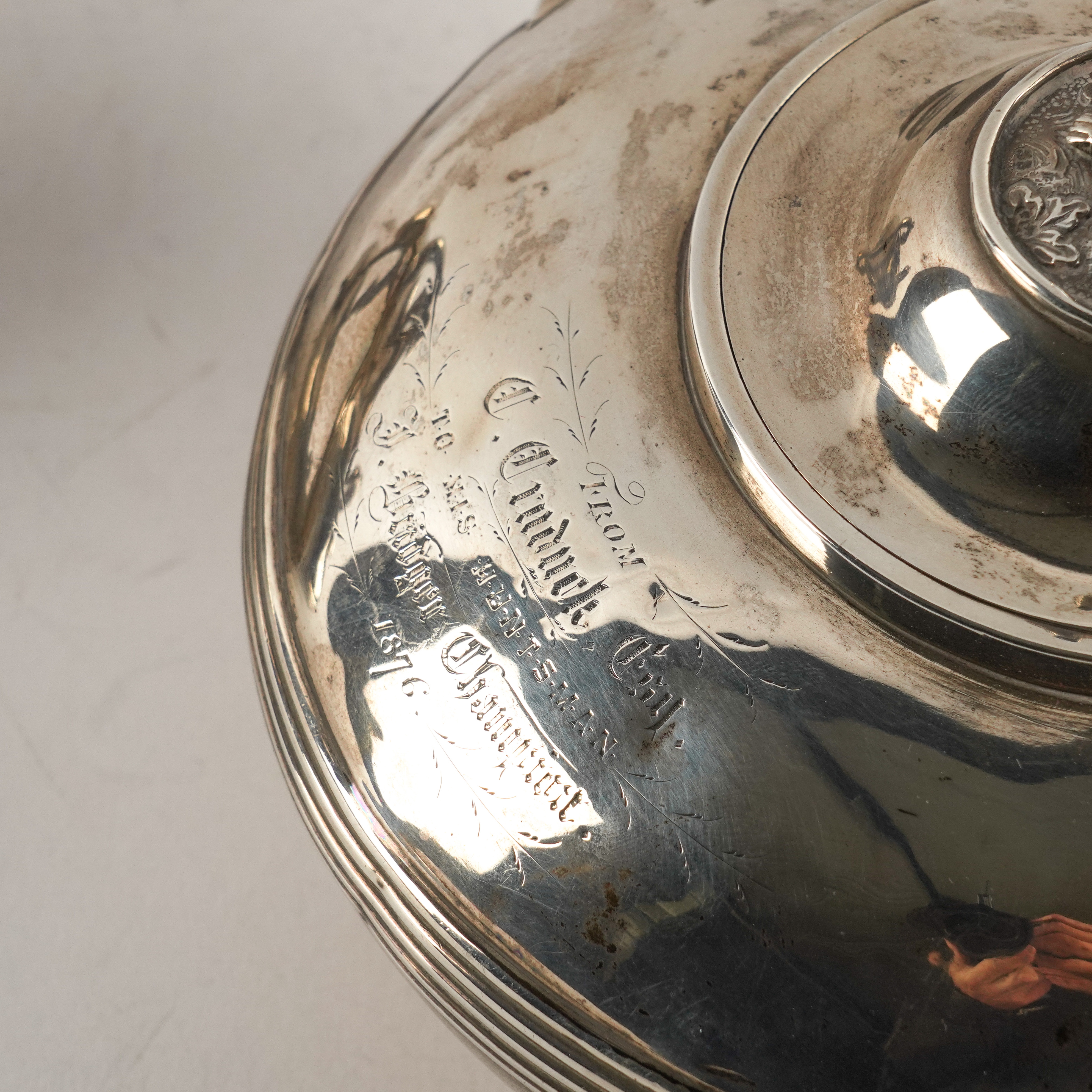 Comprising; a teapot, a twin handled sugar bowl and a milk jug, each piece of compressed circular form, decorated with reeded bands, the teapot having a fox finial to the hinged lid and with ivory insulators to the handle, the teapot, London 1876, the sugar bowl and the milk jug London 1875, maker Goldsmiths Alliance Ltd, combined gross weight 1306 grams, each presentation inscribed from C Cradock Esq, To his huntsman J.Bridger Champion 1876