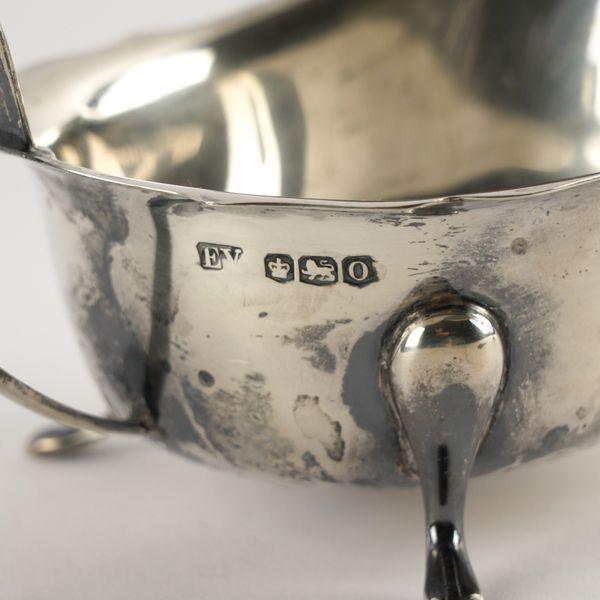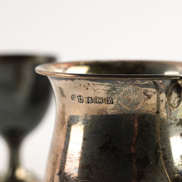 Comprising; a christening mug, of baluster form, Birmingham 1924, cased, a sauceboat, raised on three feet, Sheffield 1931, a decanter label detailed Port, Sheffield 1974, weight 164 grams and a blue enamelled shaped circular powder box, fitted with a mirror within, also a French christening egg cup and spoon