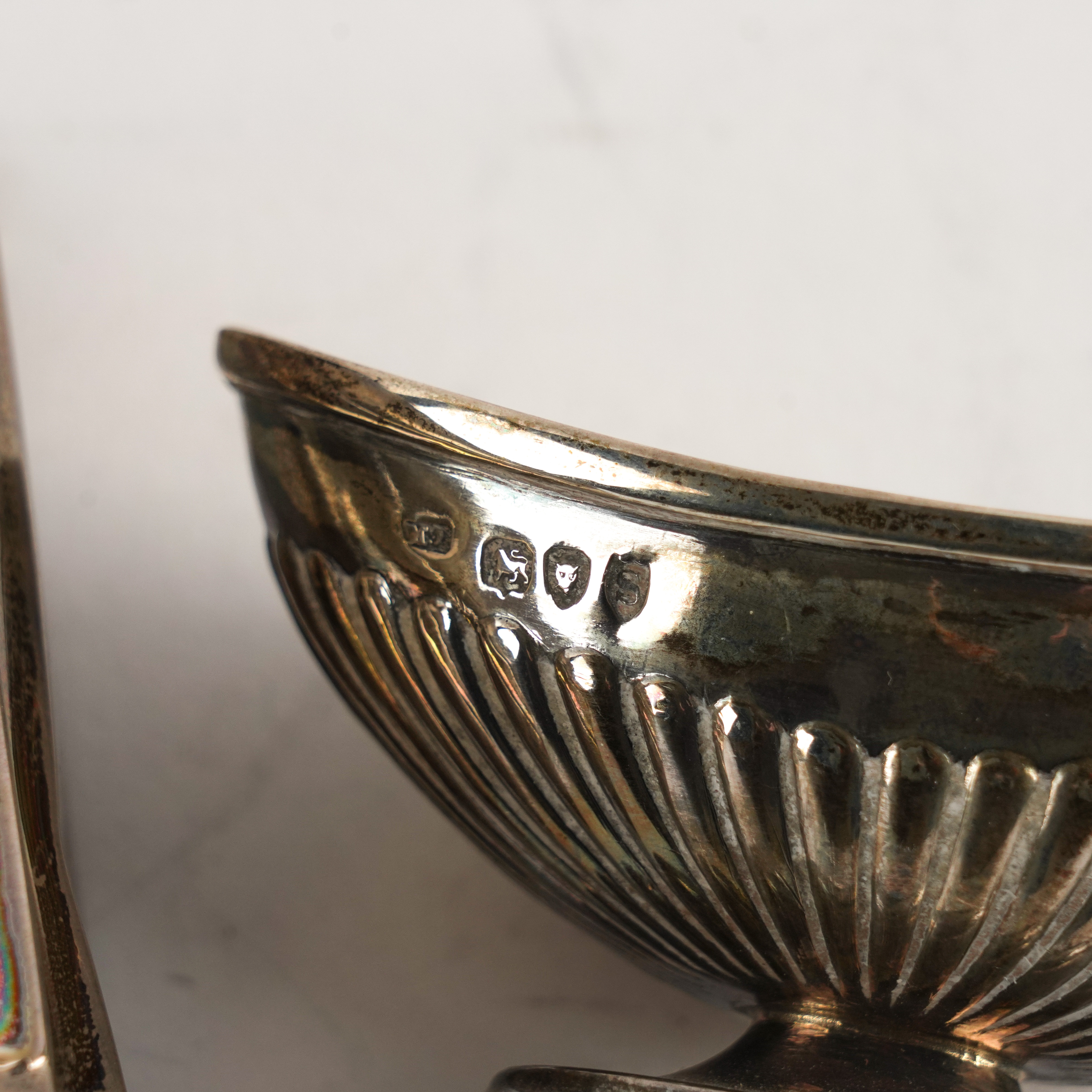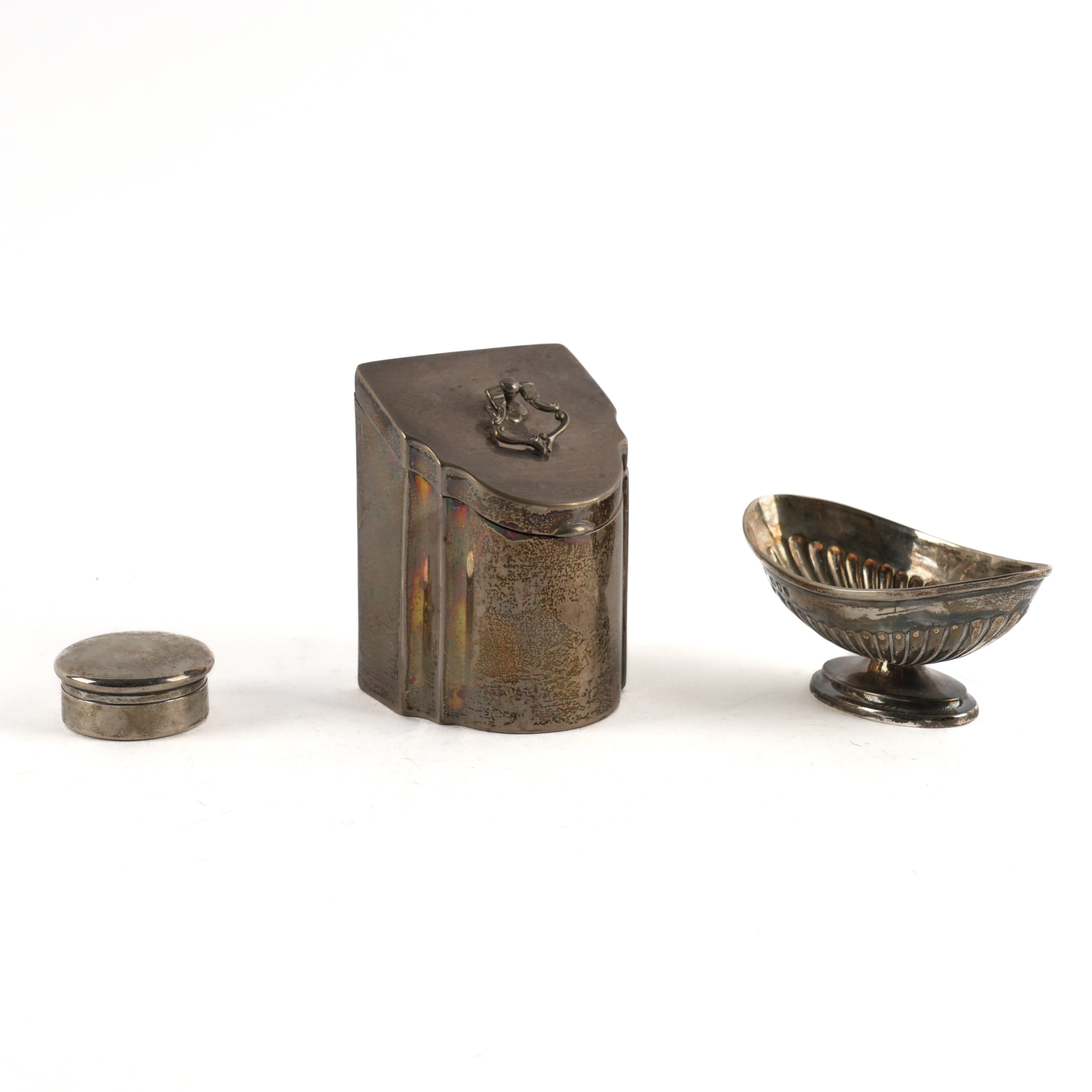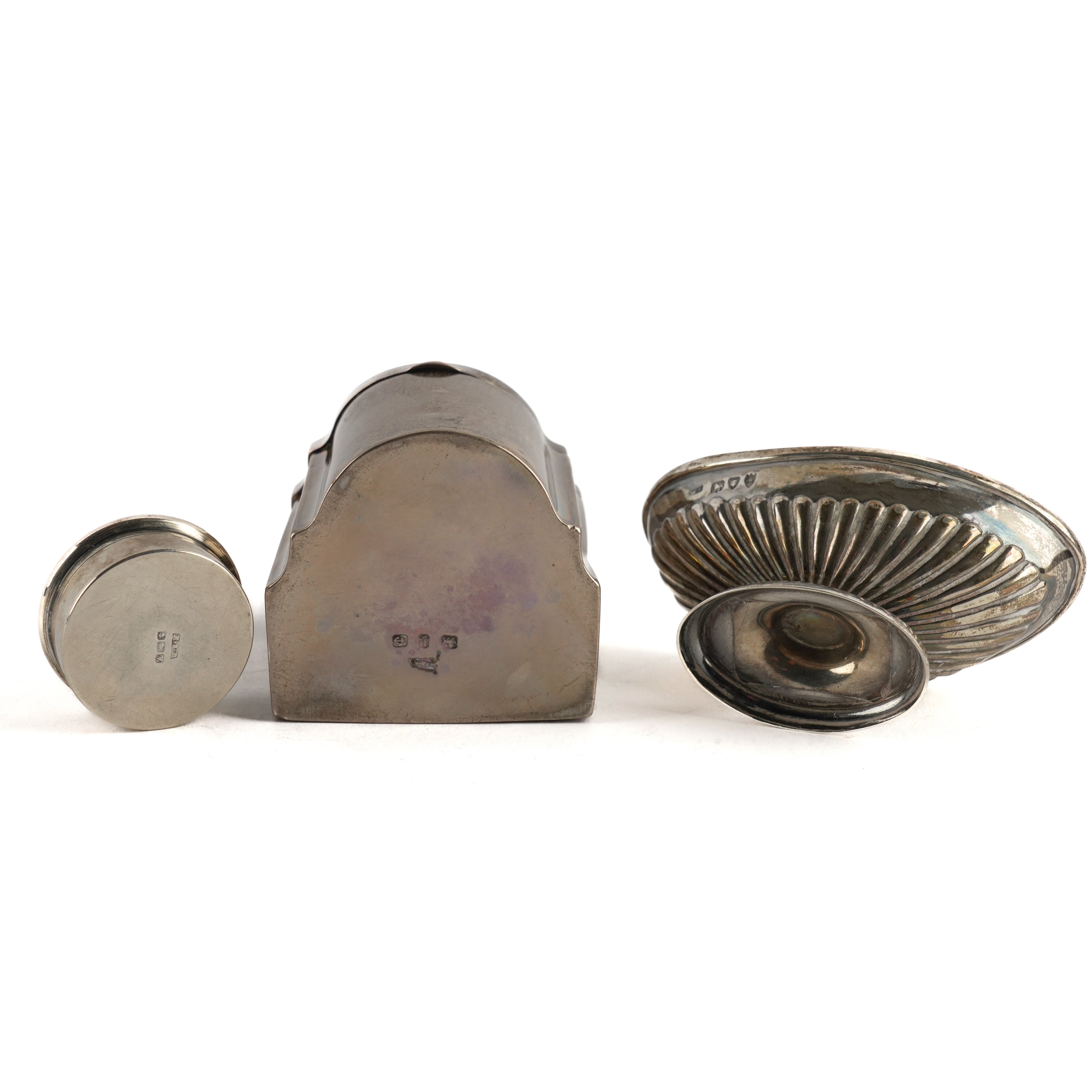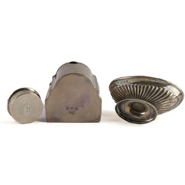 Comprising; a late Victorian tea caddy designed as a miniature knife box, height 8.7cm, Birmingham 1898, an oval salt, with partly fluted decoration, London 1893 and a circular pill box, Birmingham 1920, diameter 3.9cm, combined weight 226 grams