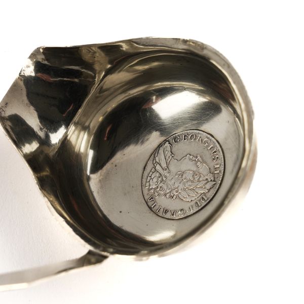 The small toastrack with a loop shaped handle, raised on four spherical feet, Birmingham 1925, weight 33 grams the pair of toddy ladles, London 1801, each crest and motto engraved, with twisted whalebone handles, sample length 17.5cm, the larger toddy ladle mounted with a George II shilling, 1758 to the bowl, length 35cm