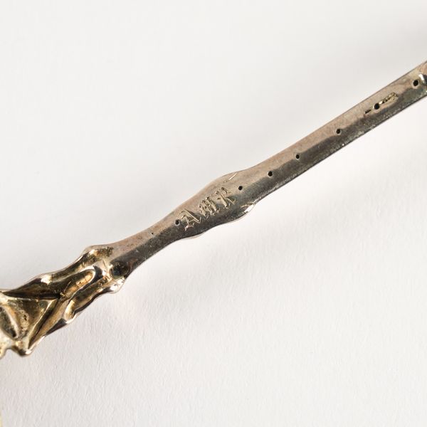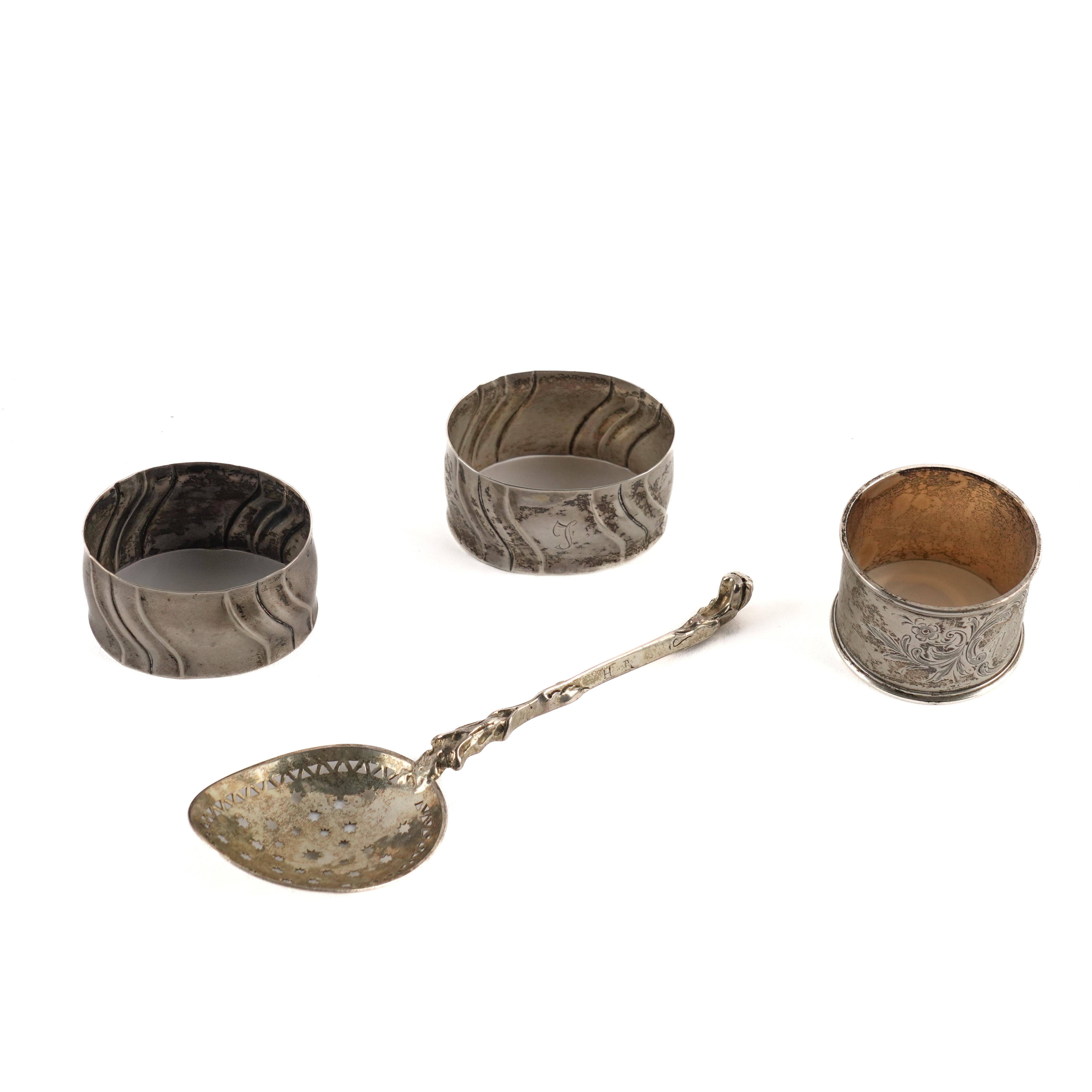 Comprising; a sifting spoon, initlal engraved, the bowl pierced with stars, length 15.5cm, indistinct marks, a pair of German napkin rings, detailed 800 and another napkin ring, detailed Erik, combined weight 116 grams