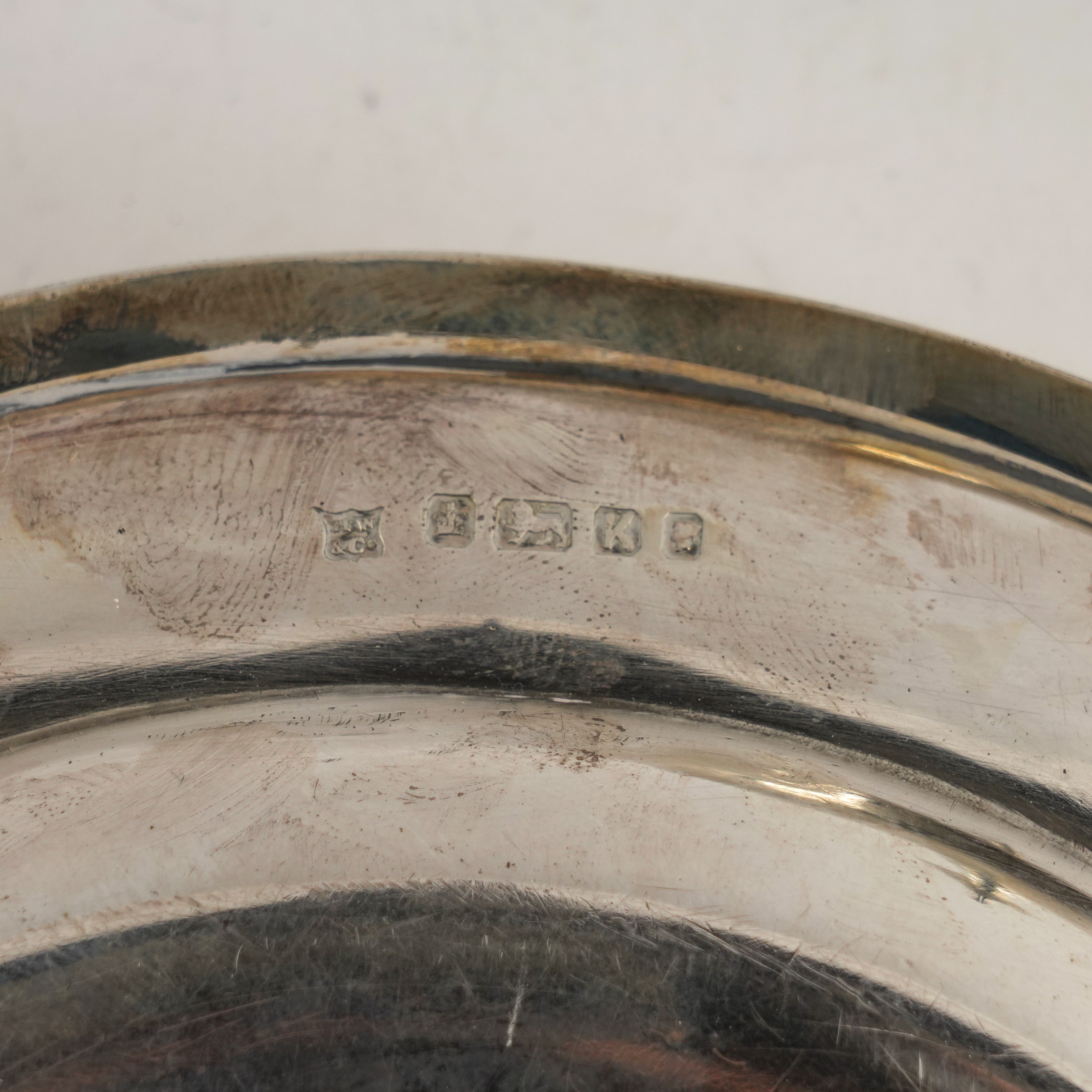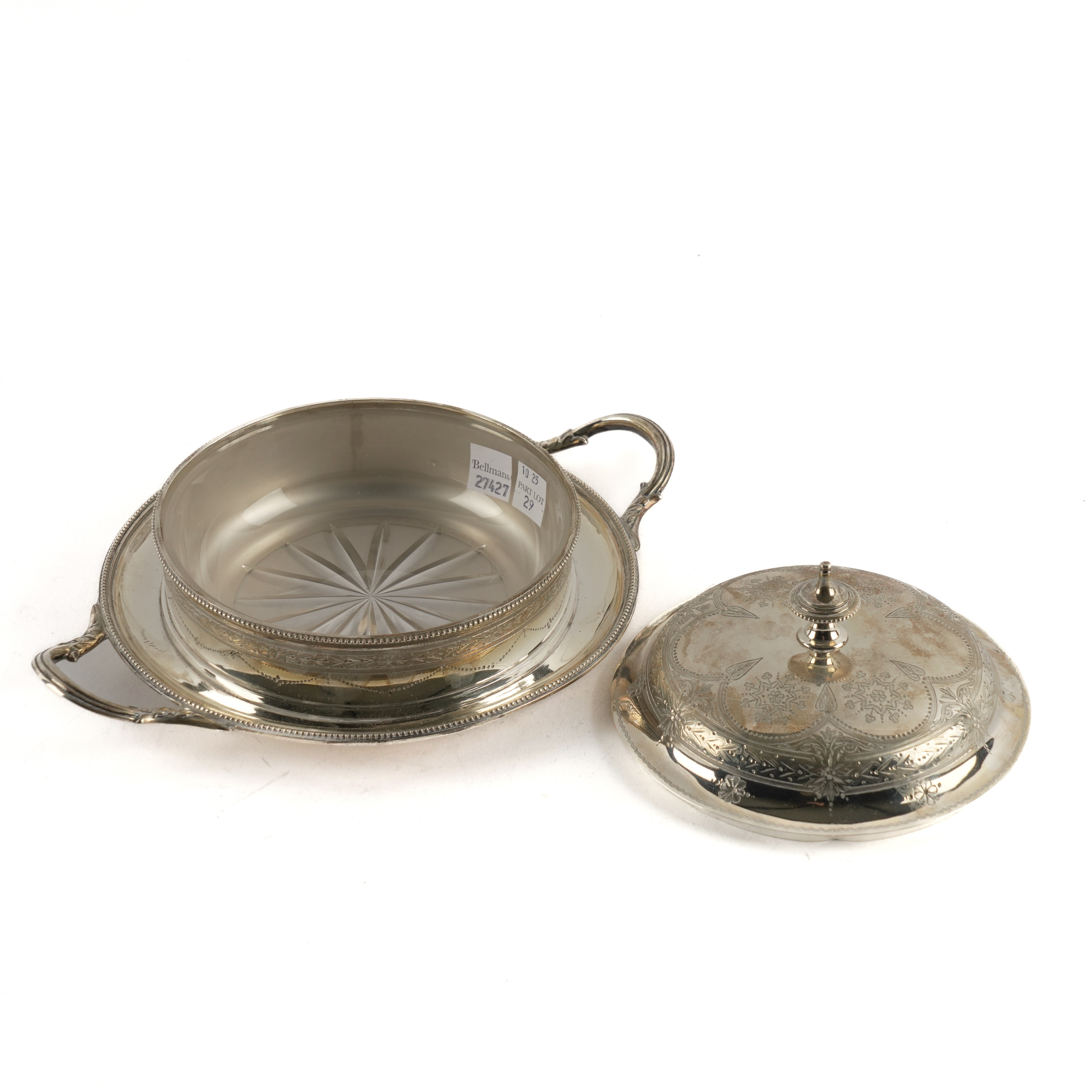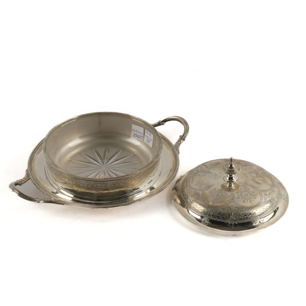 The base decorated with an engraved band within beaded rims, the cover with engraved decoration and with a beaded finial, width including handles 23.7cm, weight 379 grams, Sheffield 1877, with a frosted and star cut glass liner