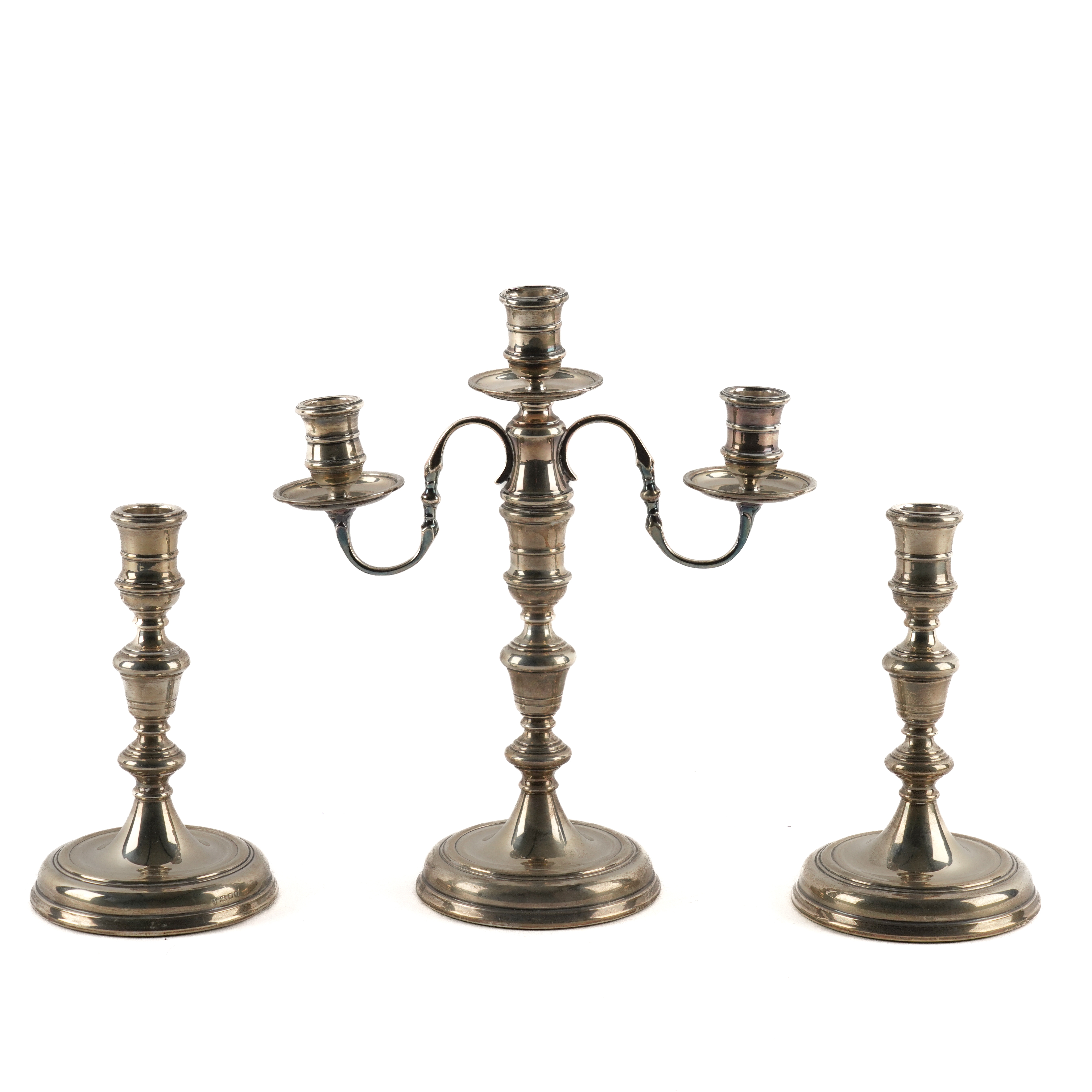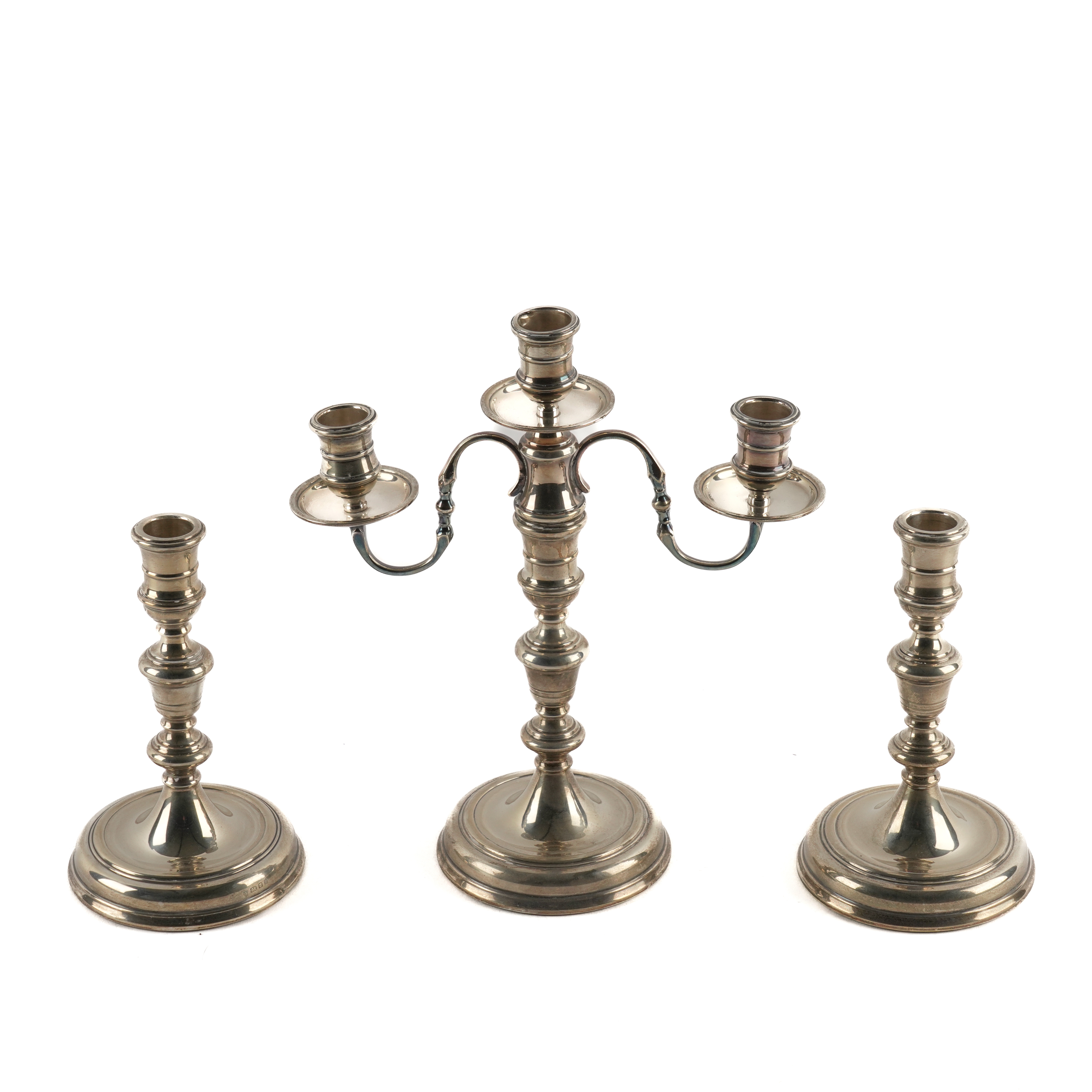 A SILVER THREE LIGHT TABLE CANDELABRA WITH A MATCHING PAIR OF SILVER TABLE CANDLESTICKS (3)