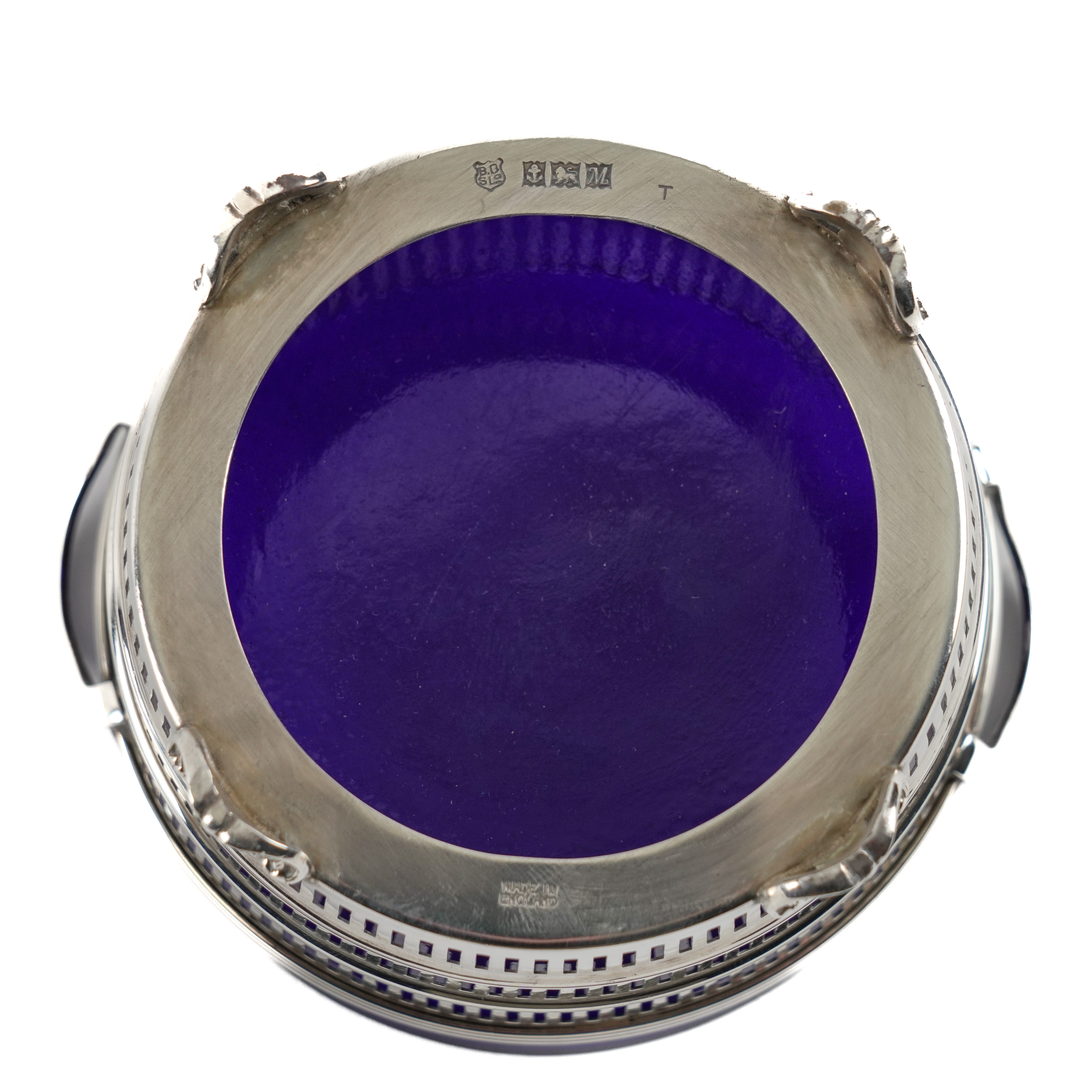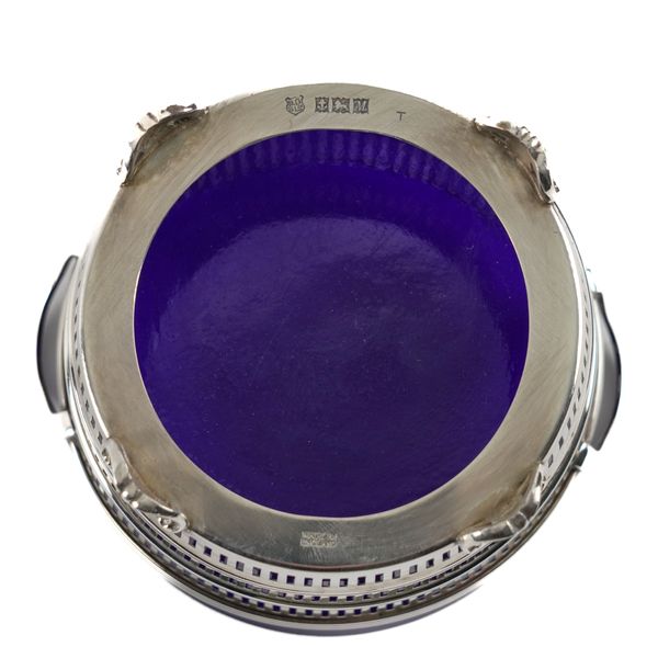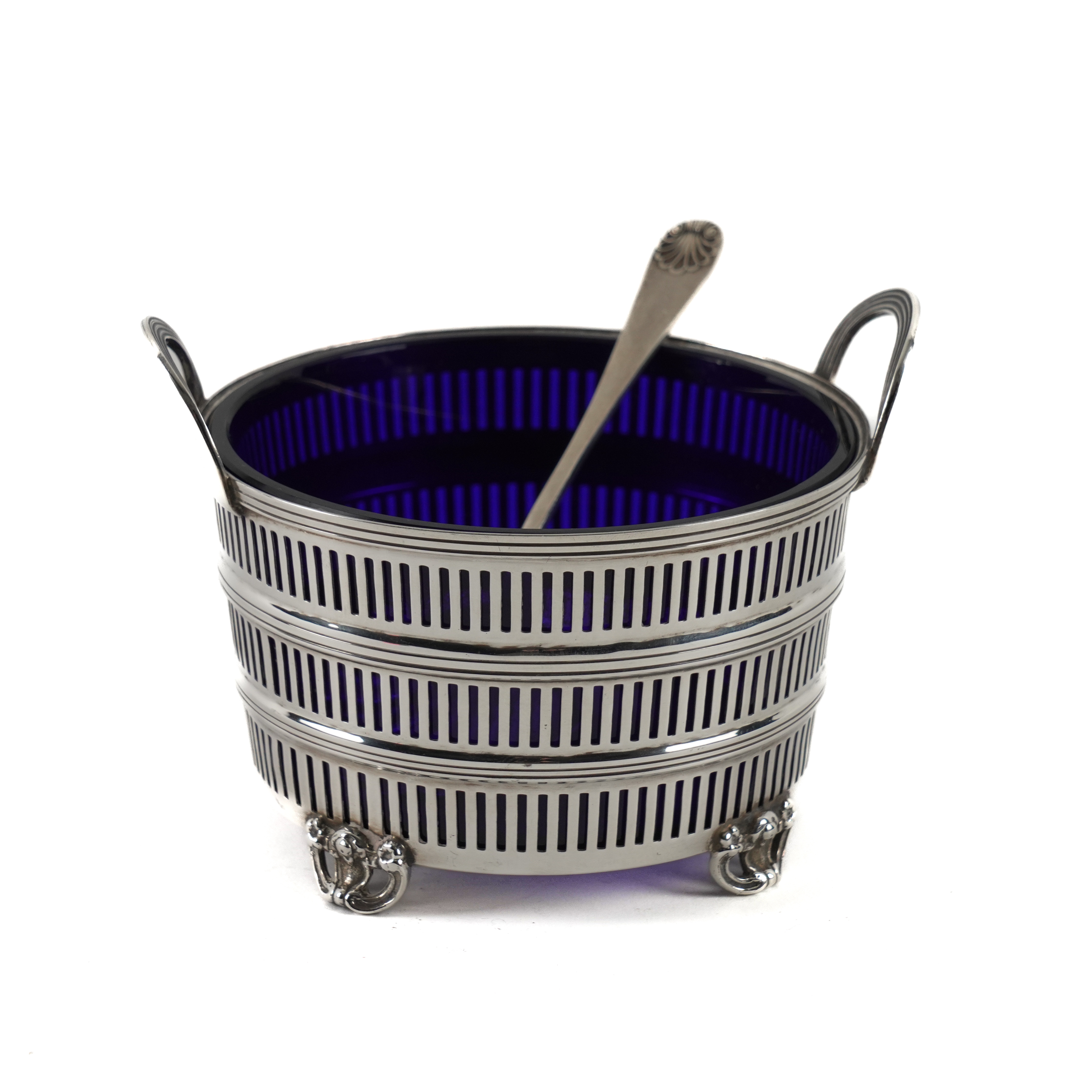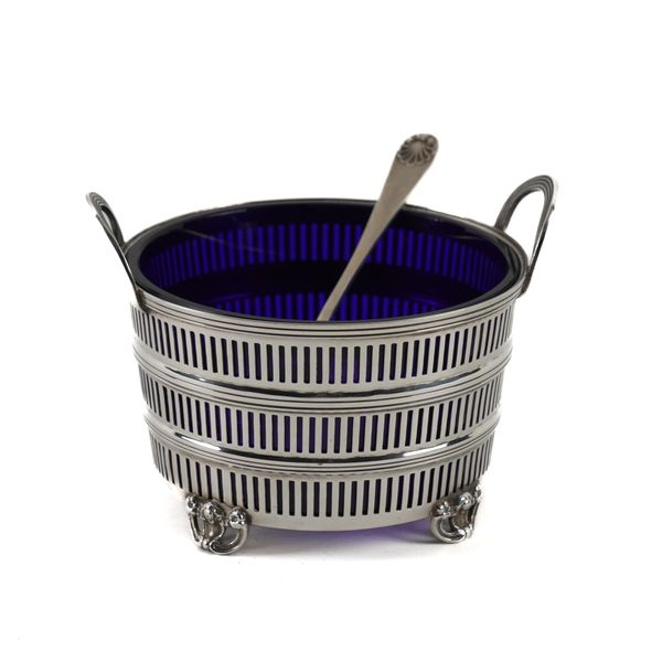 The circular sugar basket decorated with three graduating pierced bands, reeded handles and raised on four cast and pierced feet, Birmingham 1961, with a blue glass liner, the sugar sifting spoon, Birmingham 1960, combined weight 116 grams
