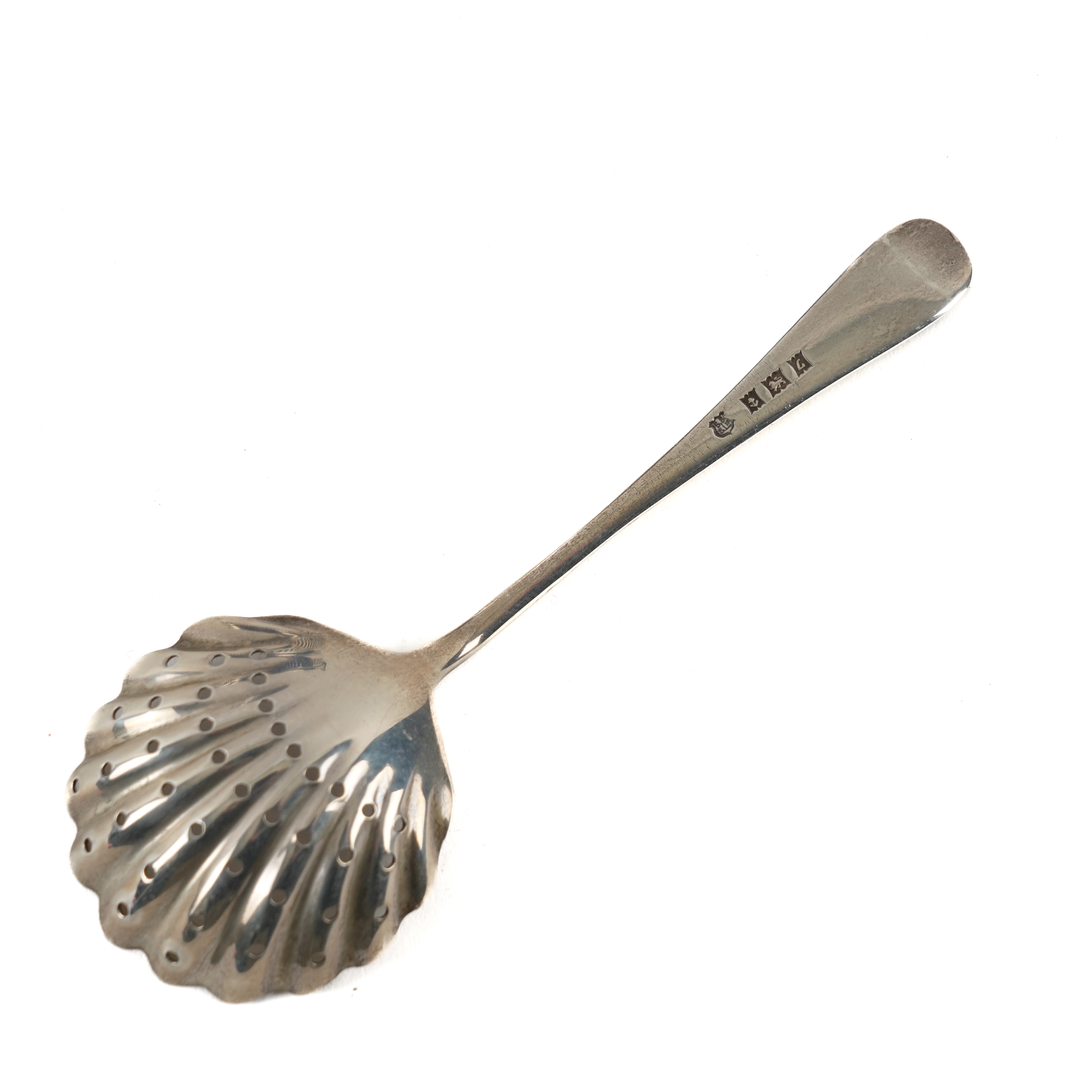 A SILVER TWIN HANDLED SUGAR BASKET AND A SILVER SUGAR SIFTING SPOON (3)