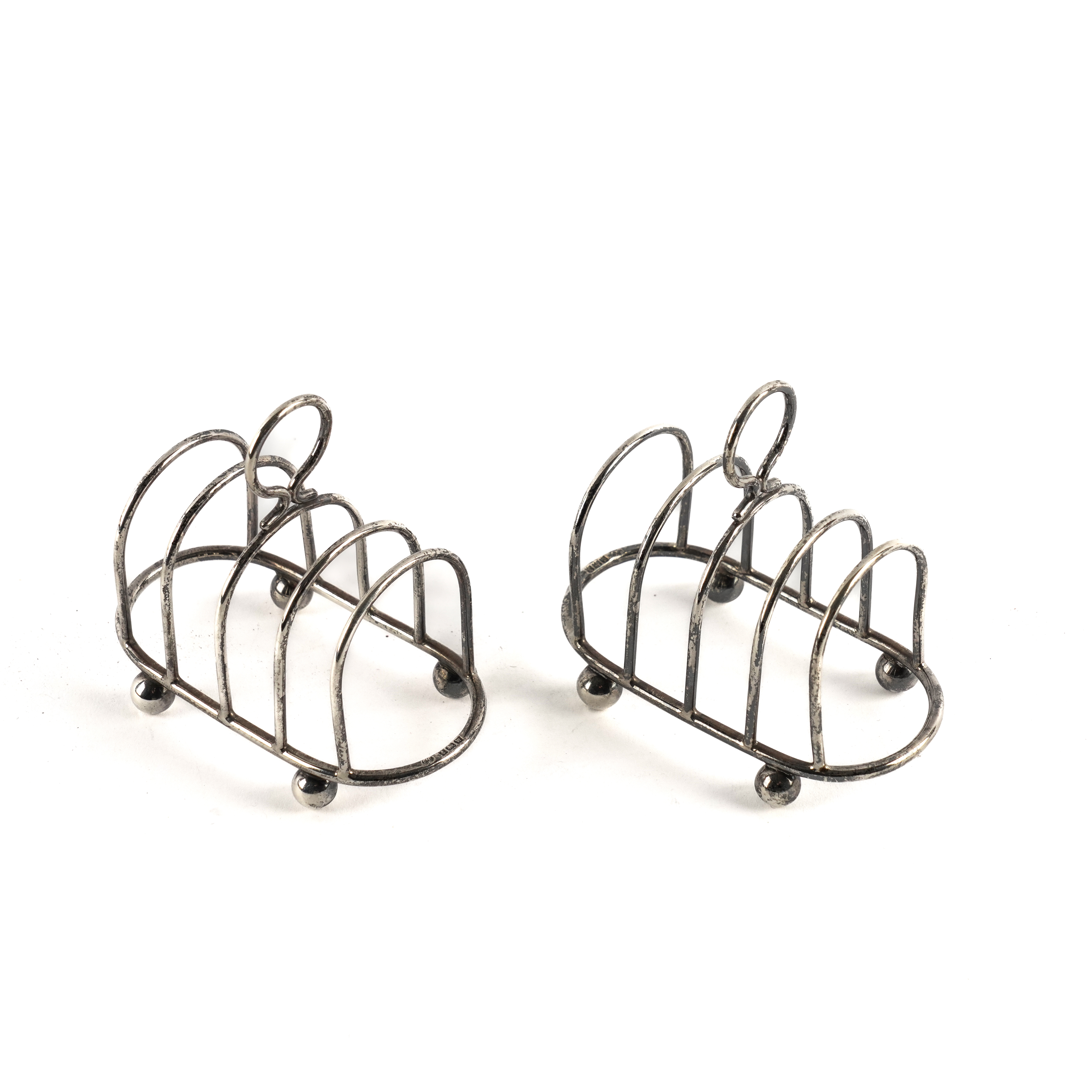 Each toastrack with a loop shaped handle, raised on four spherical feet, Birmingham 1921, the sugar caster with floral, foliate and scroll embossed decoration. Birmingham 1903, combined weight 281 grams