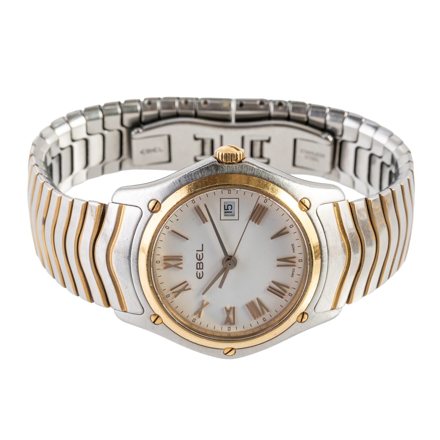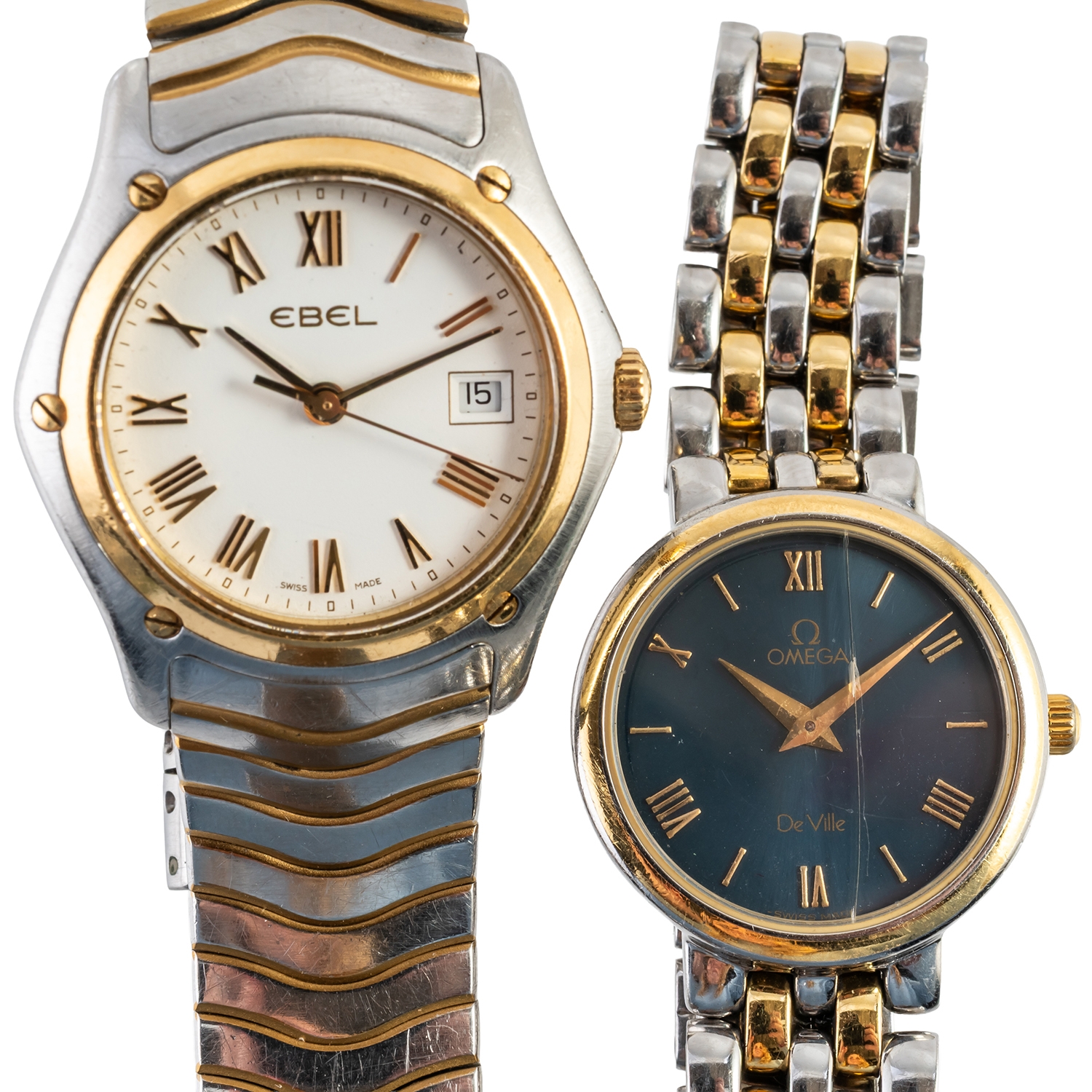 The first watch with gilt alternating Roman and baton numerals to the dial, the bracelet with a folding Omega clasp (the glass cracked), the second watch with gilt Roman numerals to the signed white dial, with a date aperture, with a folding clasp to the bracelet, detailed Ebel