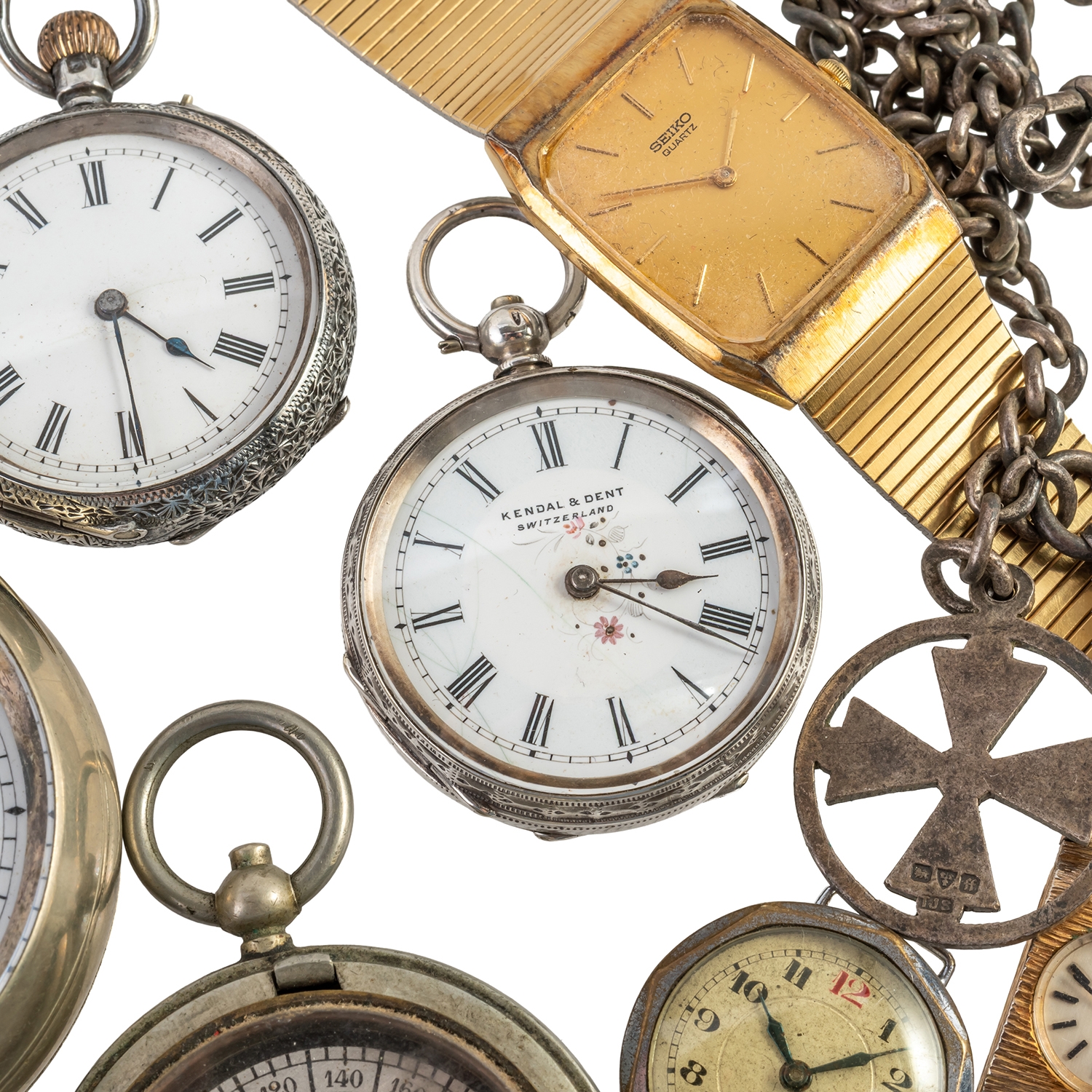 Comprising; a silver cased, keyless wind, openfaced fob watch, Birmingham 1887, a silver cased, key wind openfaced fob watch, detailed 0.,935, three further pocket watches, a pocket compass, seven various wristwatches, an expanding wristwatch bracelet, a silver curb link watch Albert chain, with two silver rob medals and two silver swivels and a base metal curb link long chain