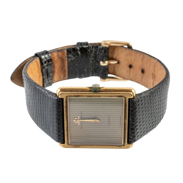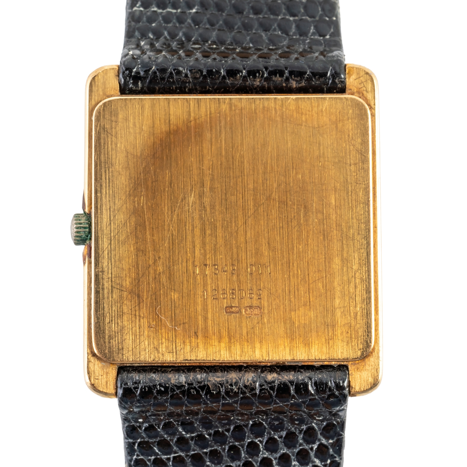 The signed banded dial with tapered gilt hands, the dial and case surround having ridged decoration, the caseback detailed 750 17349 011 1268062, case size 27mm x 24mm, fitted to a leather strap, having an associated buckle