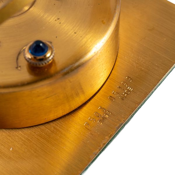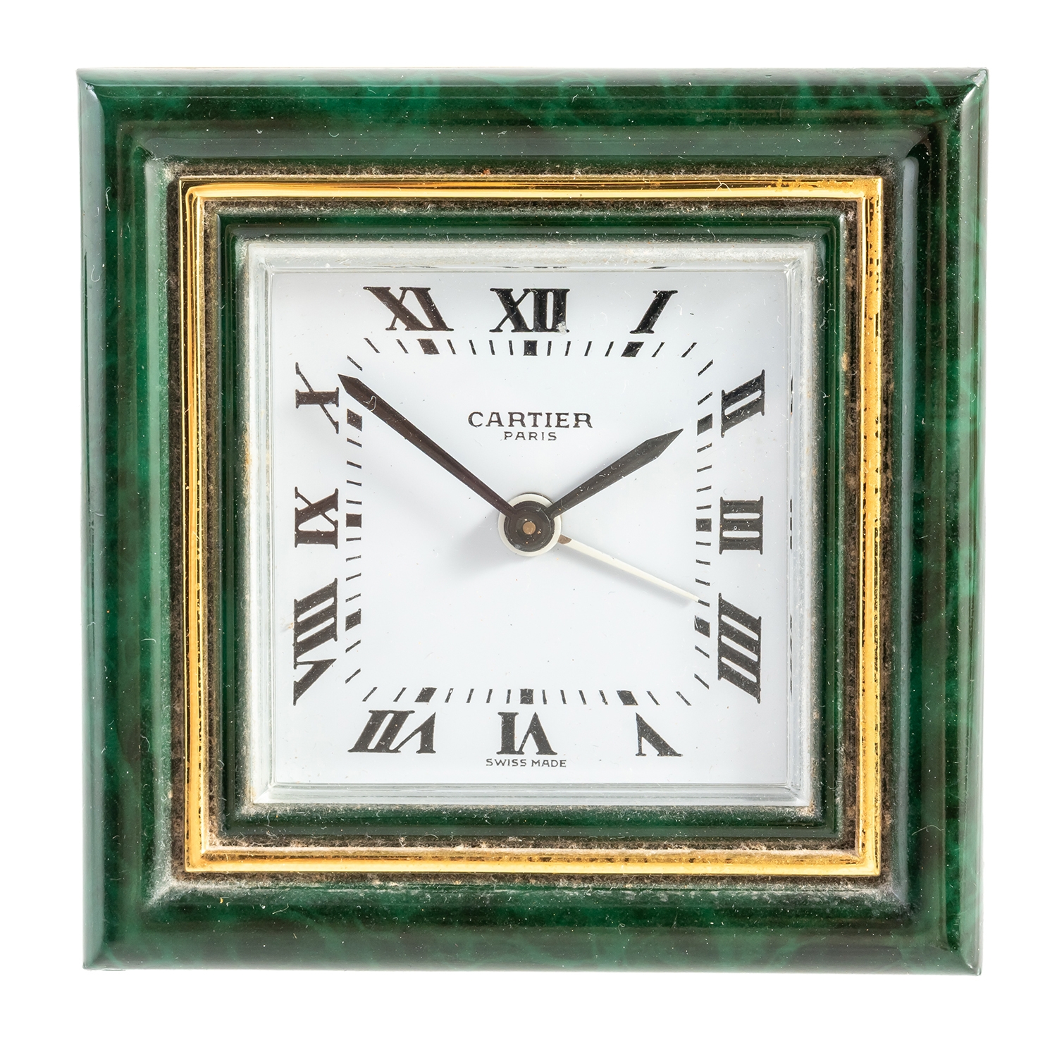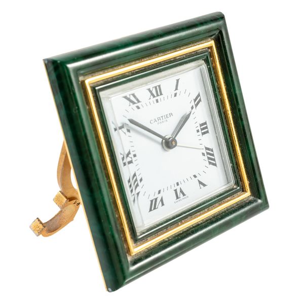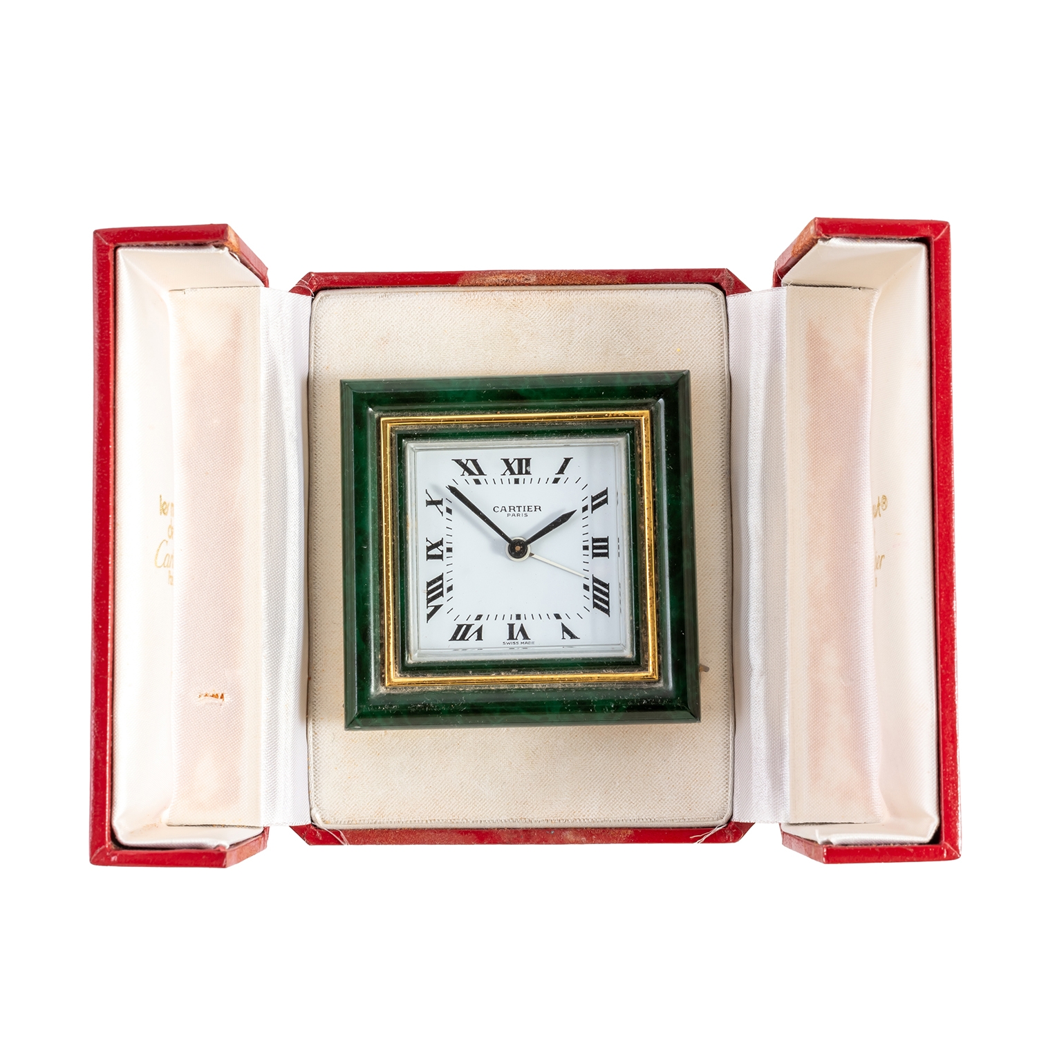 Featuring a handwound mechanical movement with an alarm in a base metal case, with white a white dial and green enamel bezel in a fitted Cartier case.