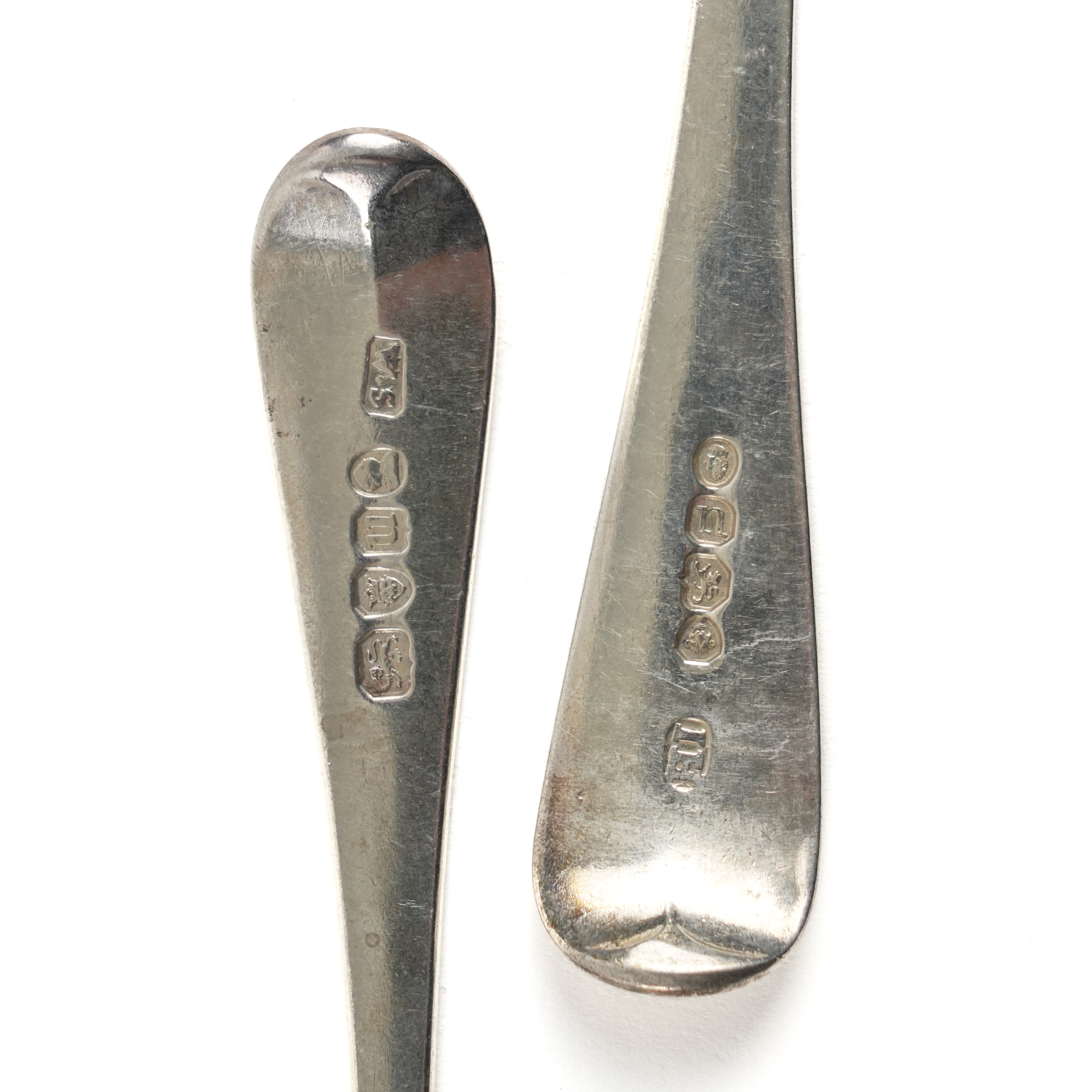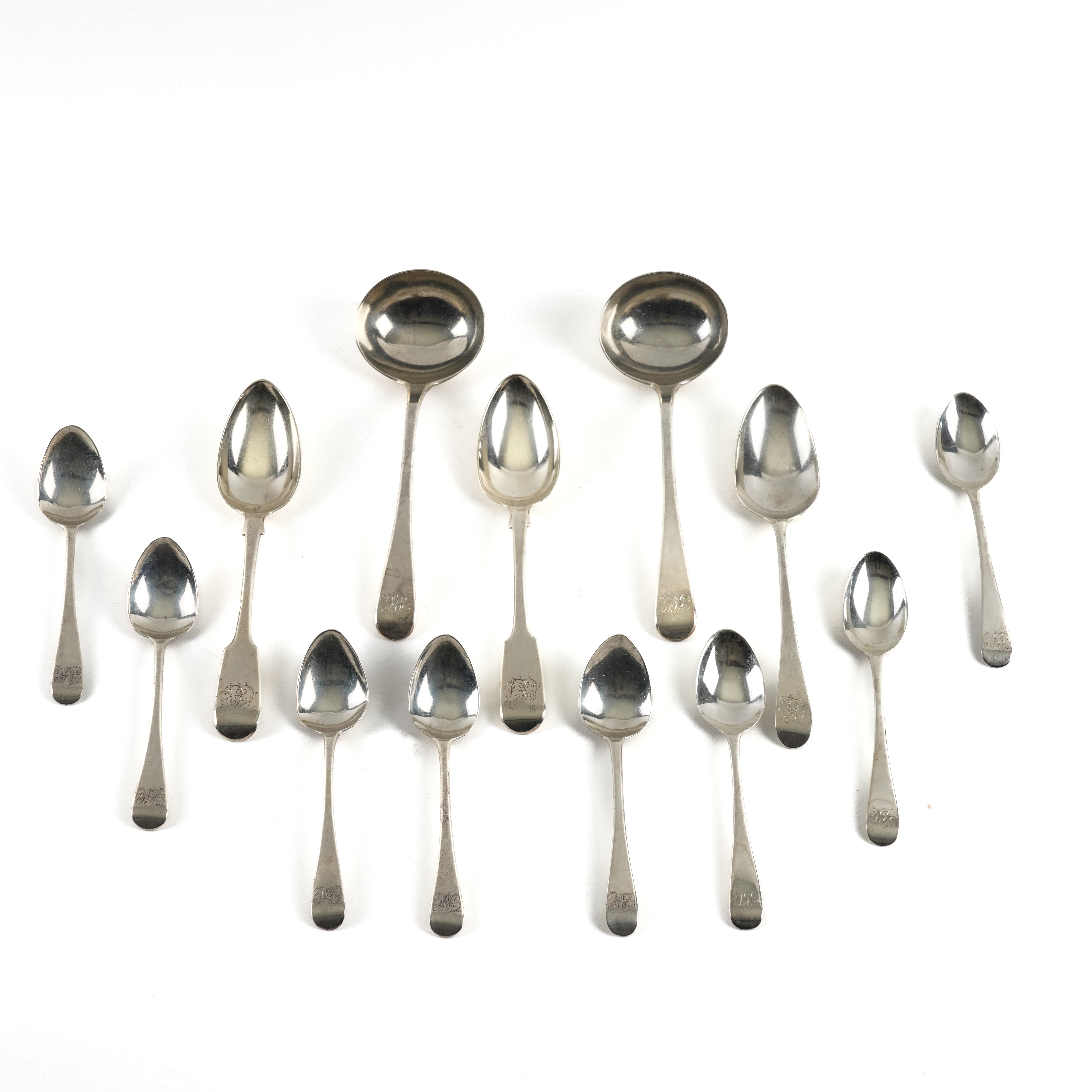 A PAIR OF SILVER OLD ENGLISH PATTERN SAUCE LADLES AND FURTHER TABLE FLATWARE (13)