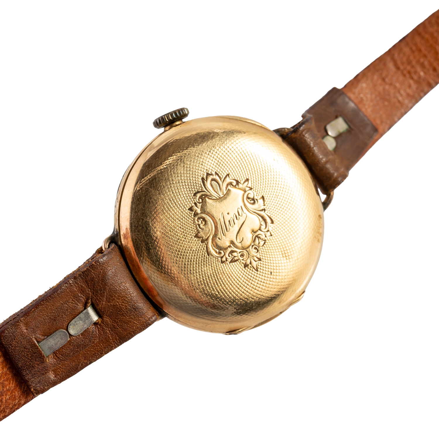 With a signed jewelled movement, the inner and outer case interiors detailed 18 K, the signed enamelled dial with black Arabic numerals, subsidiary seconds and with pierced gilt hands, the caseback detailed Mina within a cartouche, case diameter 29mm, later fitted to a leather strap
