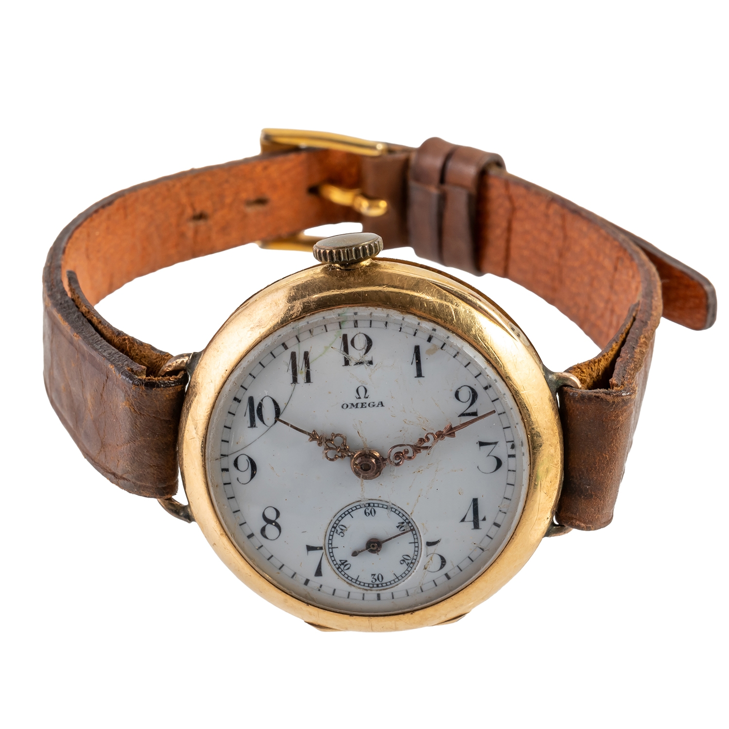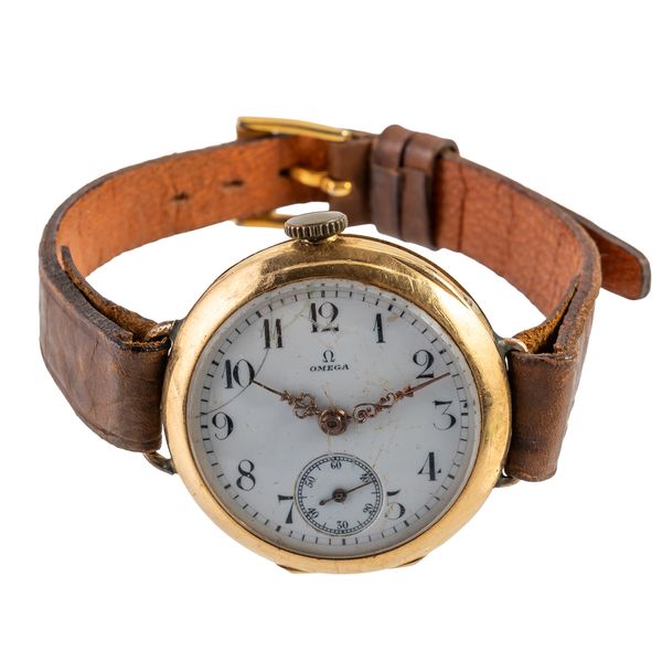 AN OMEGA GOLD CASED OPENFACED FOB WATCH, CONVERTED FOR WEAR AS A WRISTWATCH