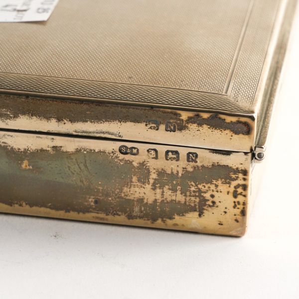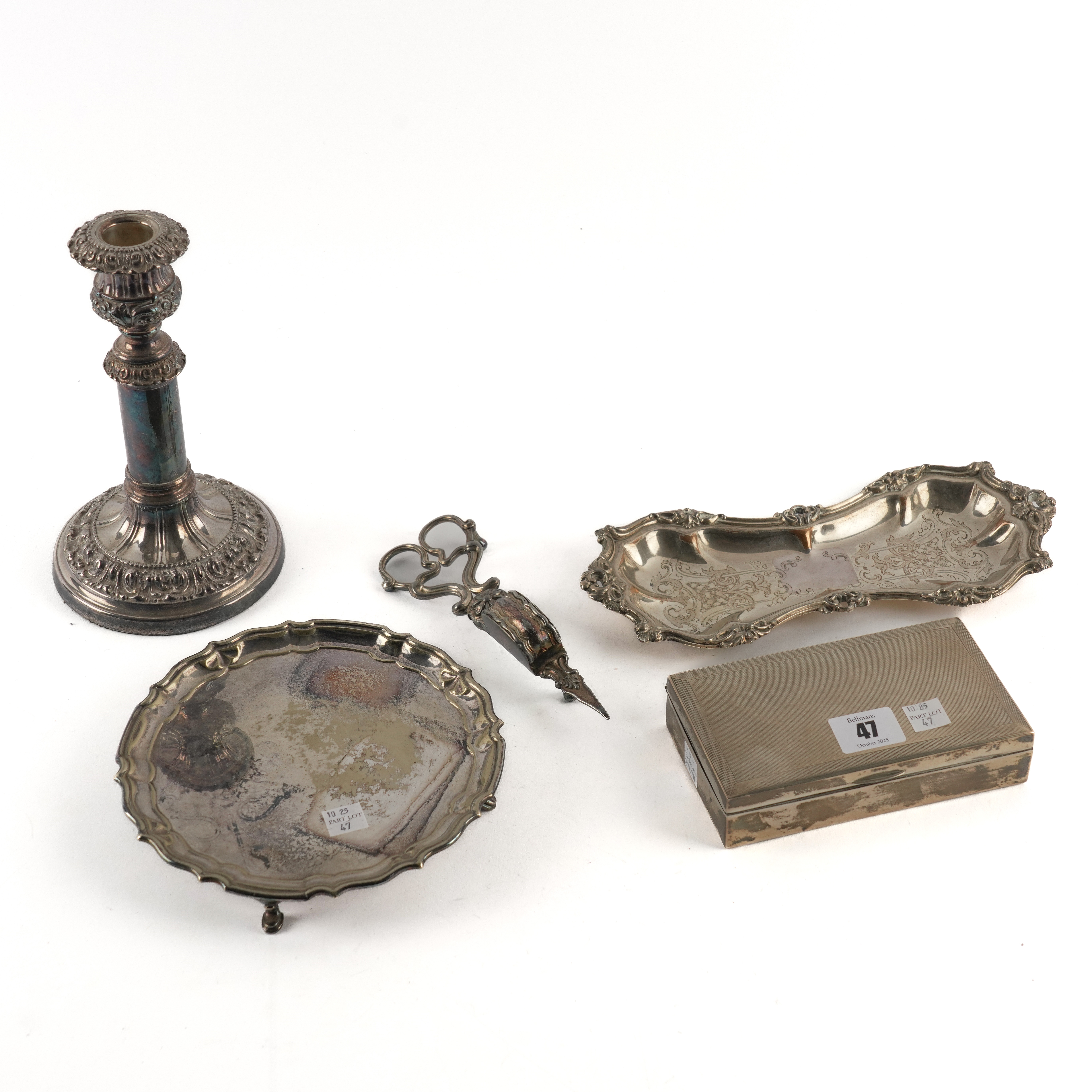 The cigarette box wooden lined within, the lid engine turned, Birmingham 1937, size 15cm x 9cm, the plated wares comprising; a pair of candle snuffers, (one leg lacking) with a snuffer's tray, a telescopic candlestick and a small salver, diameter 18.2cm