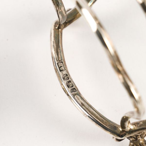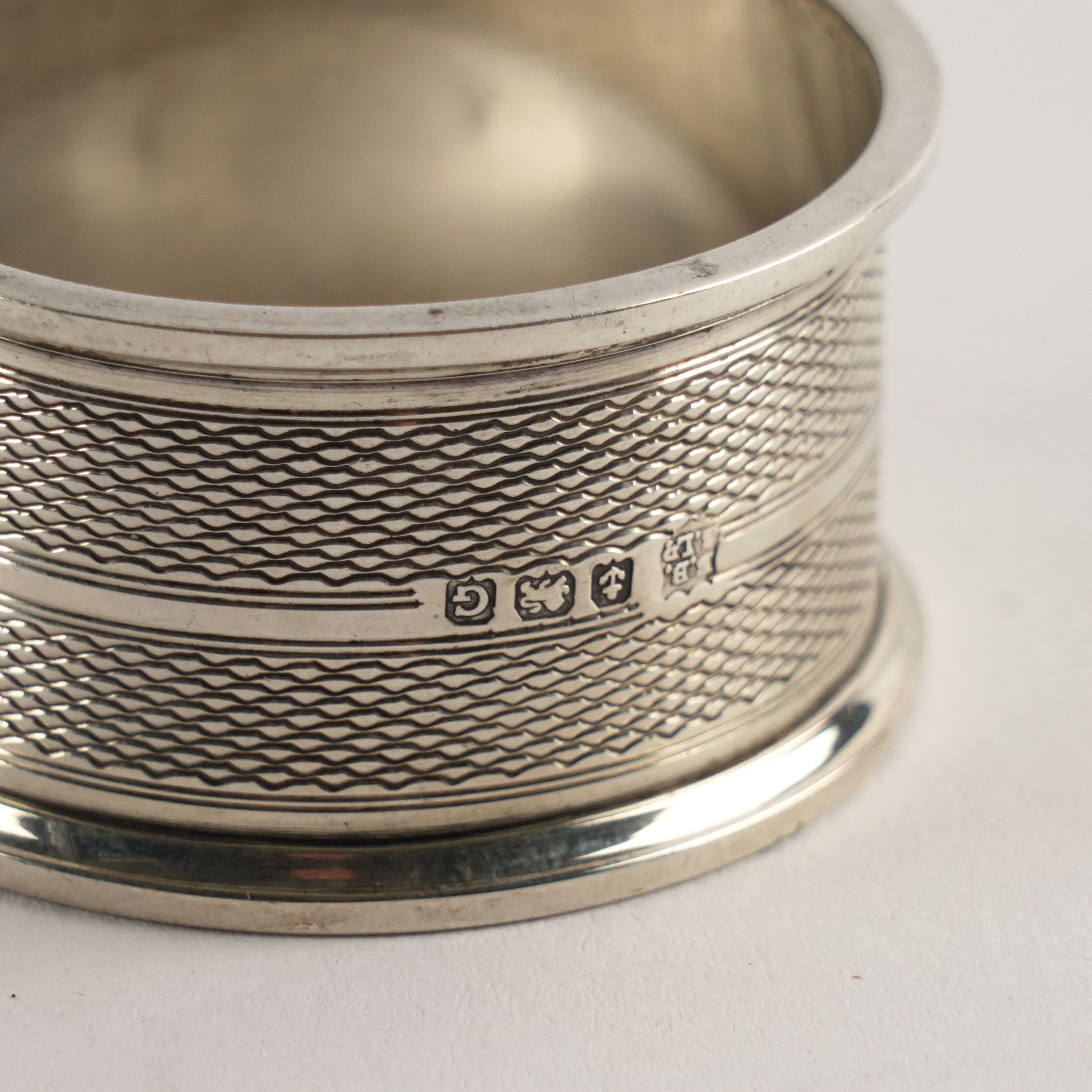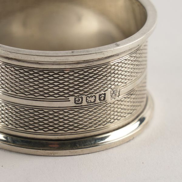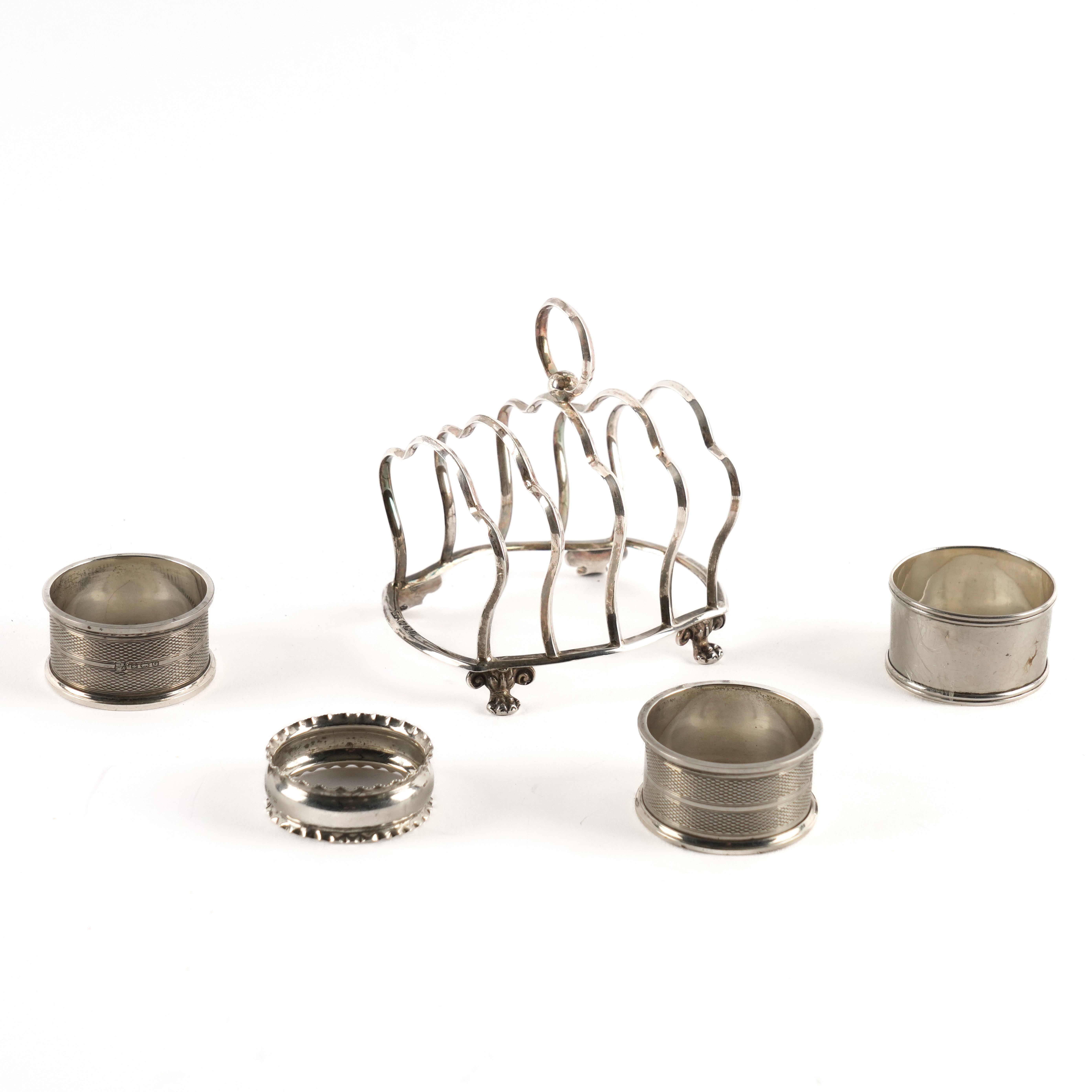 The toastrack of shaped form, with a loop shaped handle, raised on four paw feet, Sheffield 1895, a pair of napkin rings with engine turned decoration, Birmingham 1931 and two further napkin rings, combined weight 136 grams