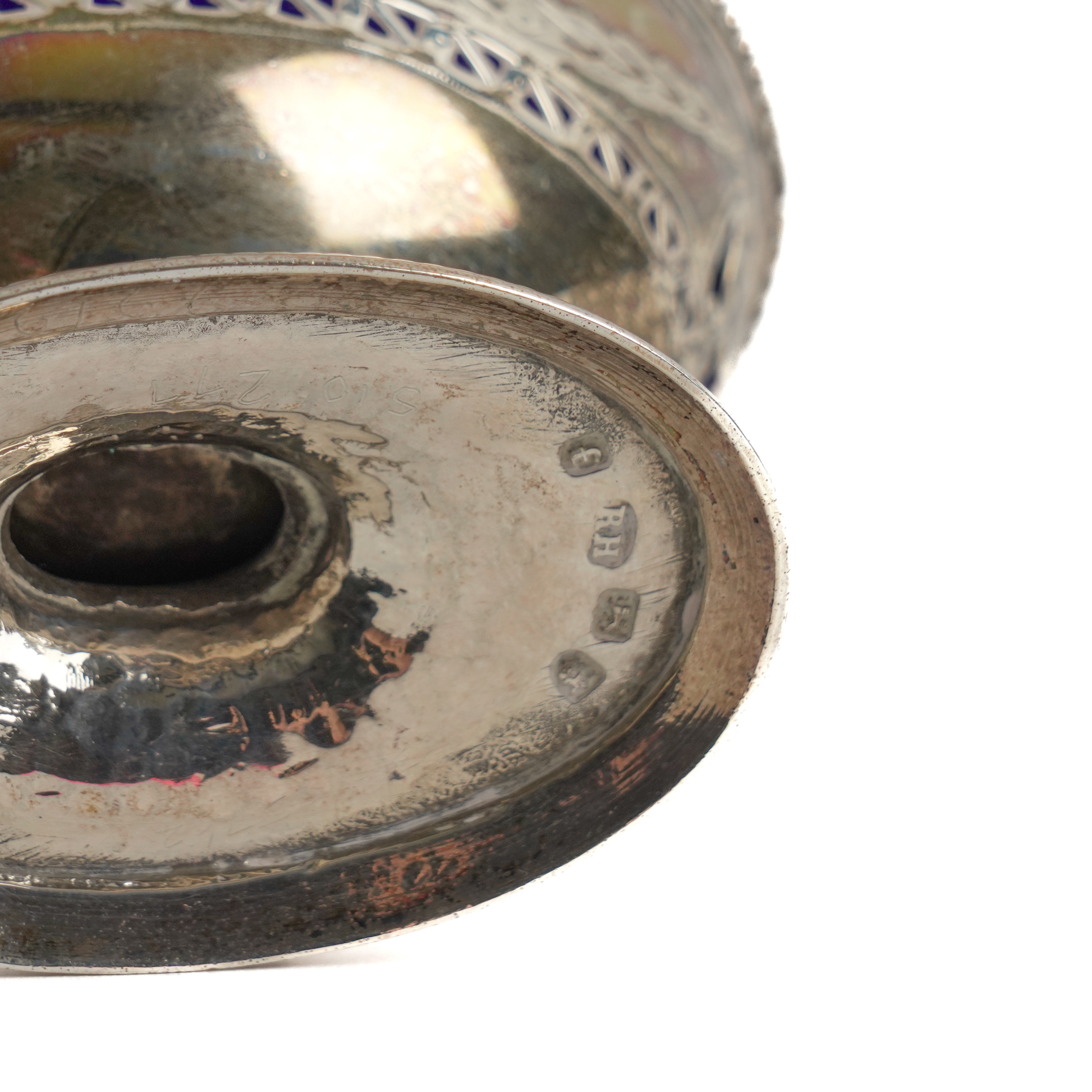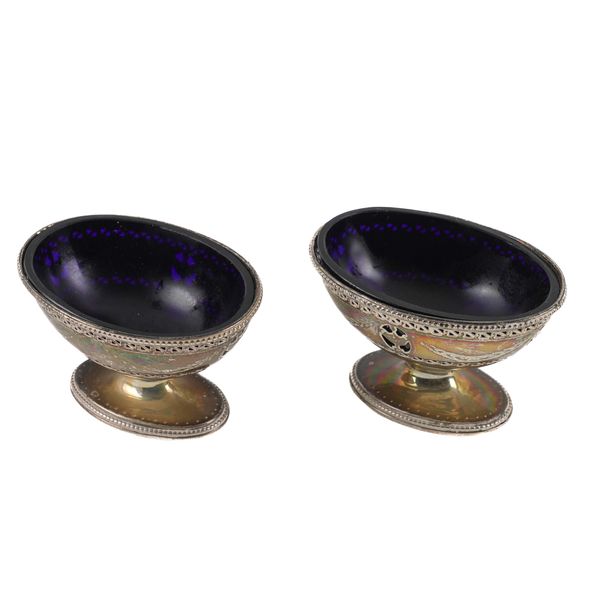 Each of oval form, with pierced and engraved decoration in the Adam style within beaded rims, sample length 9.5cm, London 1781, maker Robert Hennell I, combined weight 184 grams, with blue glass liners