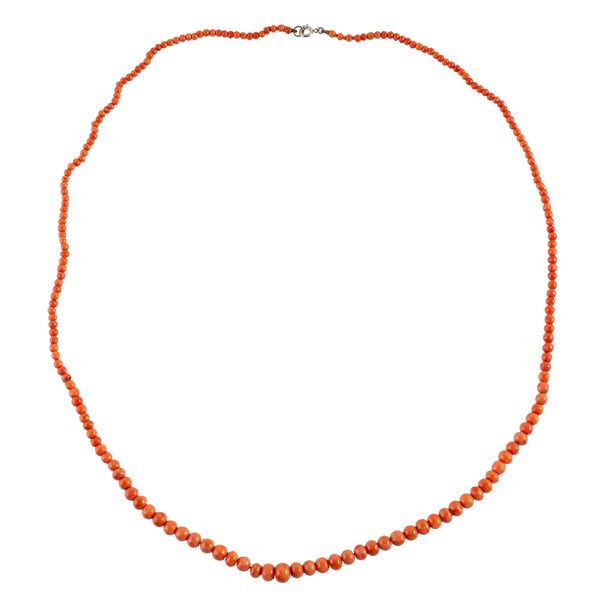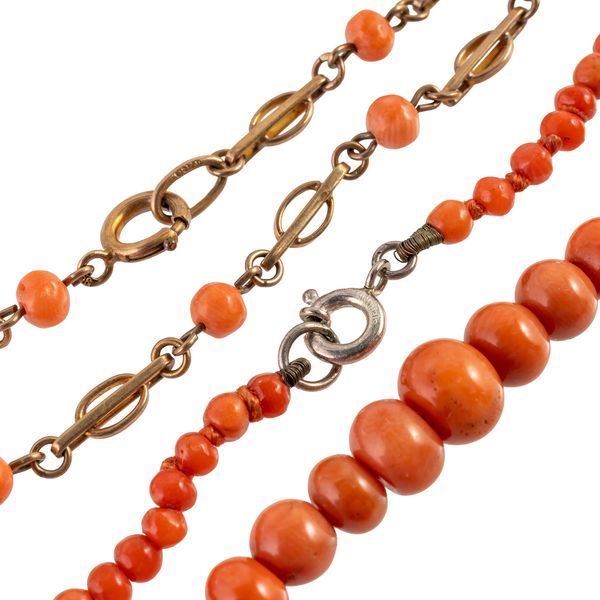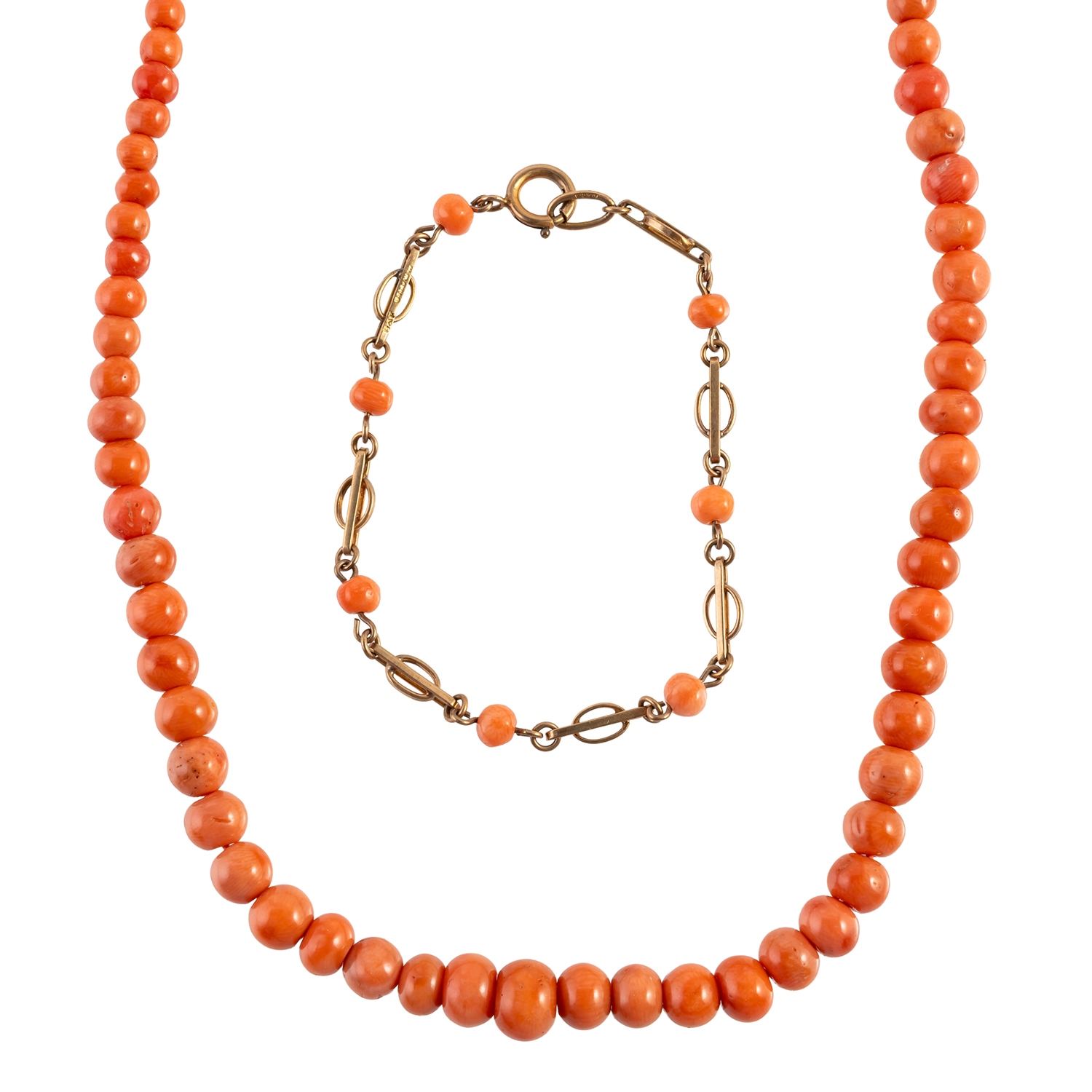 A SINGLE ROW NECKLACE OF GRADUATED CORAL BEADS AND A 9CT GOLD AND CORAL SMALL BRACELET (2)
