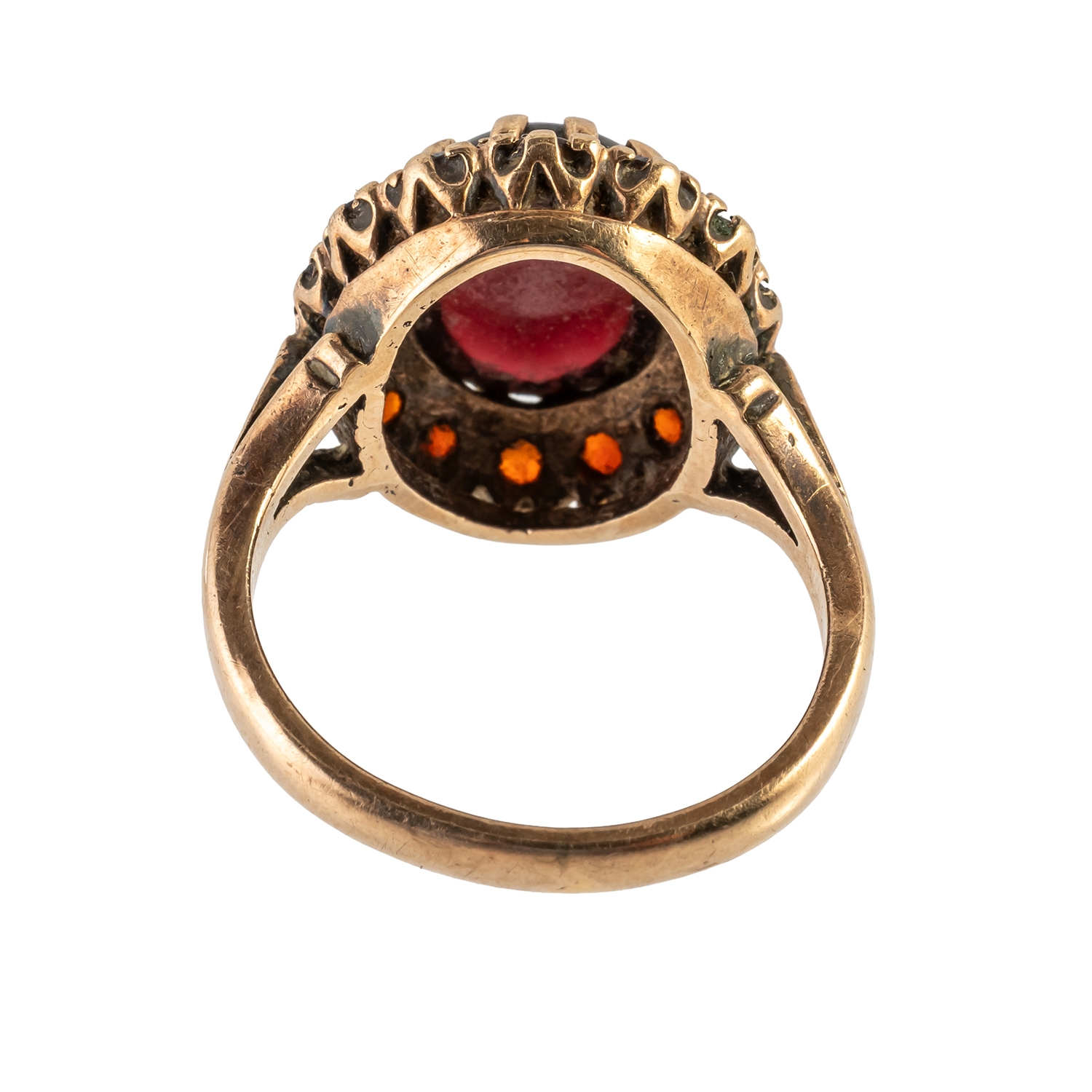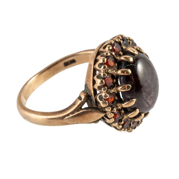 Claw set with an oval carbuncle garnet at the centre, within a surround of circular cut garnets, probably London 1968, size M, gross weight 5.9 grams