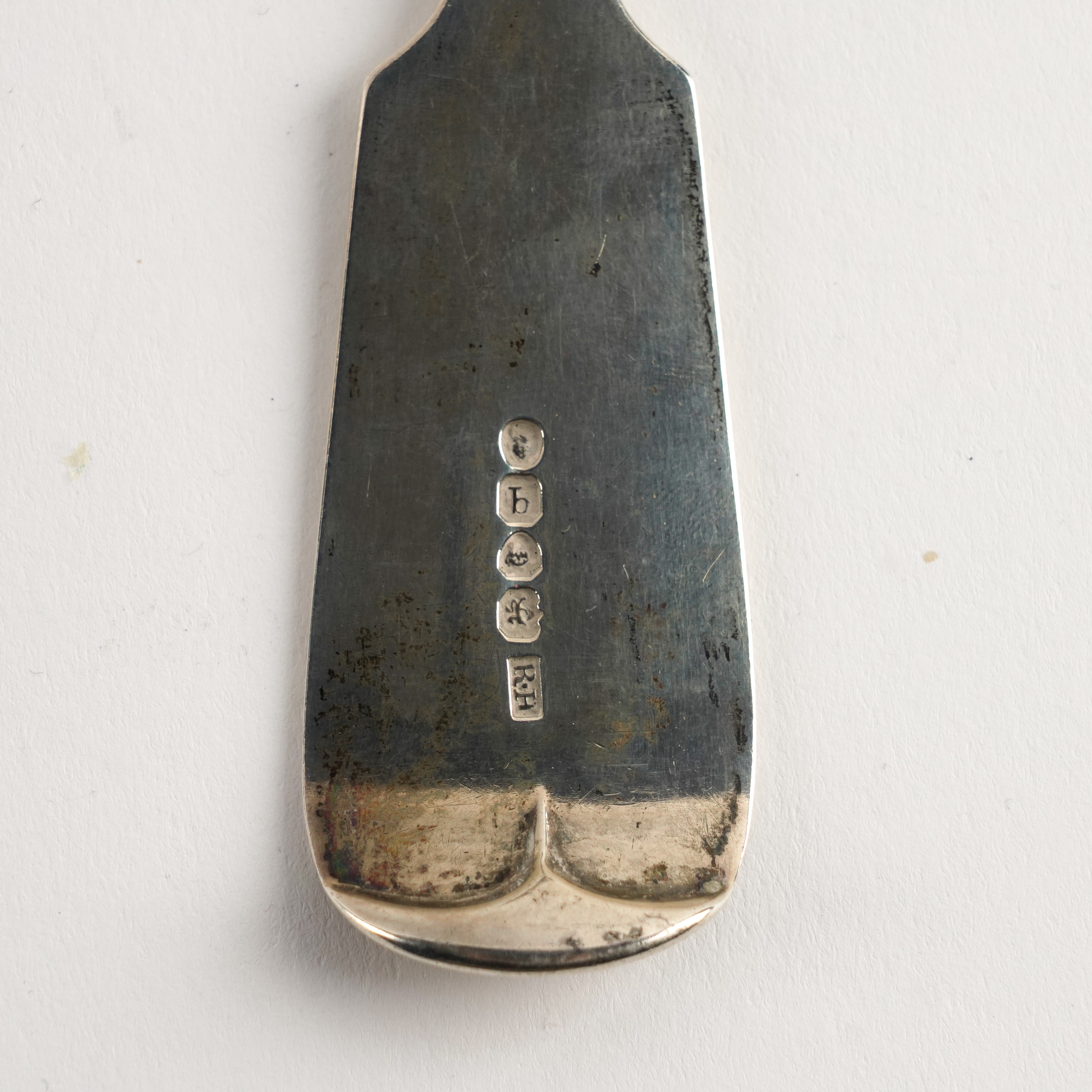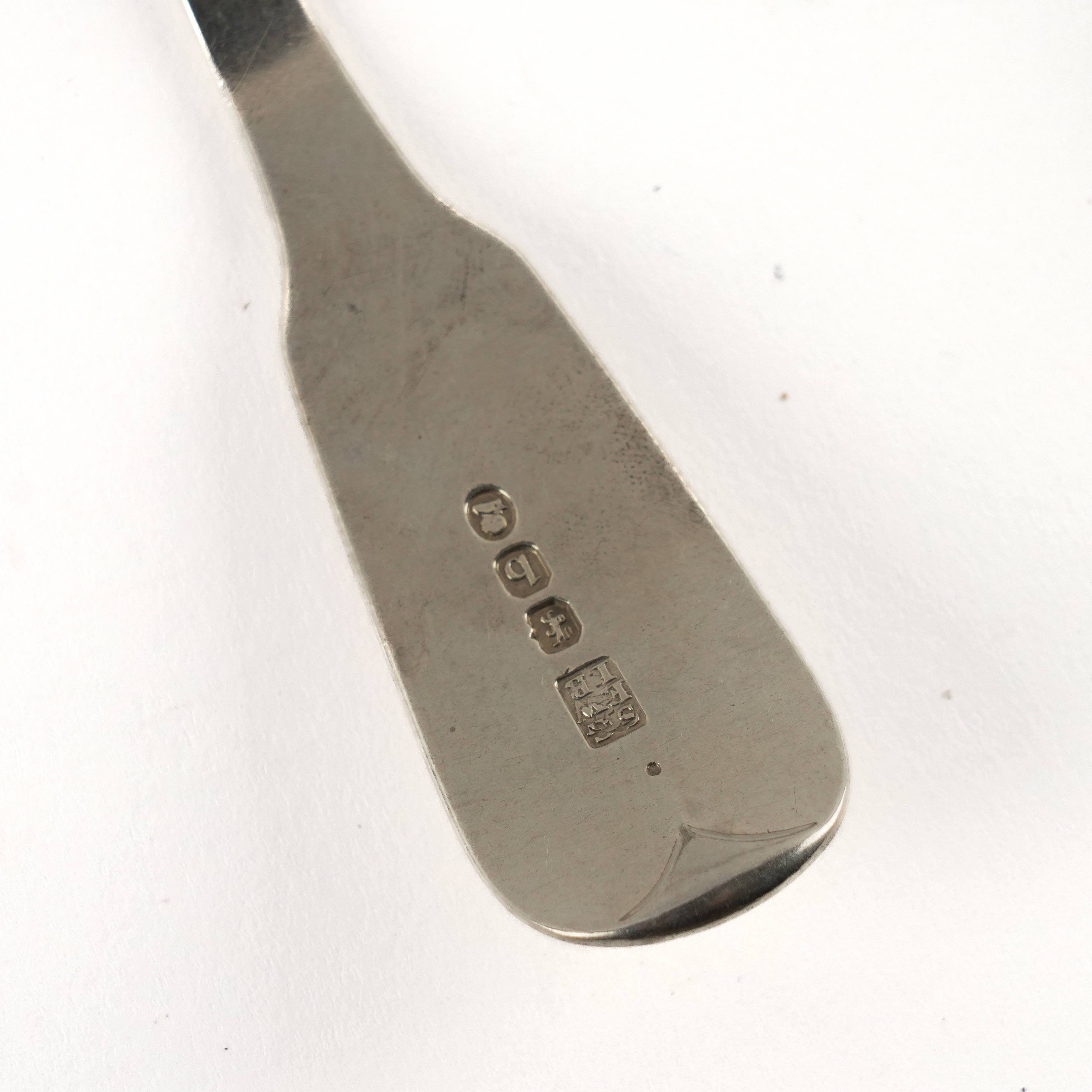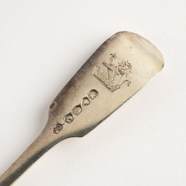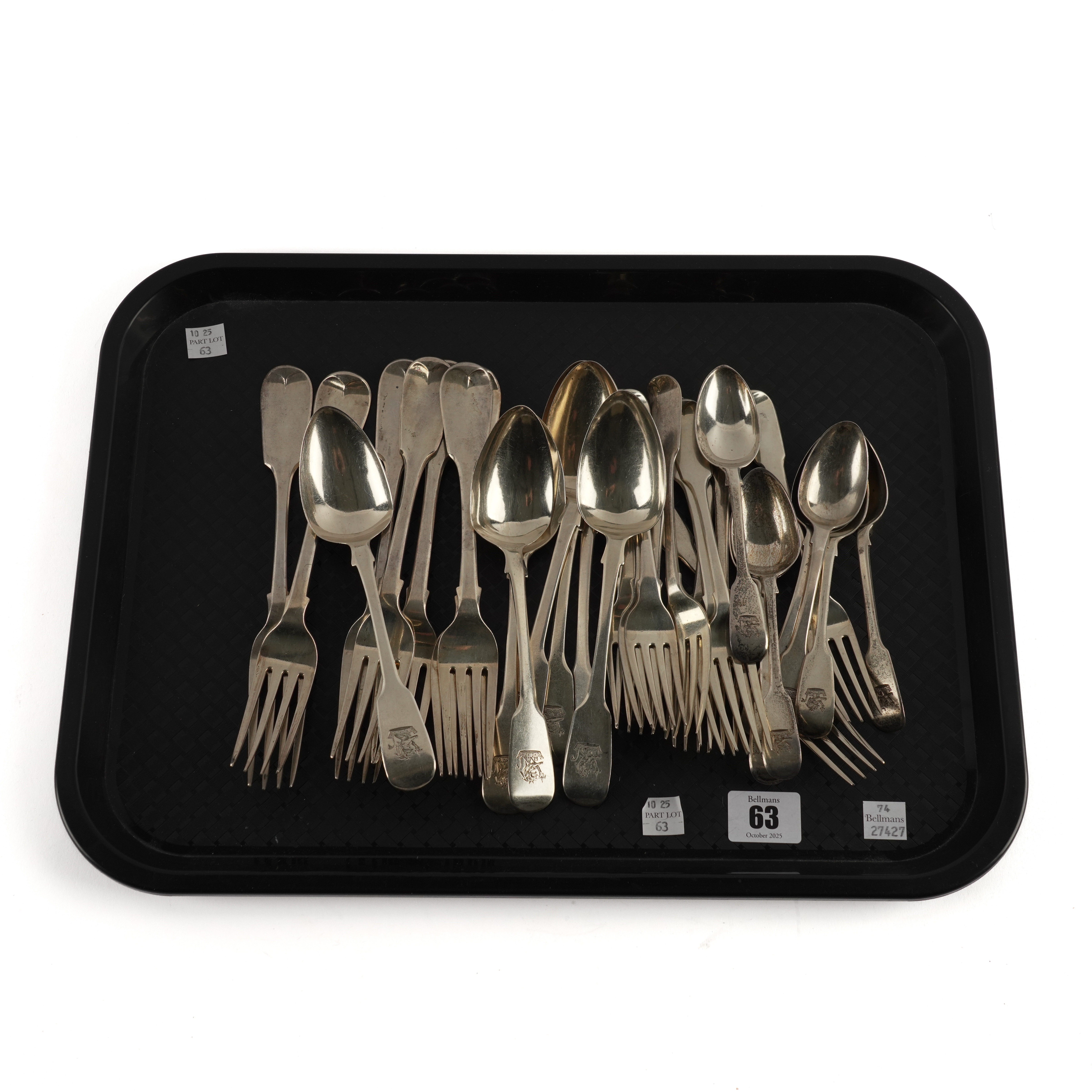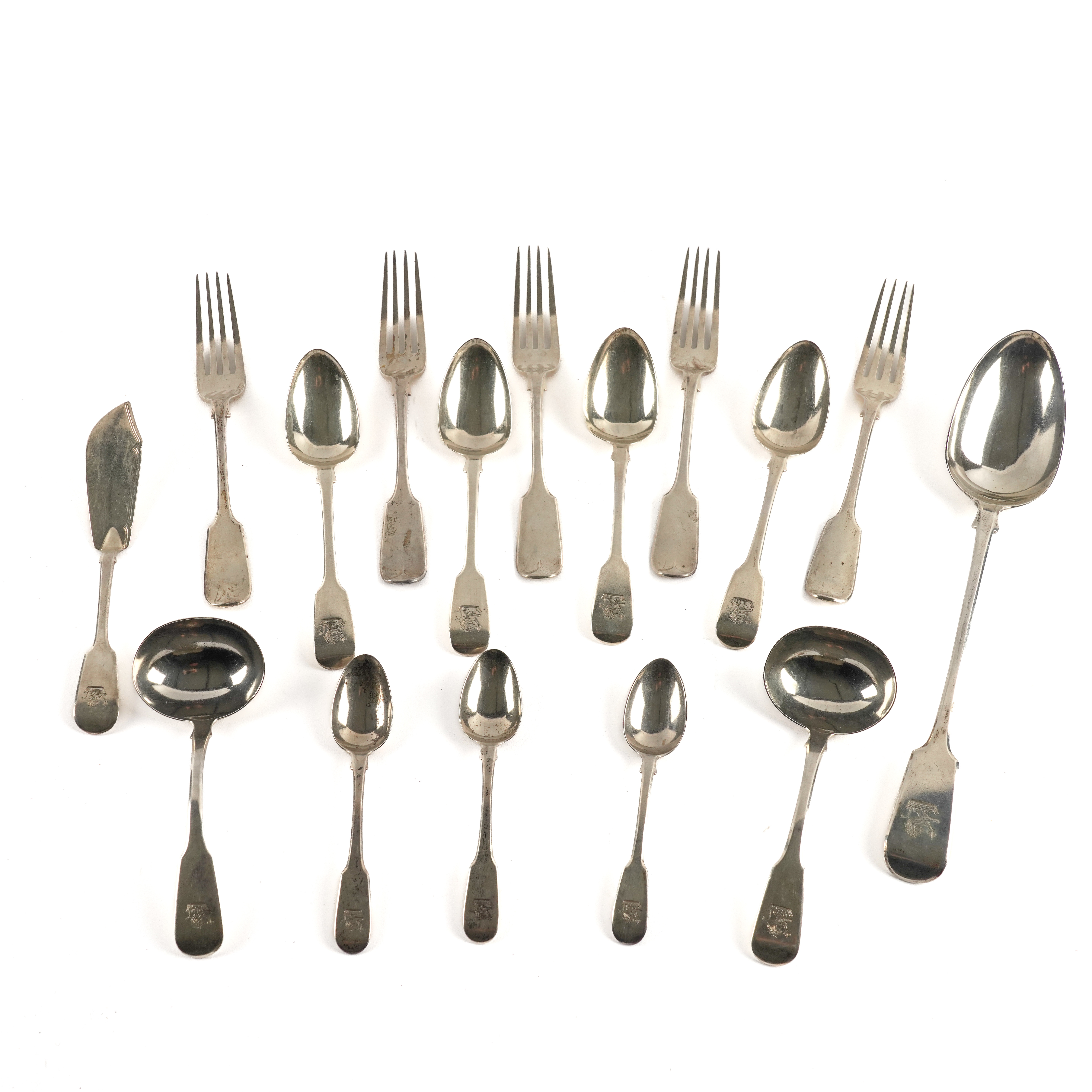 Comprising; a basting spoon, a butter knife, a pair of sauce ladles, ten teaspoons, eleven dessert forks, eleven dessert spoons and twelve table forks, mixed mostly 19th century dates, all engraved with the same crest, combined weight 2285 grams