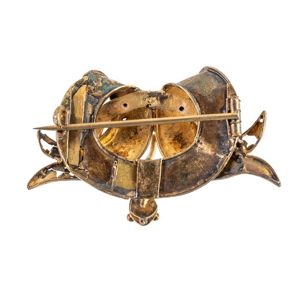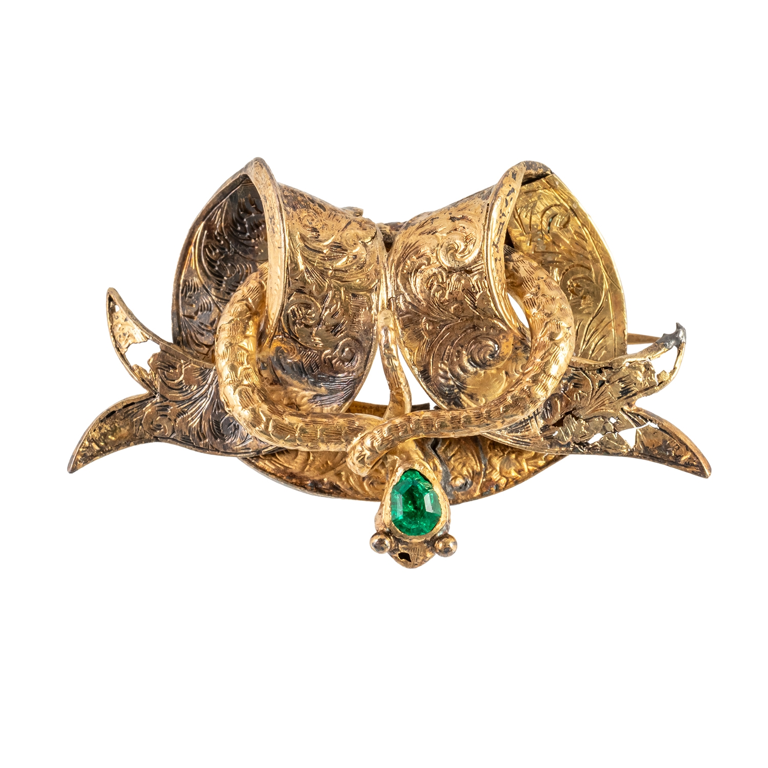 Designed as a bow and a serpent, with scroll engraved decoration, the serpent's head mounted with a pear shaped emerald, width 40mm, gross weight 5.6 grams