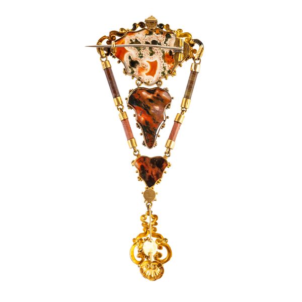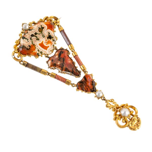 Of pierced scroll and beaded design, above an imitation pearl drop, circa 1840, width 4.2cm, length 10cm
