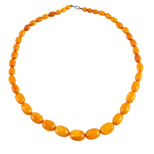 A SINGLE ROW NECKLACE OF GRADUATED VARICOLOURED BUTTERSCOTCH COLOURED AMBER BEADS (3)