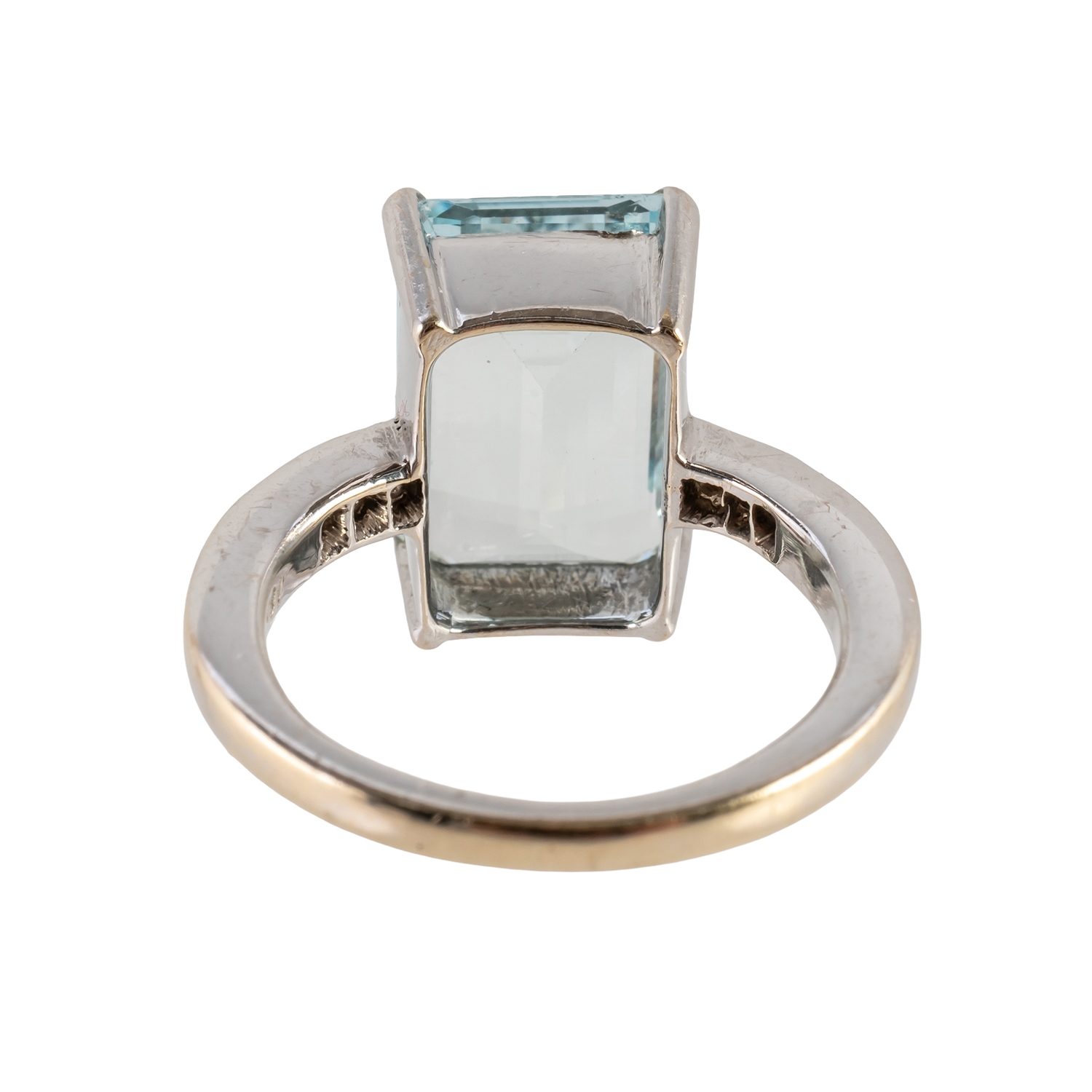 Claw set with the cut cornered rectangular, emerald cut aquamarine between circular cut diamond set three stone shoulders, detailed 18 K, ring size K, gross weight 5.6 grams