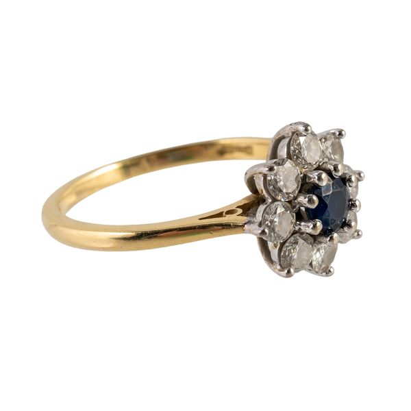 AN 18CT GOLD, SAPPHIRE AND DIAMOND NINE STONE CLUSTER RING