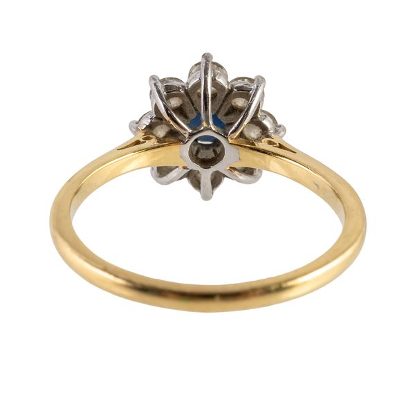 Claw set with the circular cut sapphire at the centre within a surround of eight circular cut diamonds, detailed 750, ring size L, gross weight 2.7 grams