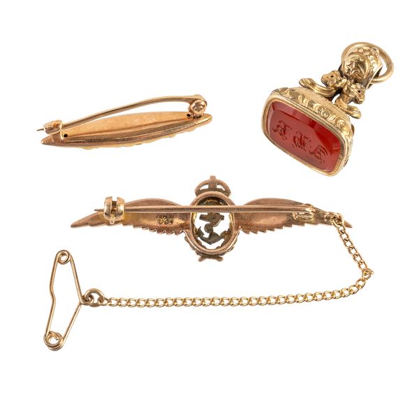 Comprising; a Victorian gilt metal mounted cornelian fob seal, a gold and red enamelled brooch, designed as the badge of The Fleet Air Arm, detailed 9 CT, fitted with a safety chain, gross weight 3.5 grams and a gold and enamelled Art Nouveau brooch, designed as a girl's head with flowing hair, detailed 14 K, probably American, length 2.7cm, gross weight 1.5 grams