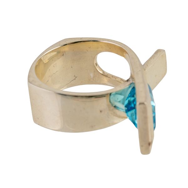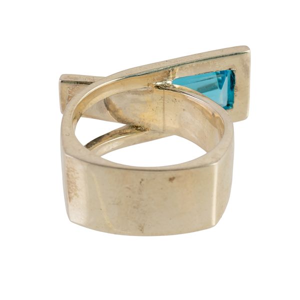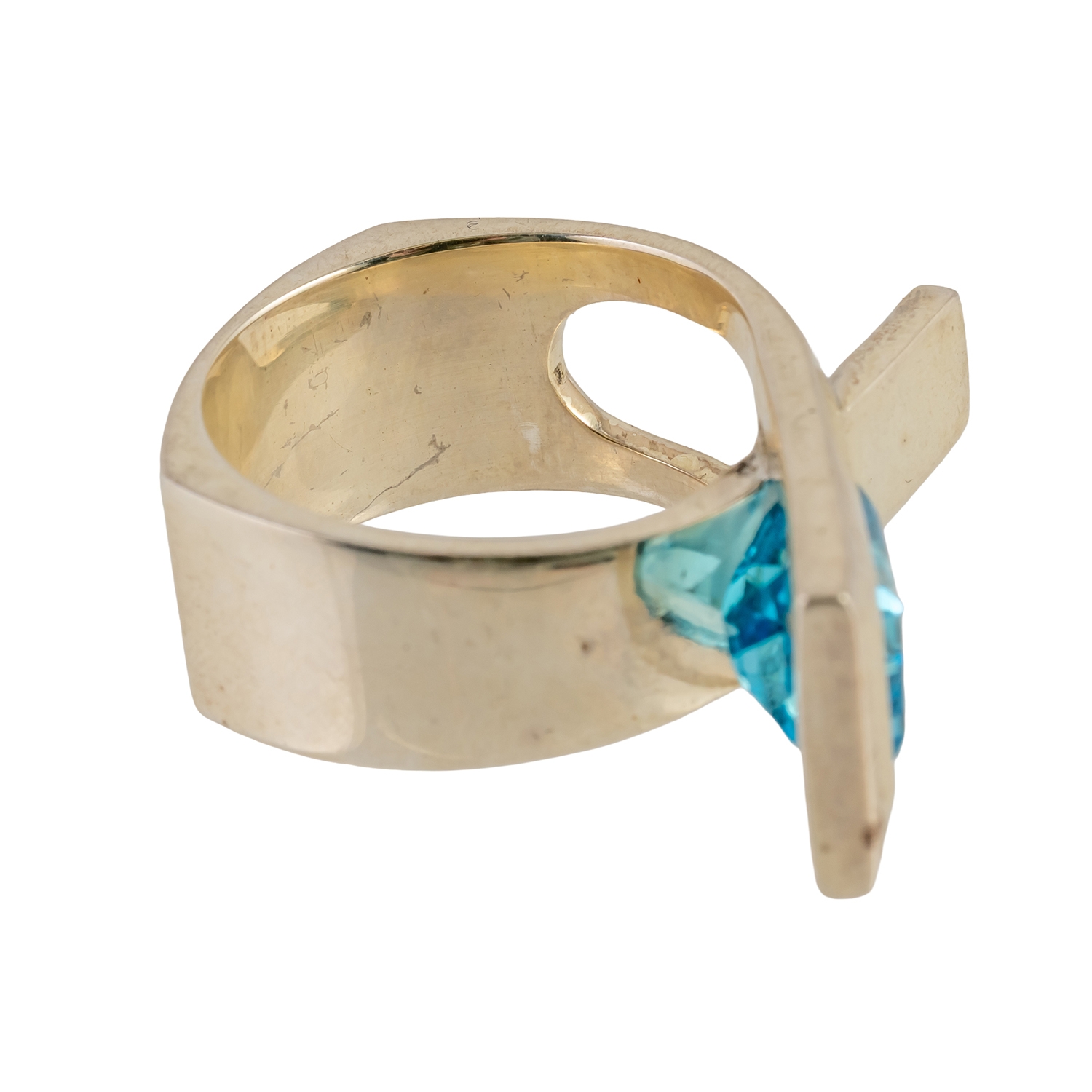 Mounted with an emerald cut blue topaz, in a cross over design, size P, gross weight 13 grams