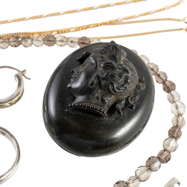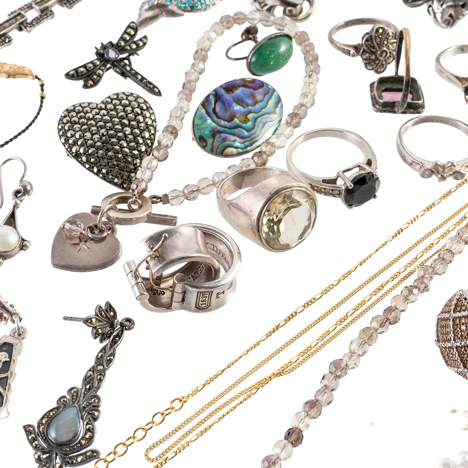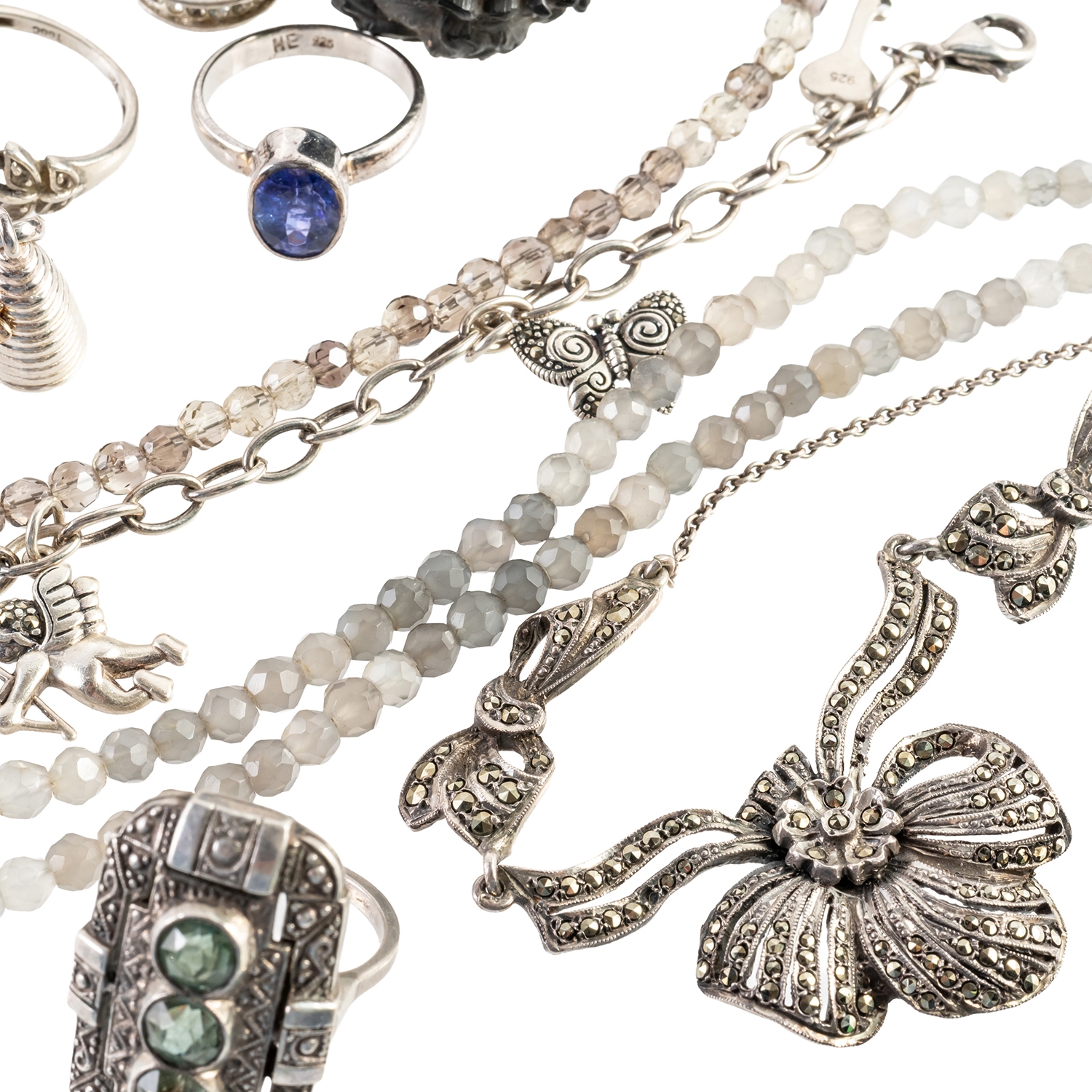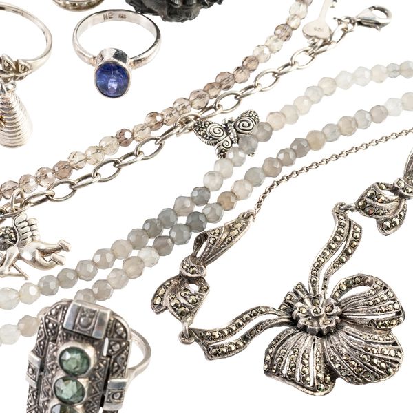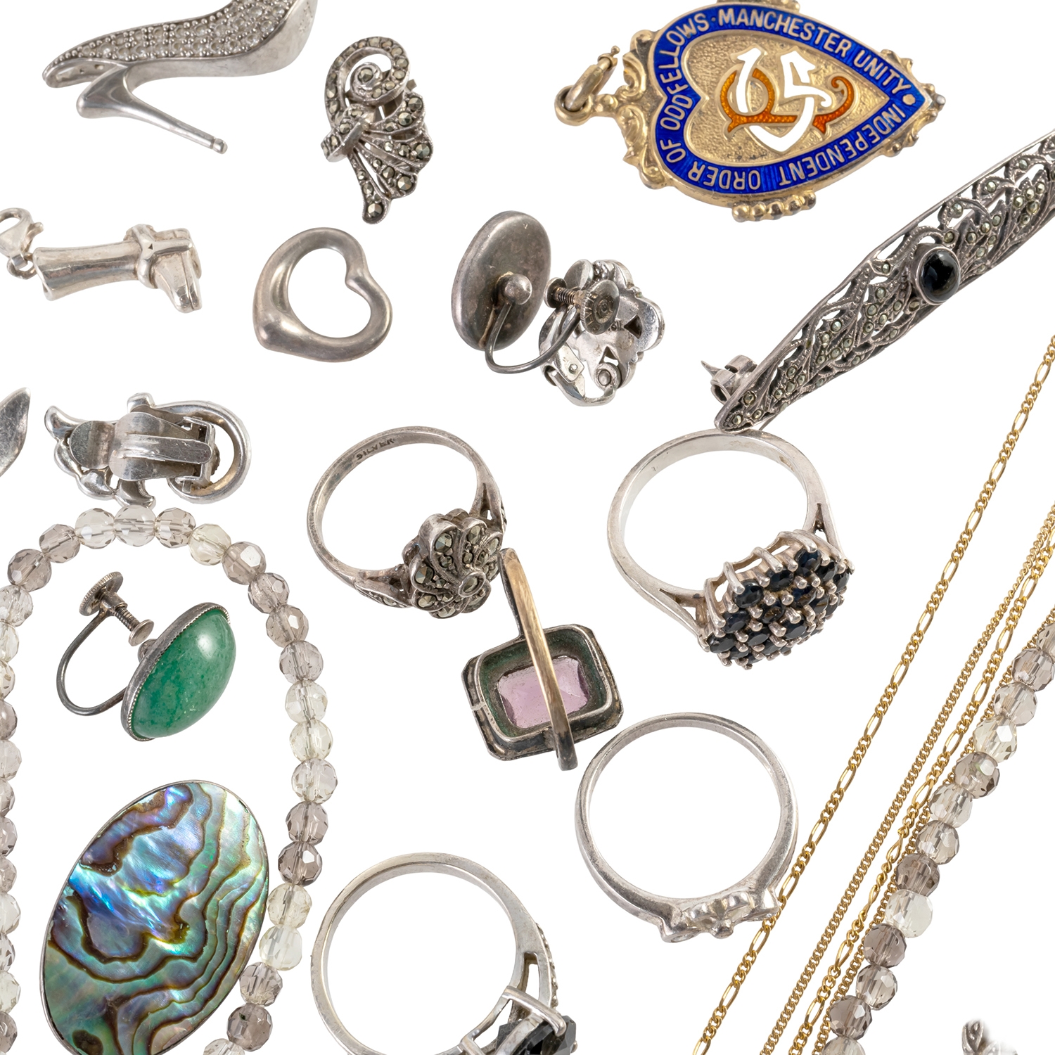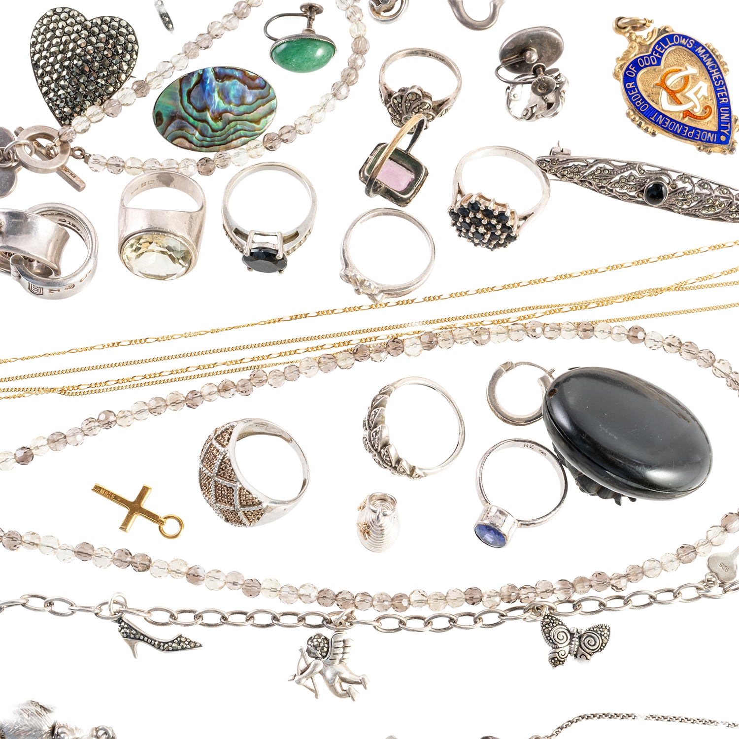 Including four pairs of earrings and earclips, five pendants and charms, ten rings, a marcasite necklace, two silver gilt neckchains, a marcasite bracelet, two further bracelets, an Oddfellows enamel medal, four brooches, two bead necklaces, a bead bracelet and seven further items