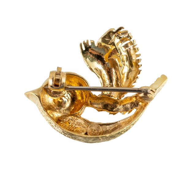 Designed as a bird in flight, with a ruby set eye, detailed Grosse Germany 750, length 26mm, gross weight 6.3 grams
