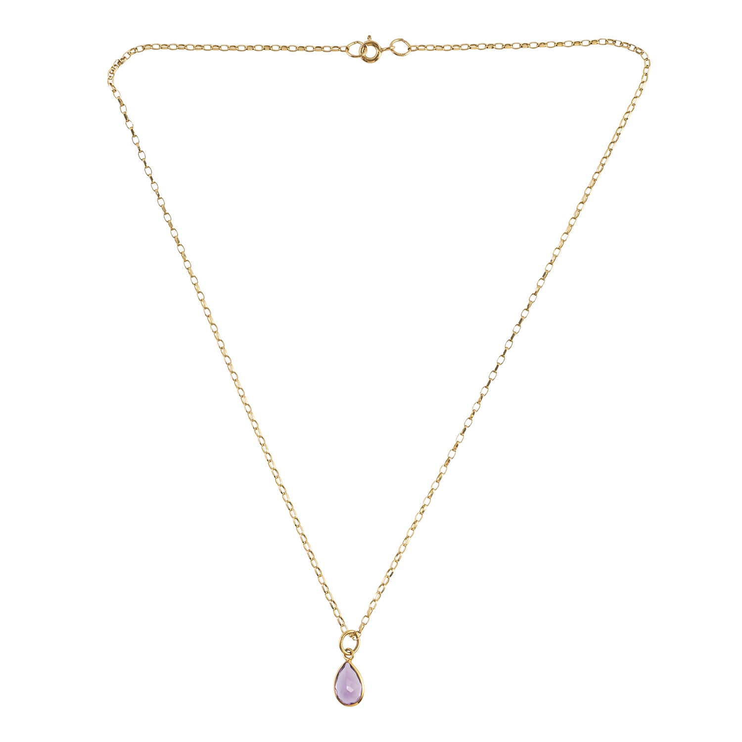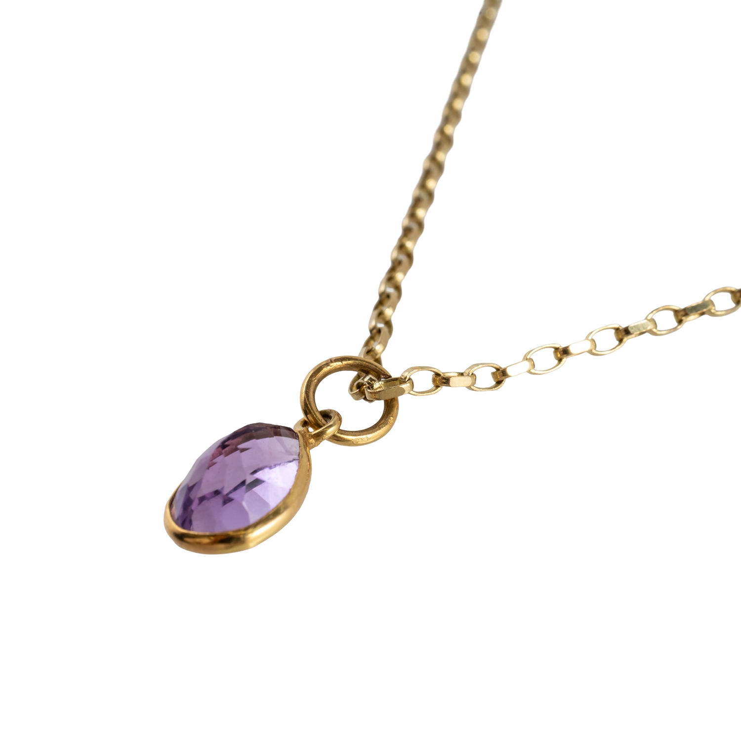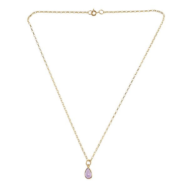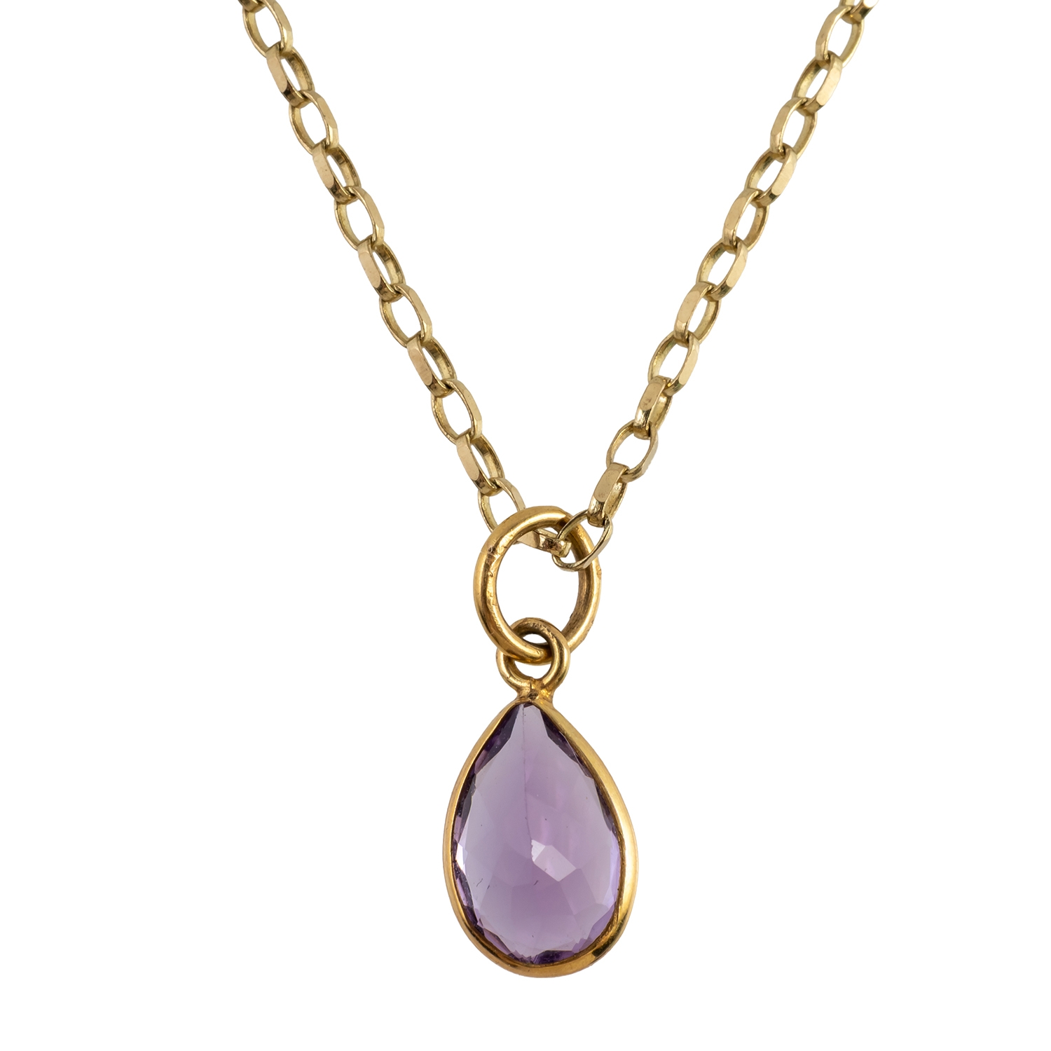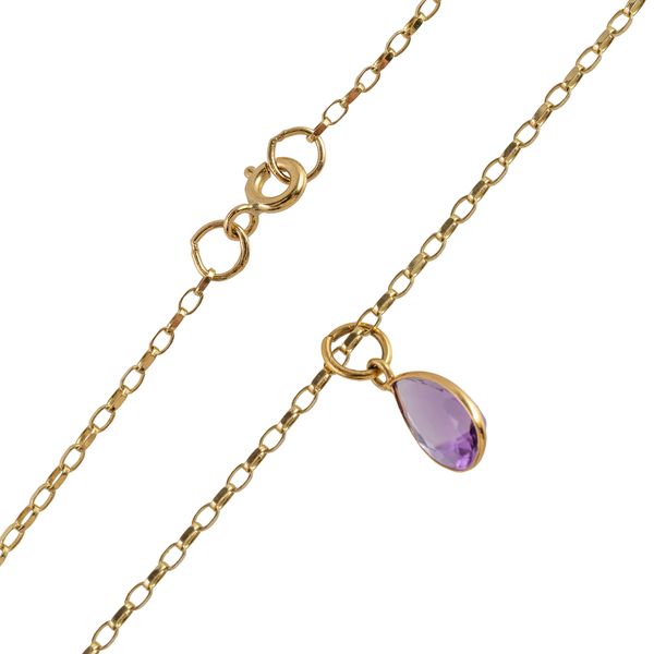 With a pear cut amethyst in a bezel setting, on an oval cut belcher chain with a bolt ring clasp, measuring 40cm in length, gross weight 2 grams