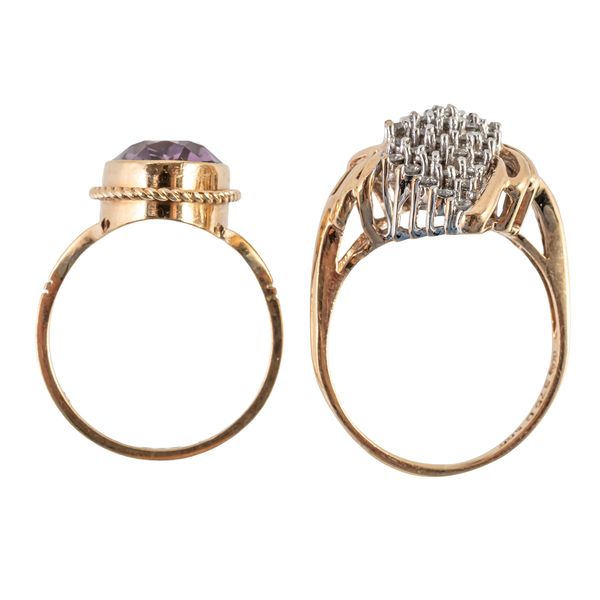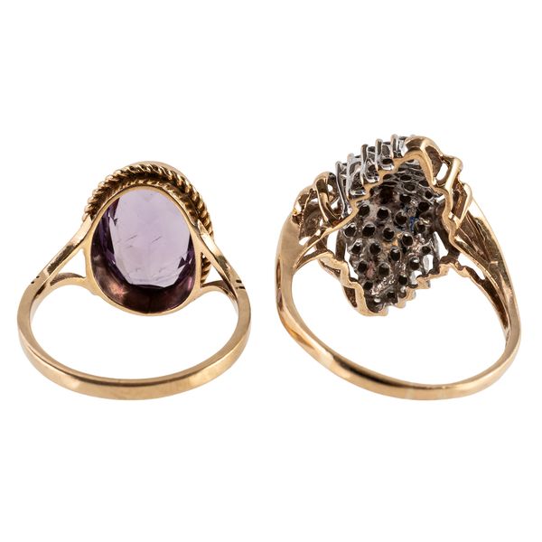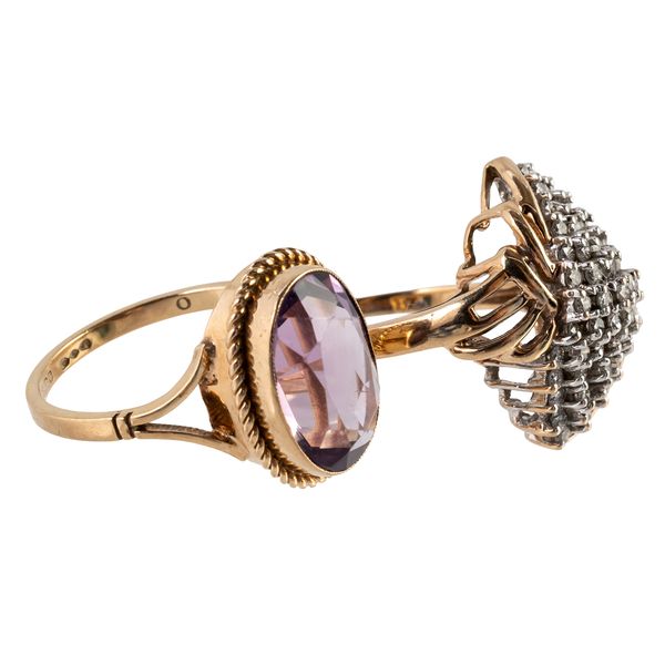 Comprising; a diamond ring, in a twistover marquise shaped cluster design, between pierced shoulders, detailed 375, ring size T and an amethyst single stone ring, collet set with an oval cut amethyst, within a ropetwist wirework surround, between split shoulders, Birmingham 1968, ring size Q, combined gross weight 9.3 grams